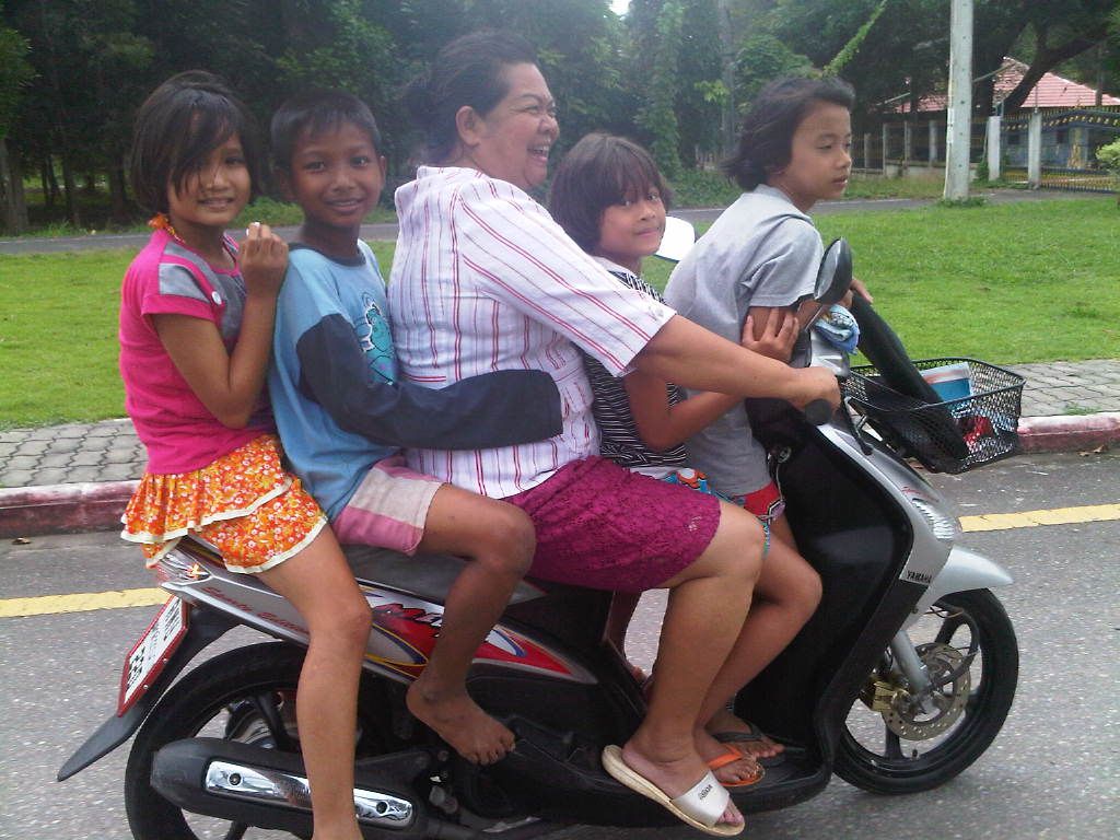 A young Thai woman did indeed appear…on a moped. Or ‘scooter’ of you prefer. Motorised bike. She also had a child with her on the back. She told me to ‘saddle up’ despite the obvious overpopulation issue along with my various bags. Let's give it a go I thought. The little girl that was with the older girl stood on the front and I sat on the back and off we scooted…