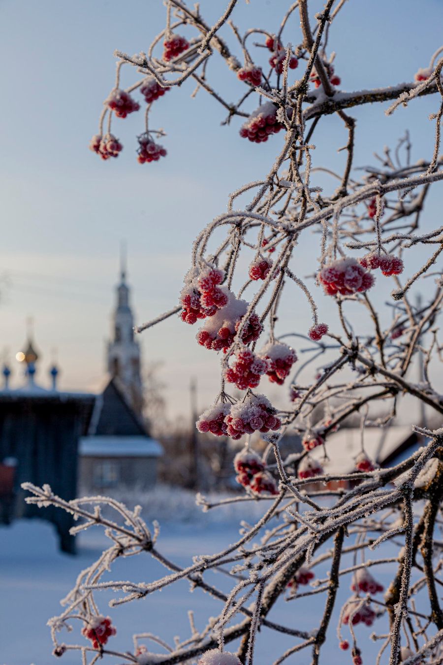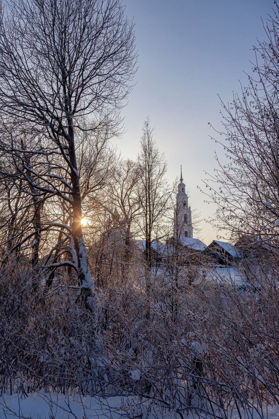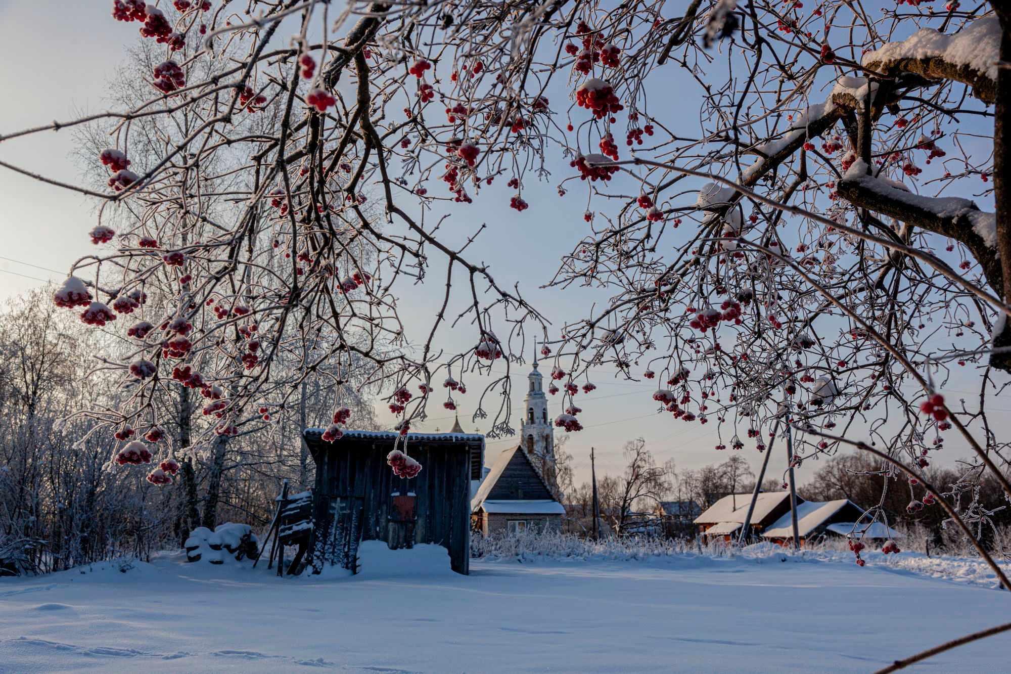 The village of Teterinskoe is one of such places. There is a deep picturesque ravine. There is a beautiful high bell tower with history. There are beautiful wooden houses and trees with red berries, which are very good against the background of snow.