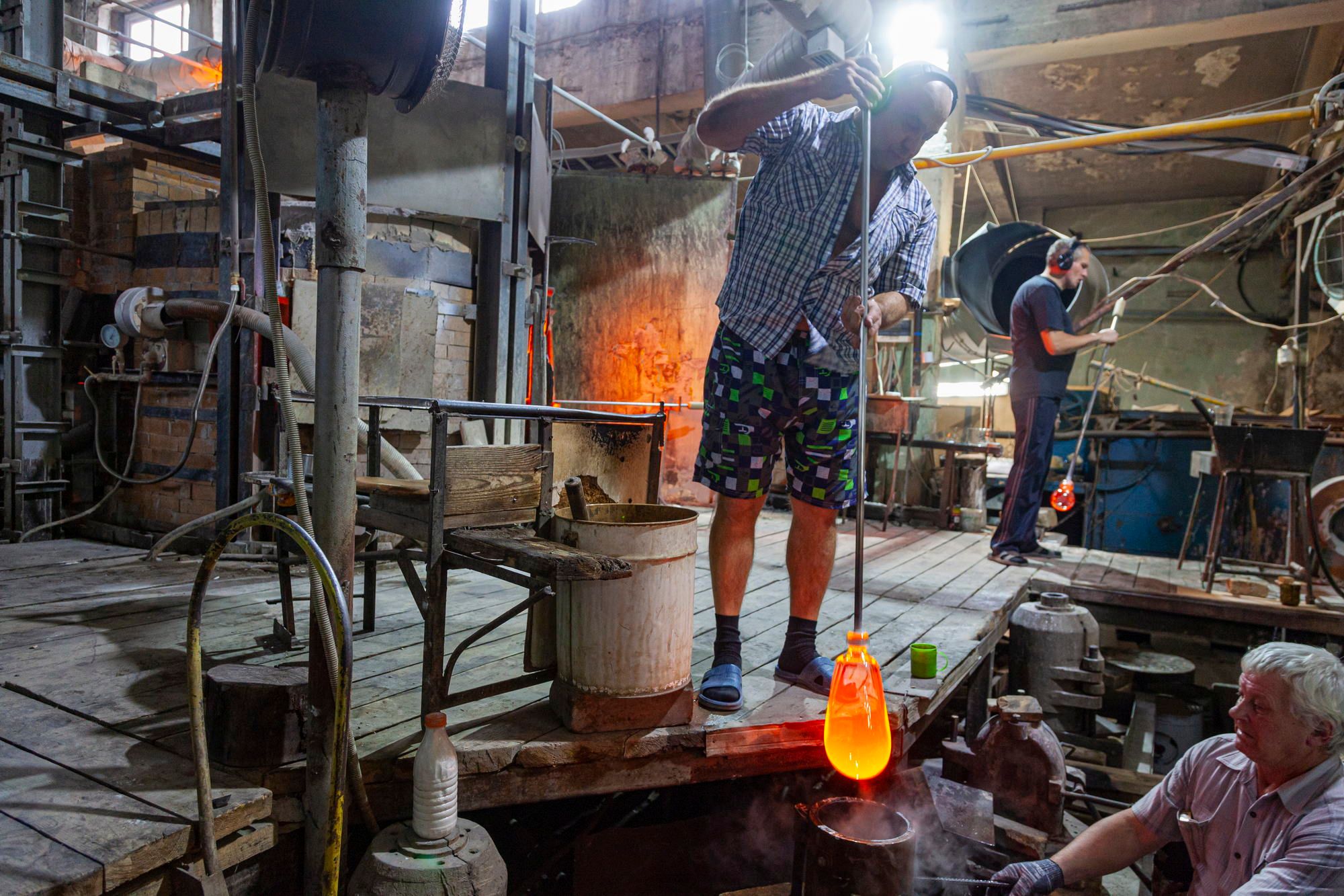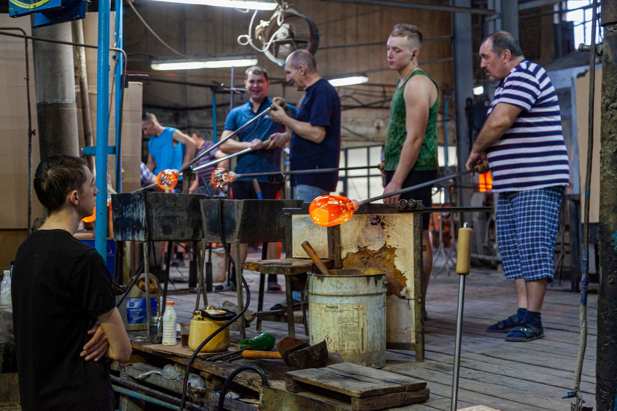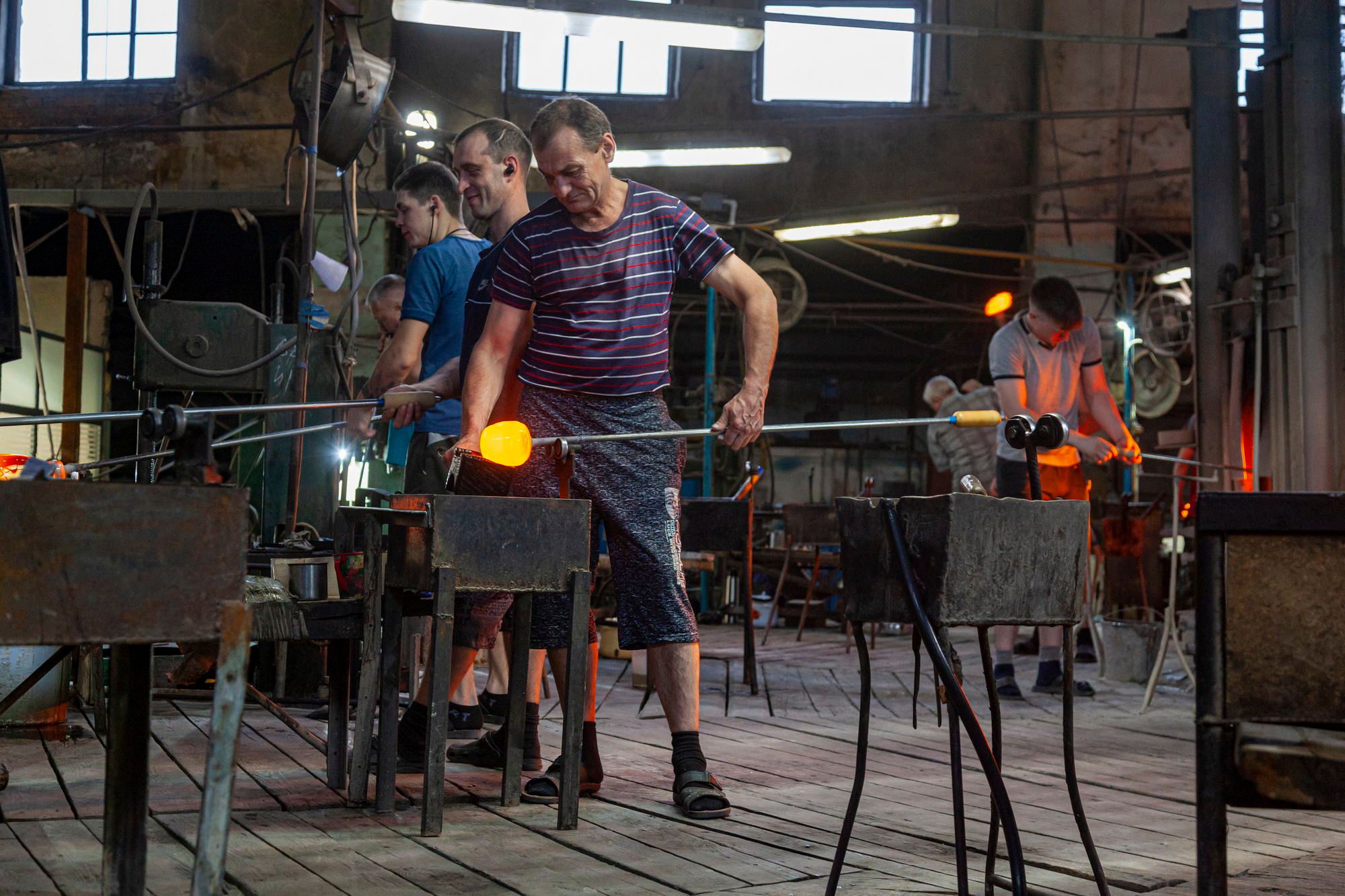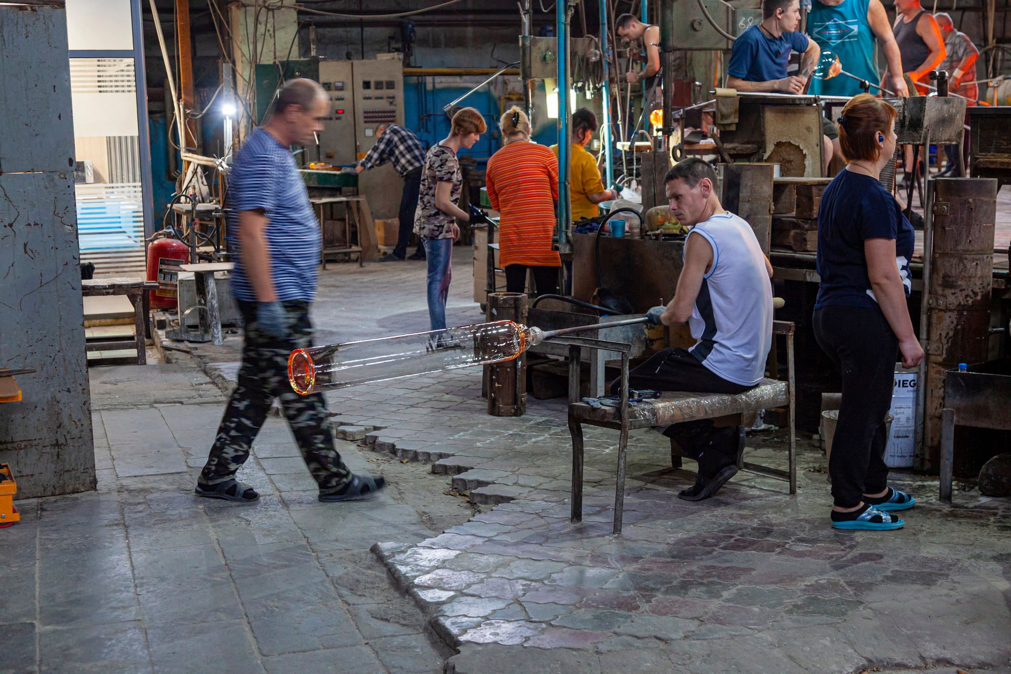 The entire floor is strewn with broken glass. The glassblowers themselves look very colorful. In their own clothes, they look less like factory workers and more like mountain dwarves who mine gemstones.