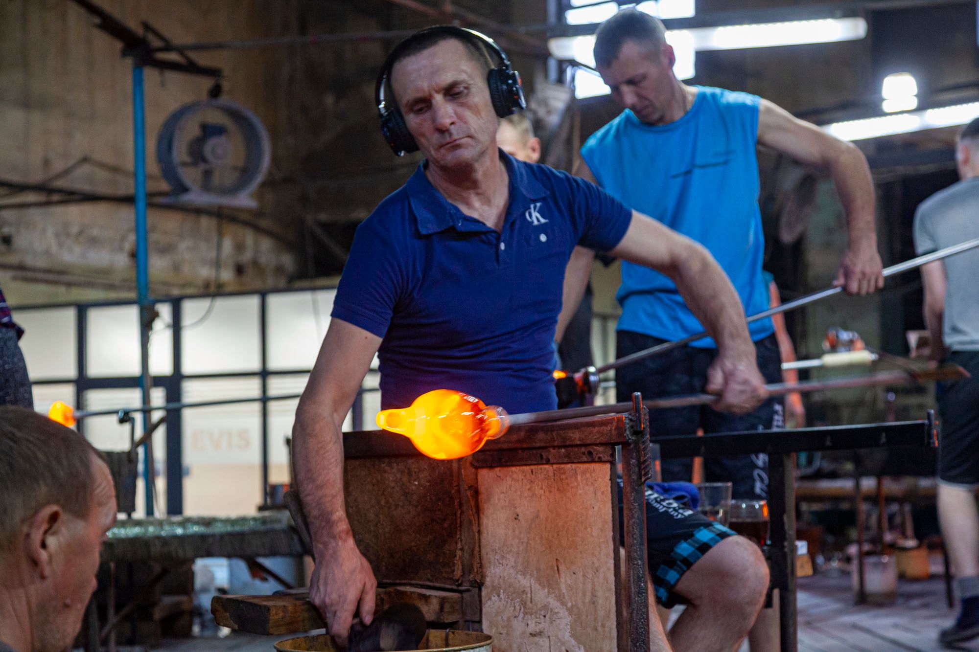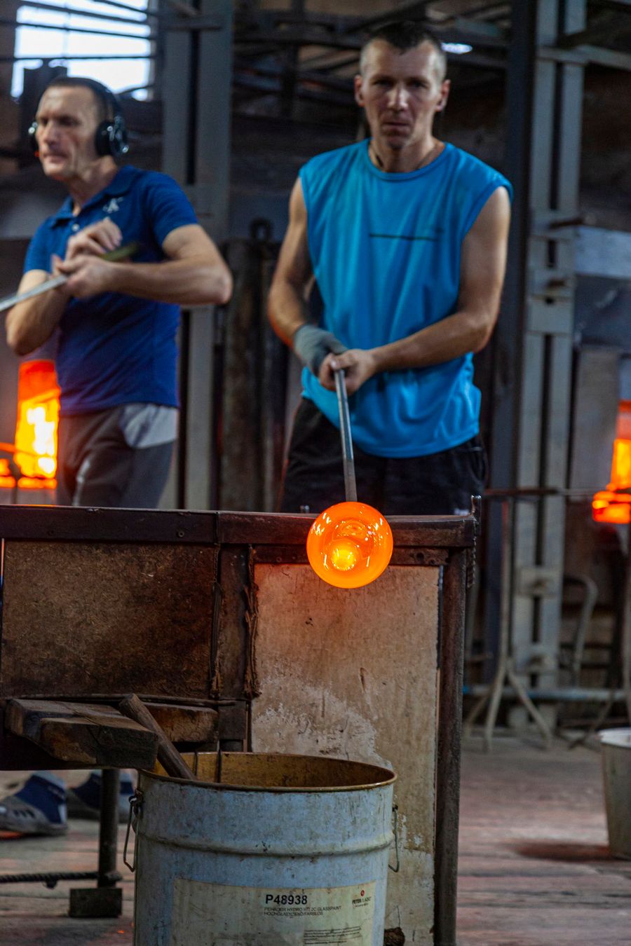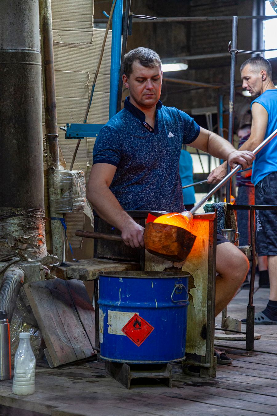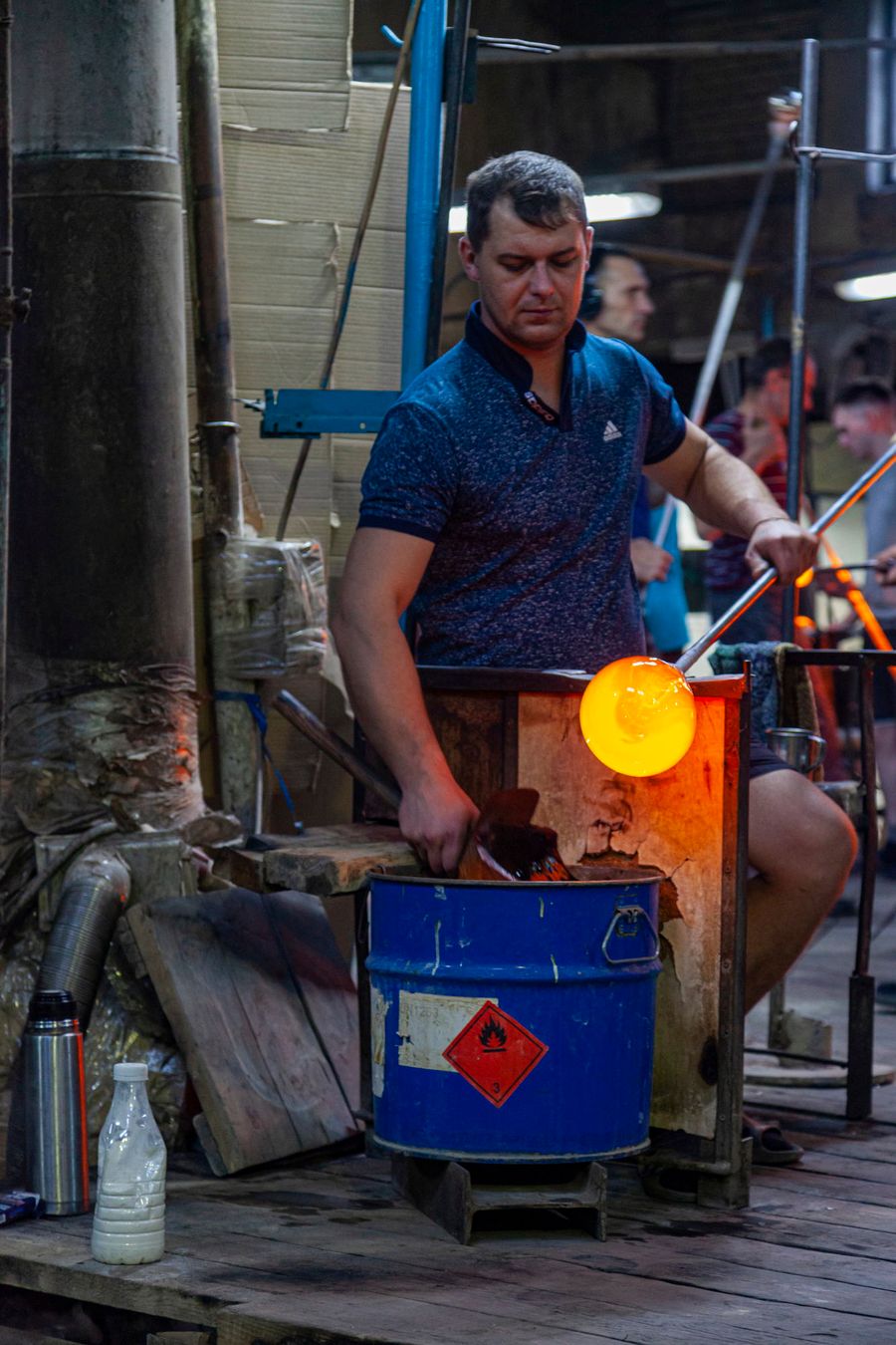 The entire floor is strewn with broken glass. The glassblowers themselves look very colorful. In their own clothes, they look less like factory workers and more like mountain dwarves who mine gemstones.