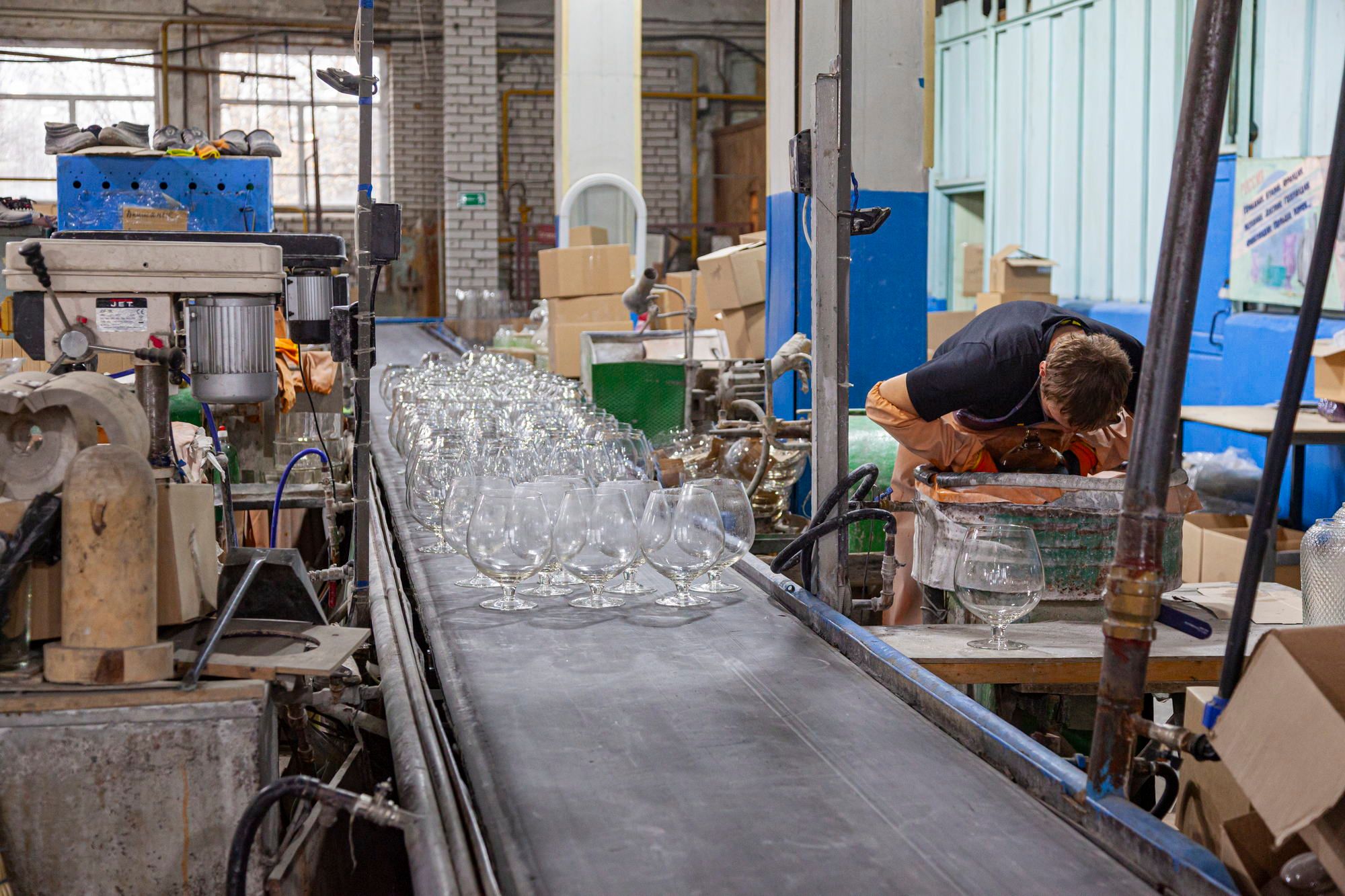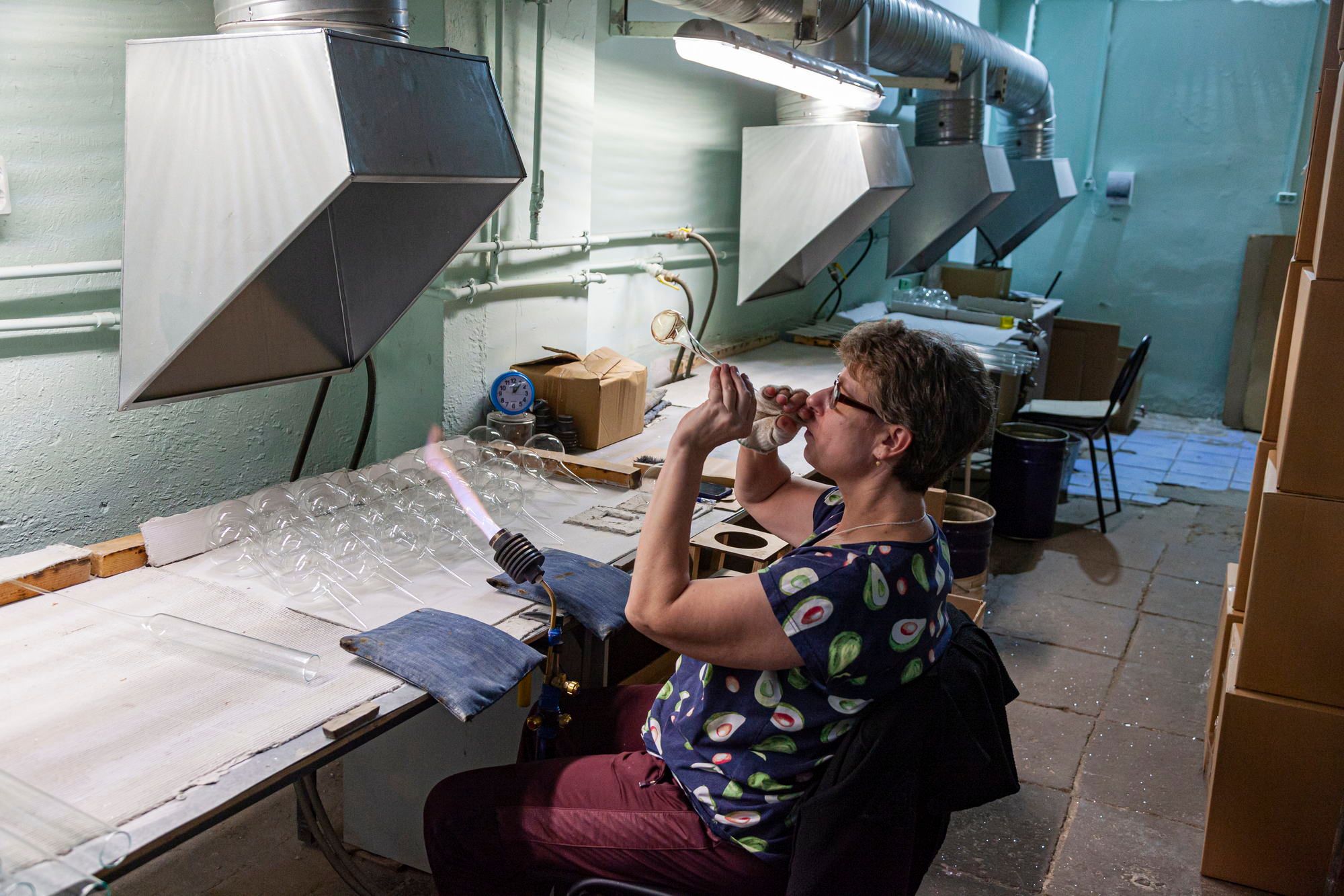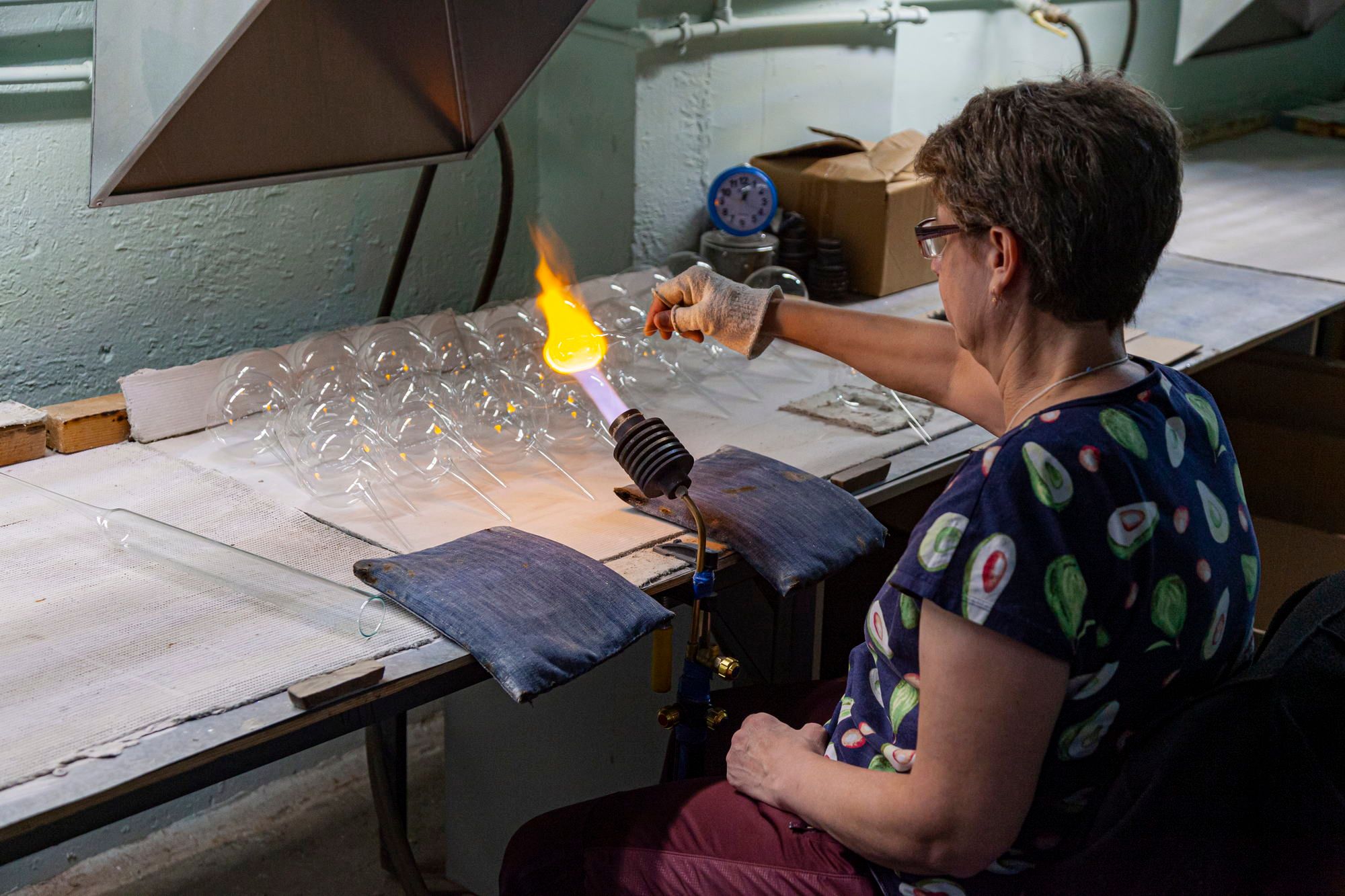 I saw with my own eyes how glass is heated to a liquid state in a huge furnace and a shape is blown out of this glass through a special pipe. It can be a glass or a decanter or something else.