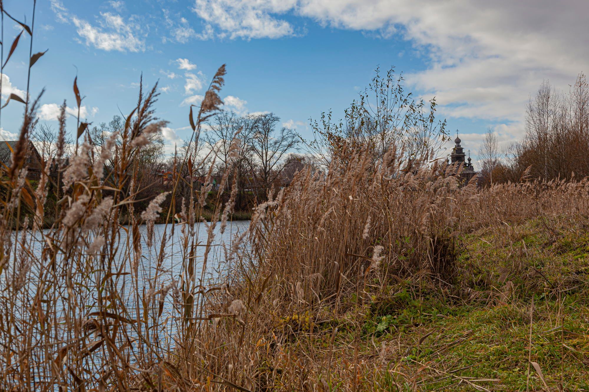 These meadows are overgrown with grasses. In the fall, these tall grasses are all yellow and look very pretty as they sway in the breeze. And along the banks of the river there are many wild apple trees strewn with red fruits. This is very impressive, since there are almost no leaves on the trees.