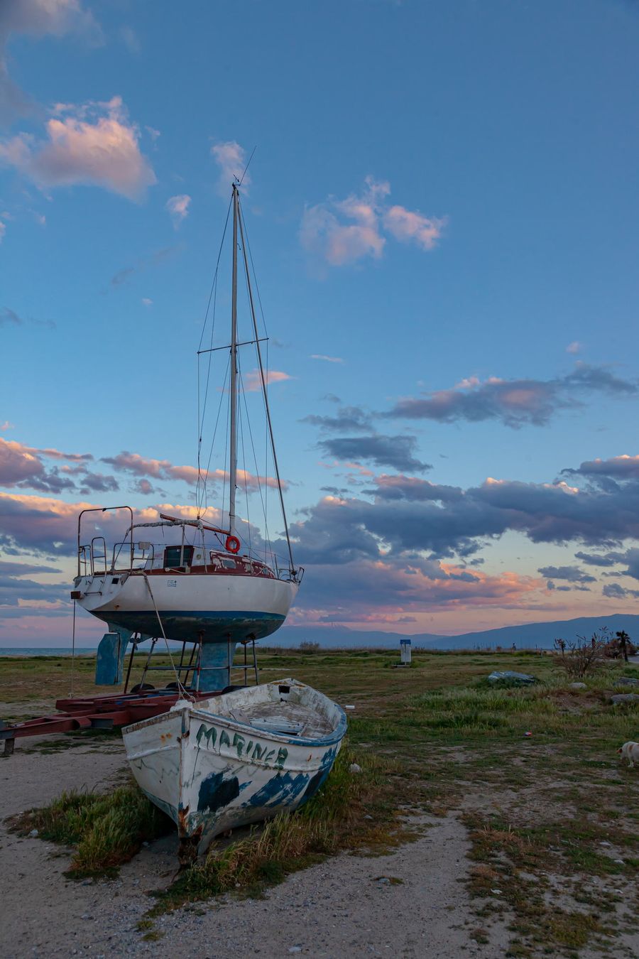 In addition to those boats that are on the water in the port, there are several other boats that are on land. They look very majestic against the backdrop of the sunset and distant mountains.