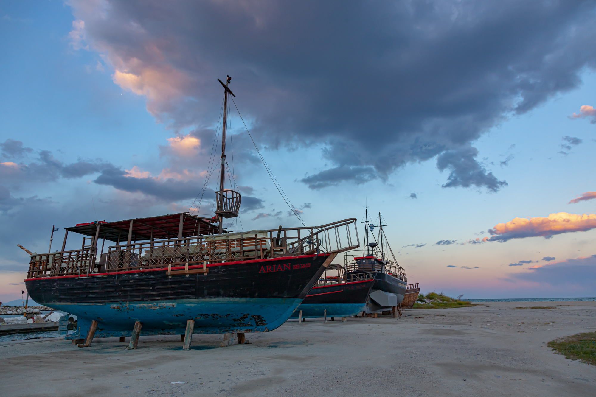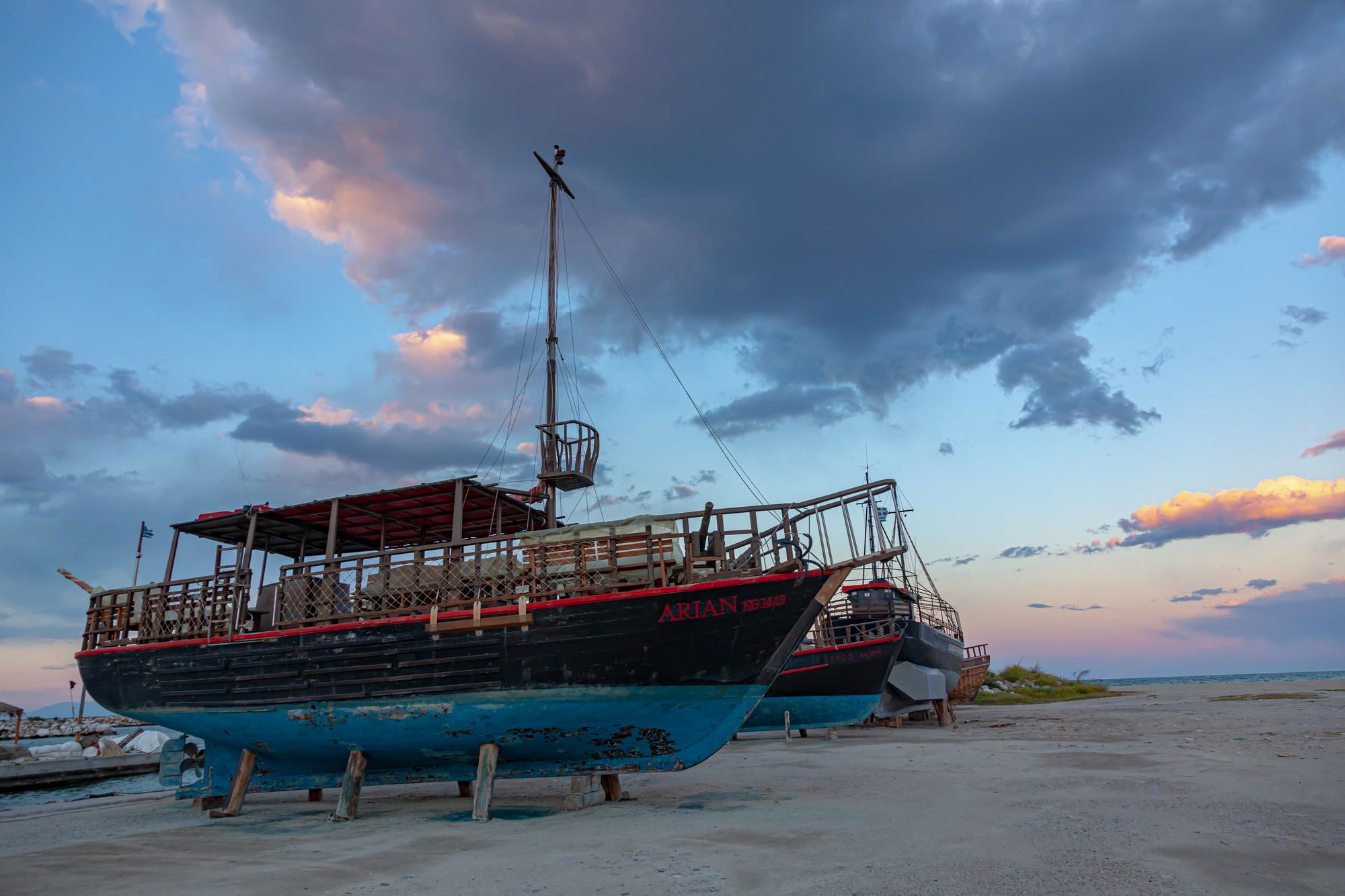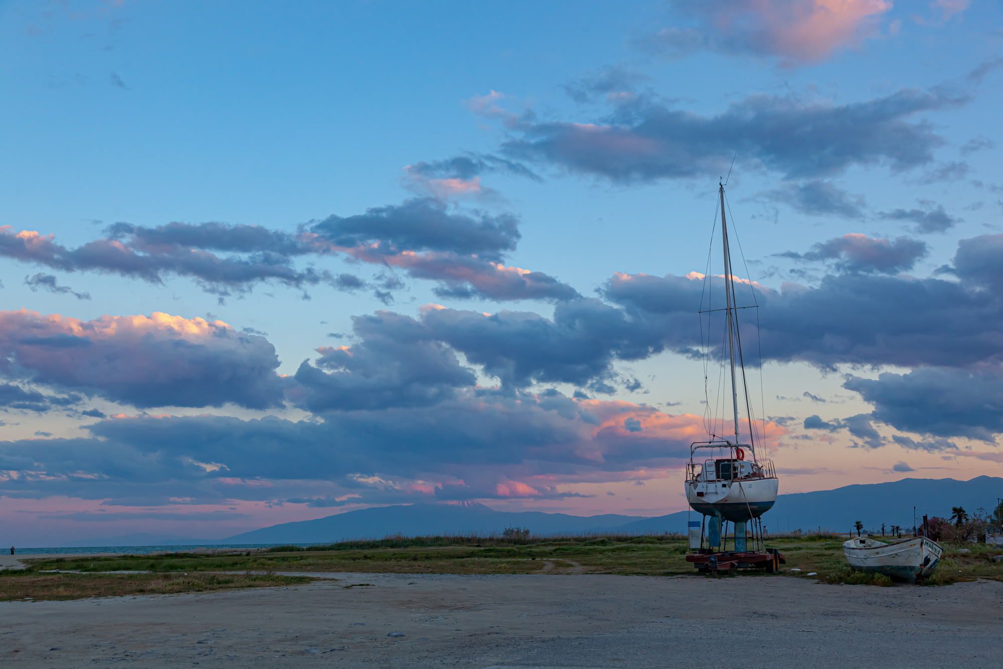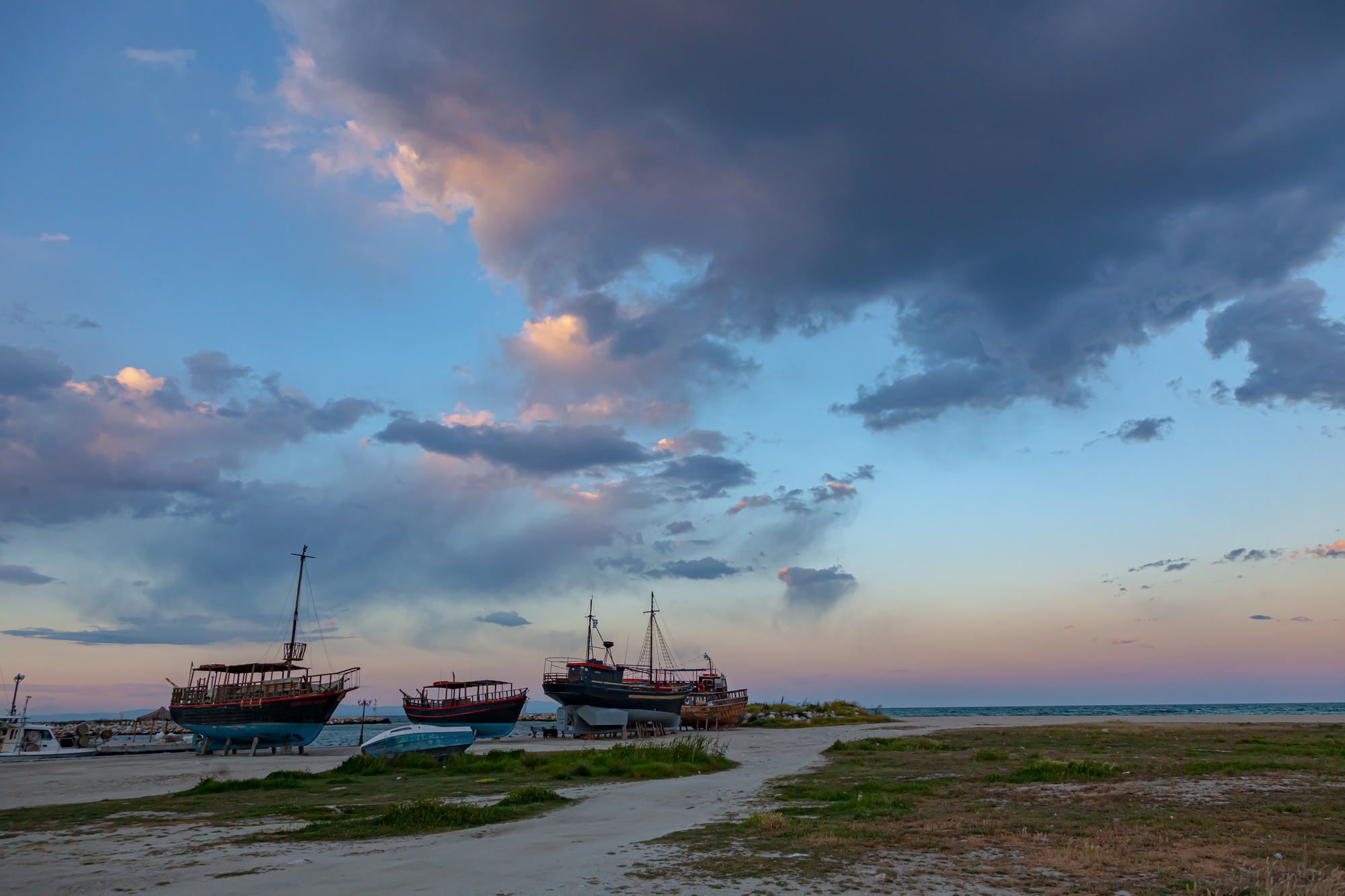 The clouds in the sky have turned purple and pink. Against the background of these clouds, it has become so spectacular to look at the boats standing on the shore. They look like some kind of prehistoric creatures that are about to stand on their long legs and go on a long hike.