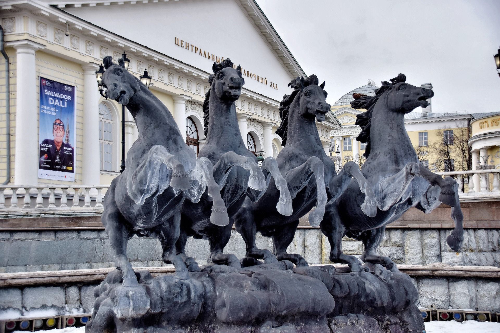 I spent my last weekend visiting my daughter, who lives in a city near Moscow. Our plan was to visit the exhibition of Salvador Dali in the Central Exhibition Hall (Manege), but when we arrived at Manezh Square, we realized that we need to reconsider our plans. Why? Because someone really likes to sleep in the morning. There was a very large queue in the Exhibition Hall. Even the horses laughed at us.