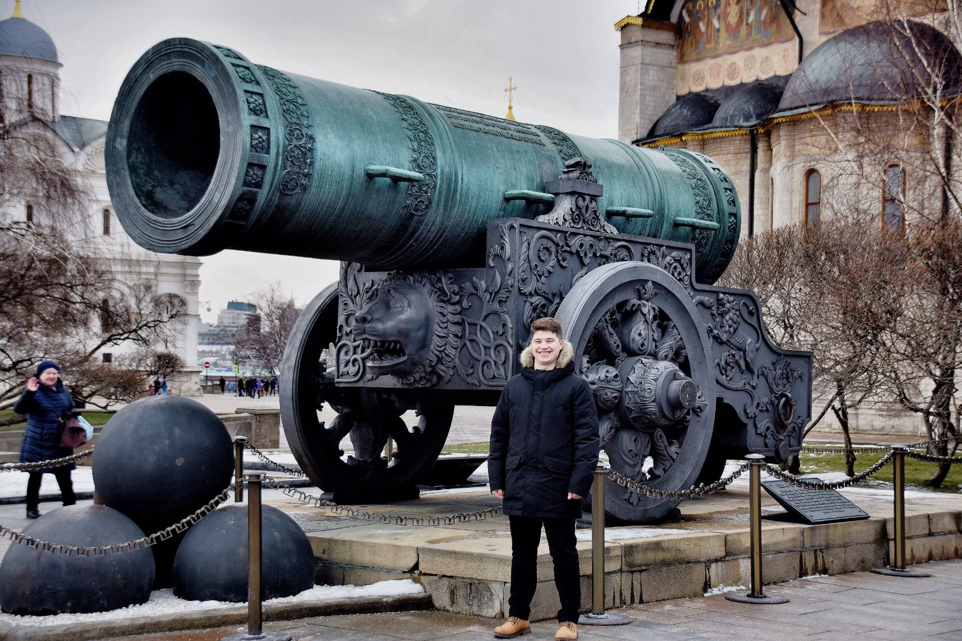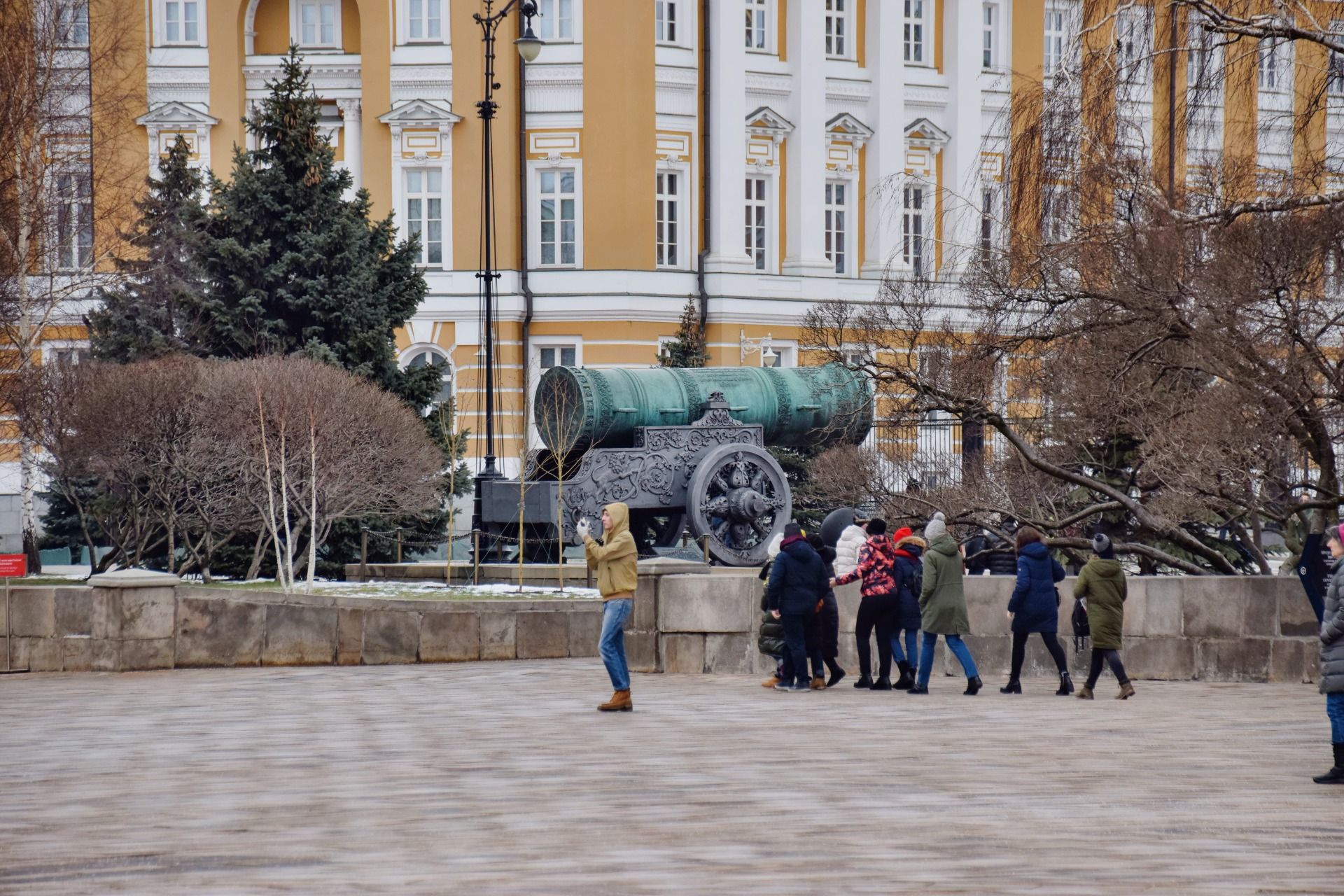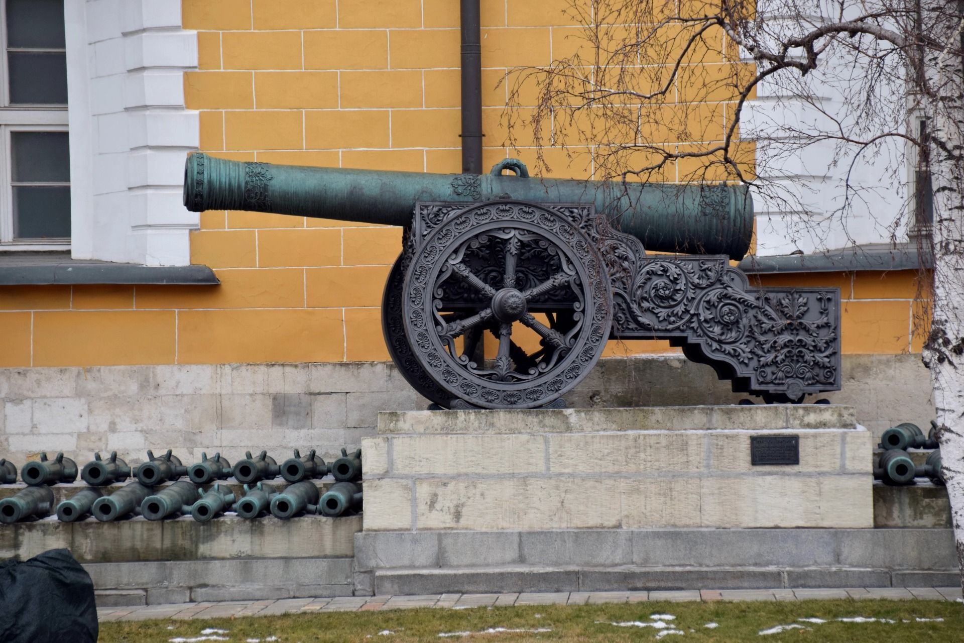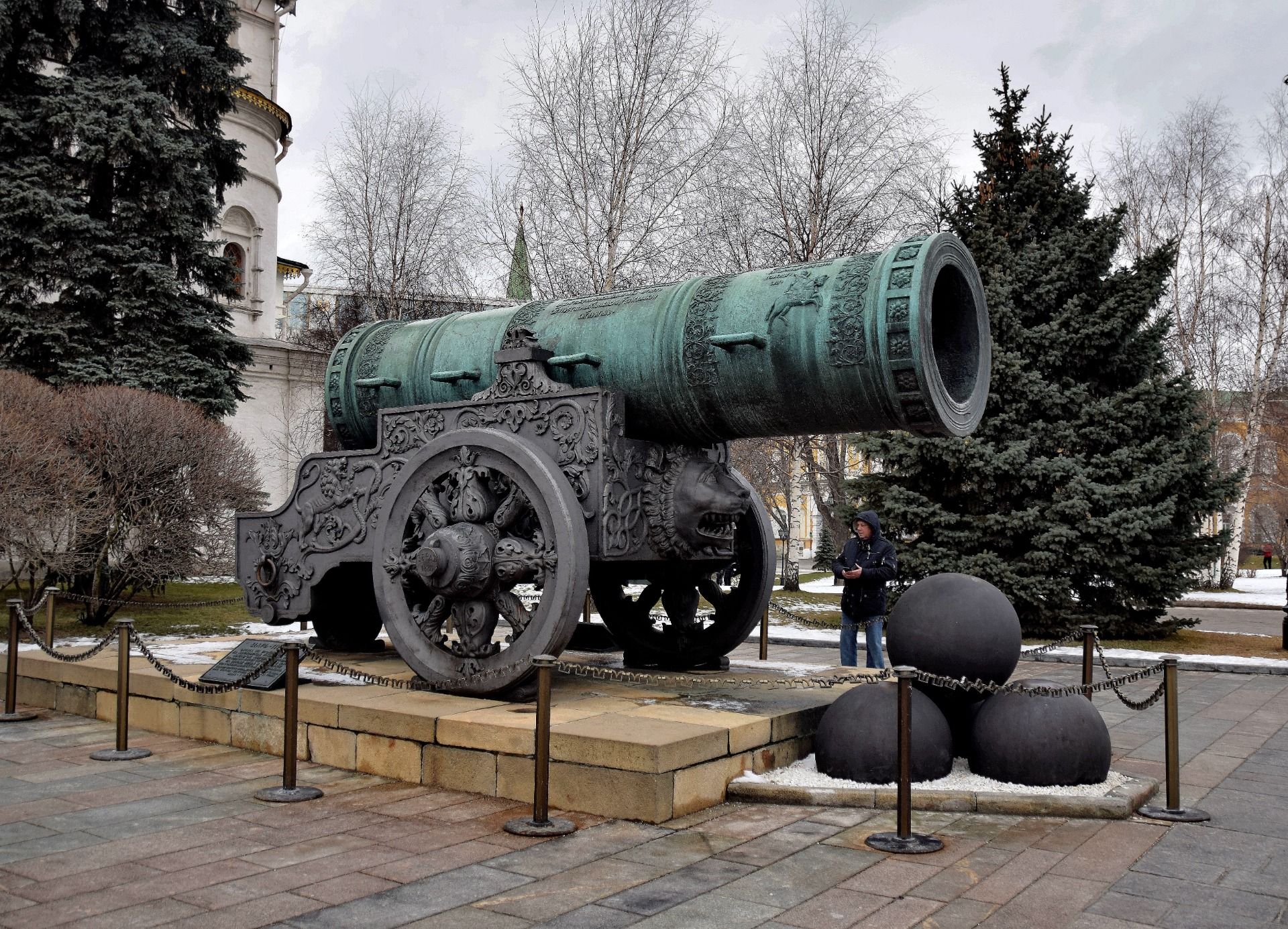 The first thing we did was go to the Tsar-Cannon. This is a giant cannon that did not fire a single shot, a masterpiece of heavy fortress artillery of its time. The gun itself was cast in 1586, and the carriage and decorative cores were cast much later in 1859.