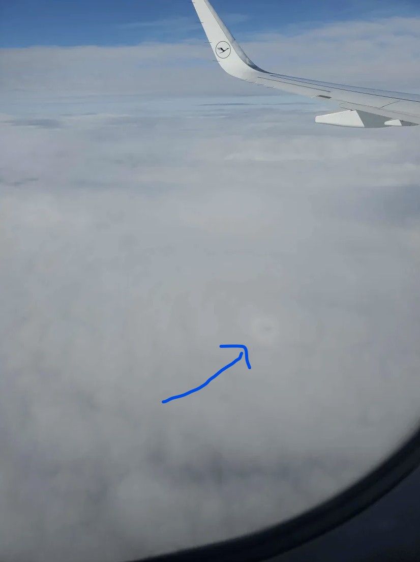 - The sun glancing off the plane (possibly one of the windows) actually cast a reflection on the cloud tops, much like when you have a glass prism reflecting while hanging in a window. It reminded me of a sun dog [ https://www.skyatnightmagazine.com/space-science/sun-dogs ], if you've ever seen one of those. They're pretty cool.