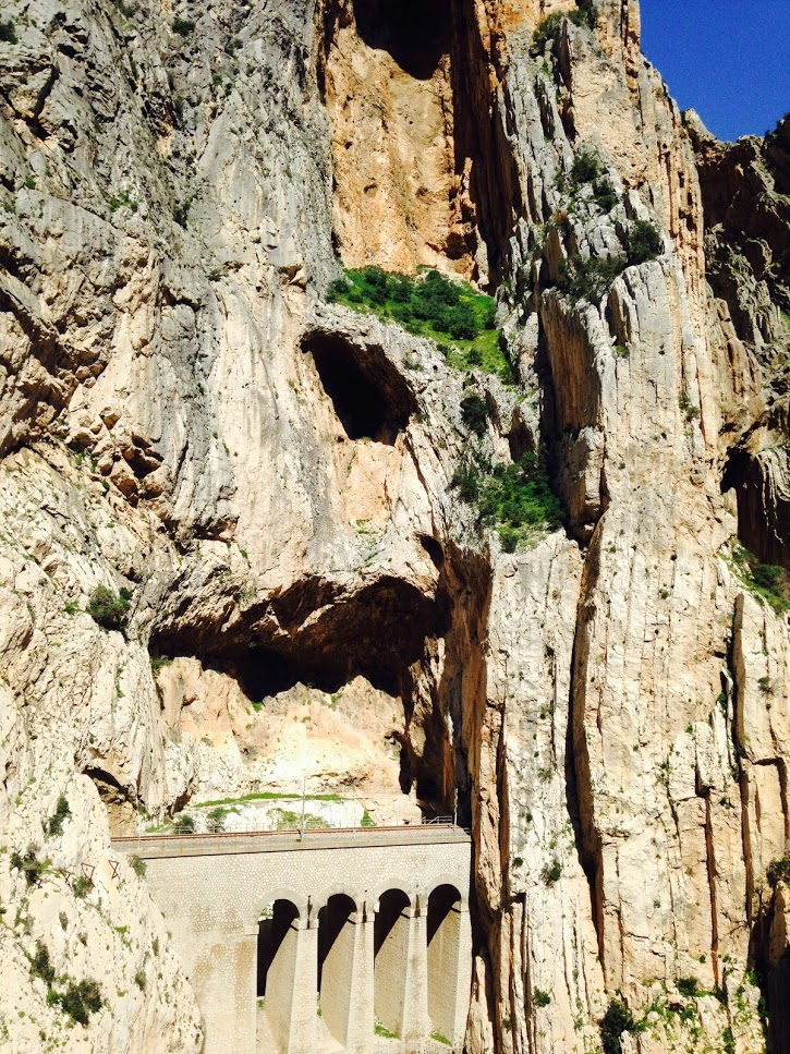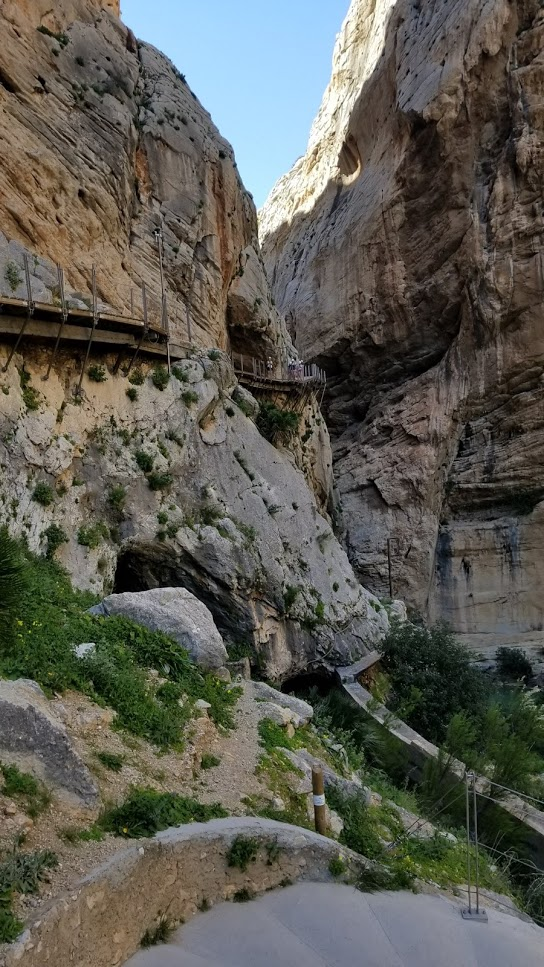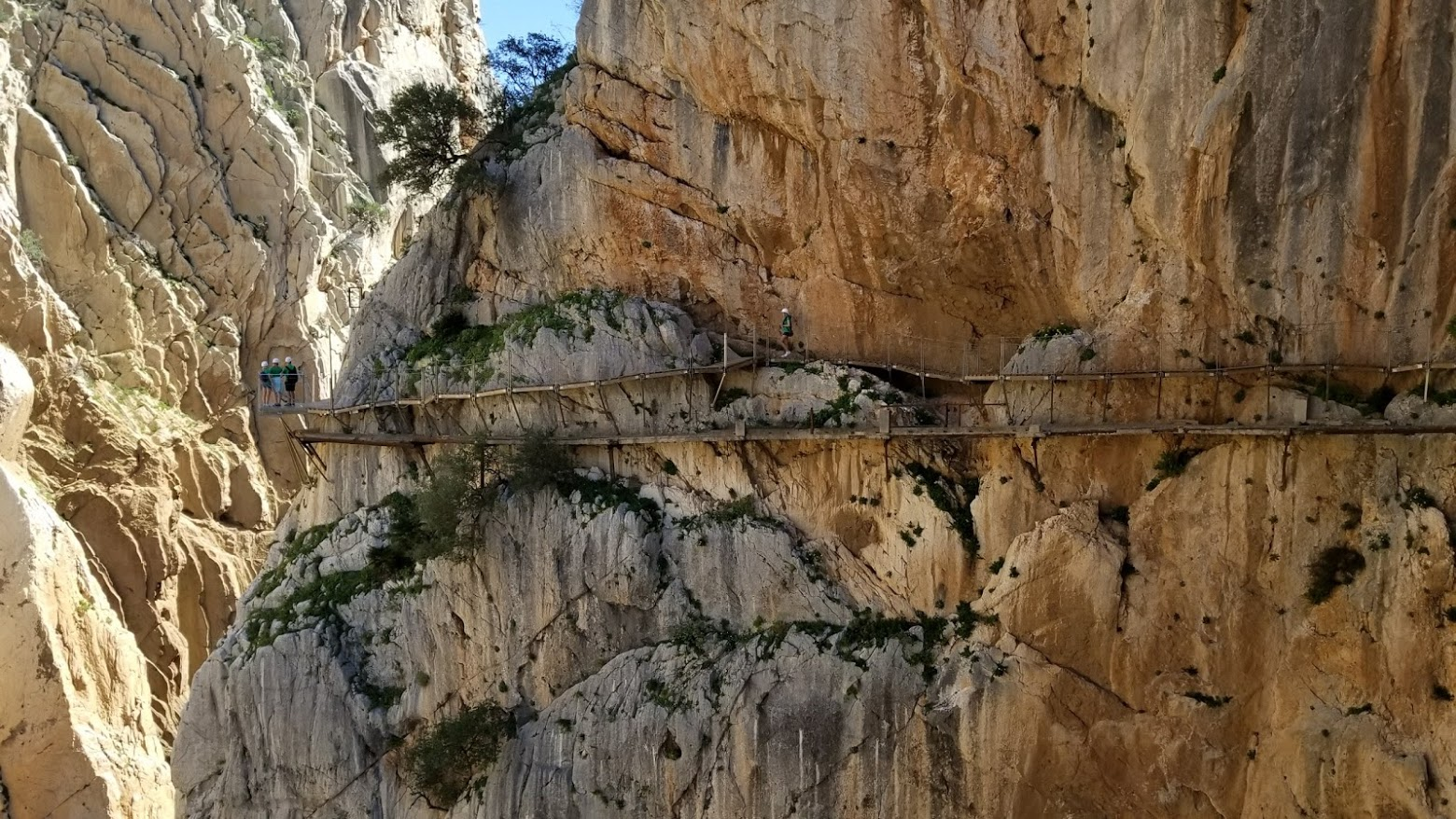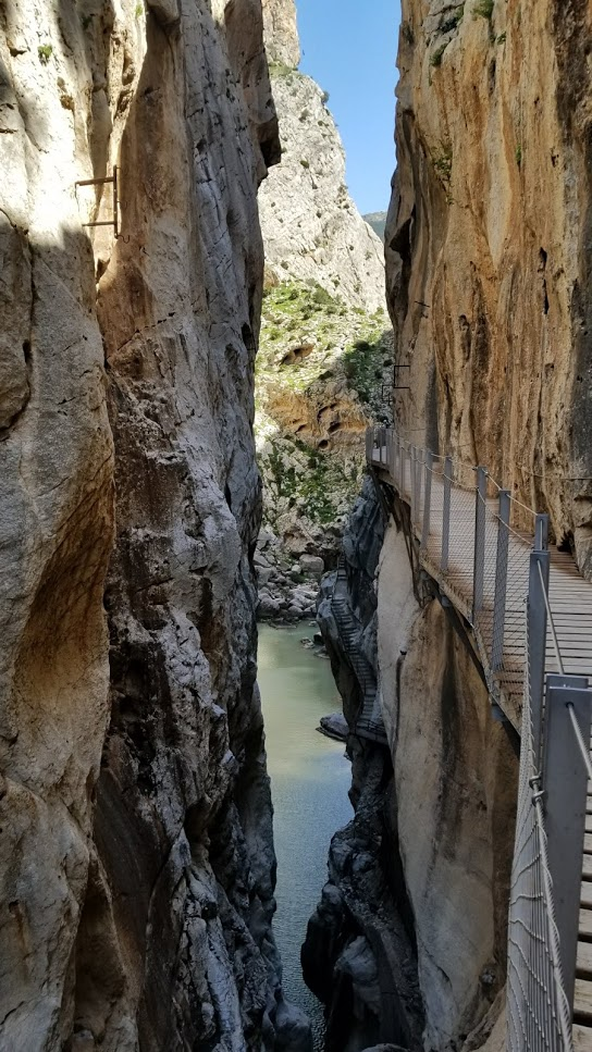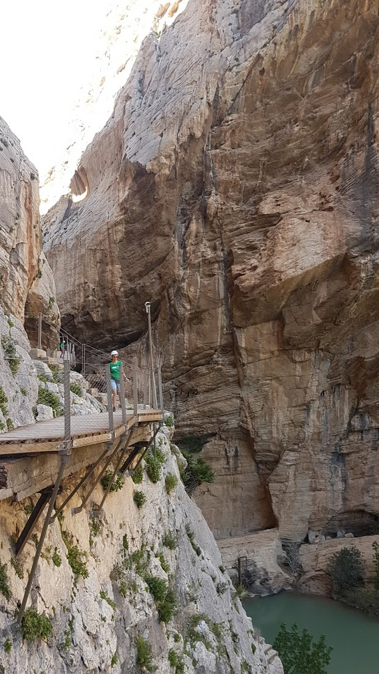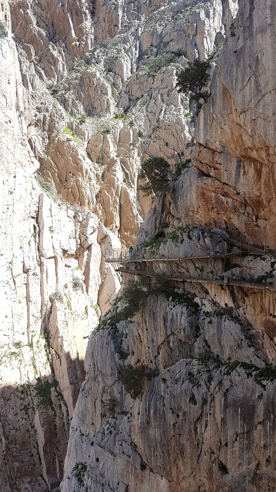 Pod koniec ścieżki znajduje się jeden z bardziej widowiskowych punktów - przejście pomiędzy dwoma przeciwległymi ścianami wąwozu Desfiladero de los Gaitanes. To wznoszący się wysoko ponad kanionem metalowy, wiszący most - Puente Colgante. Przejście nim to spore wyzwanie dla osób mających lęk wysokości, zwłaszcza, że w tym miejscu potrafi niemiłosiernie wiać. Kiedy my przechodziliśmy przez most, miałam wrażenie, jakby bujało nim na boki.