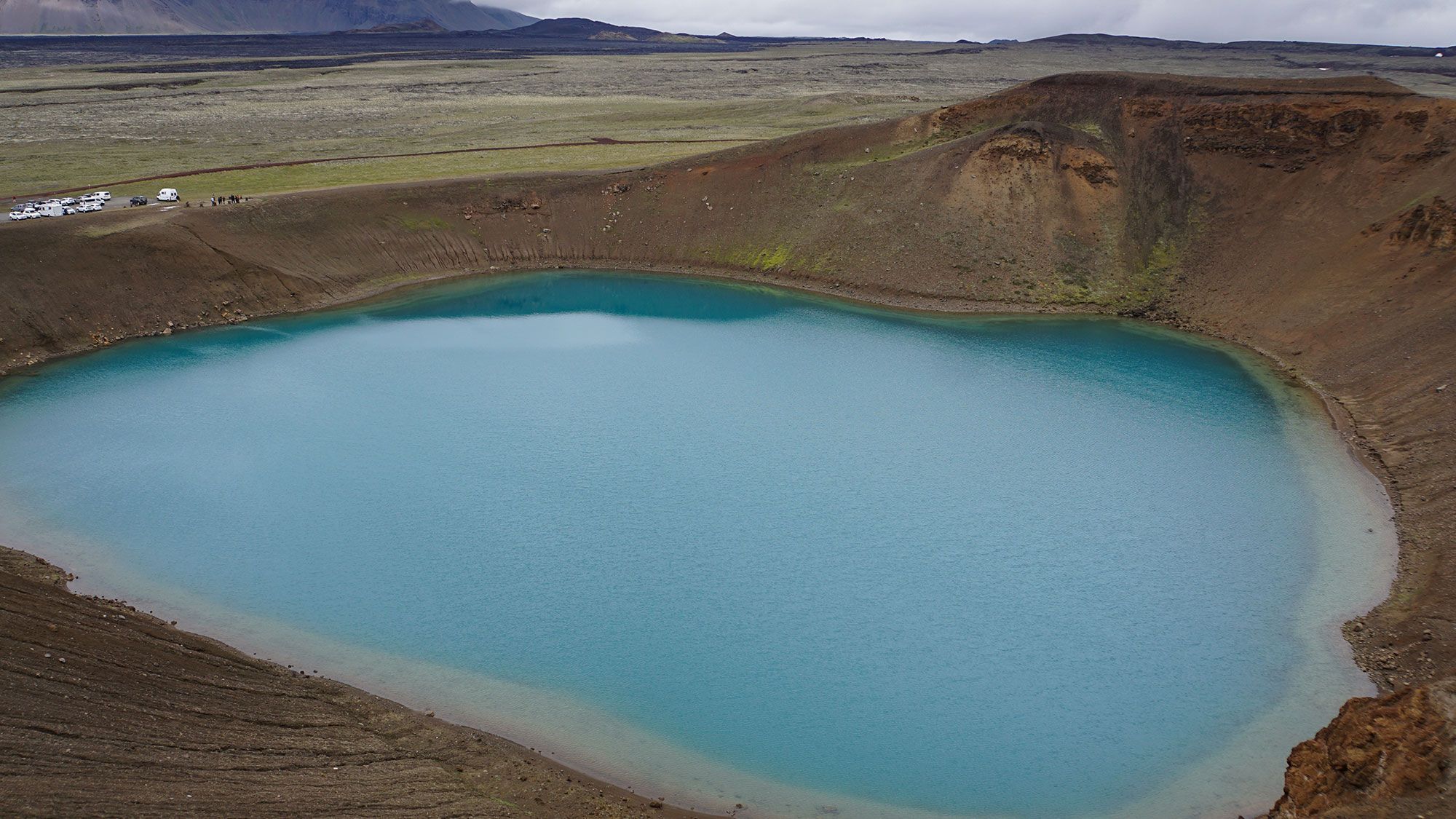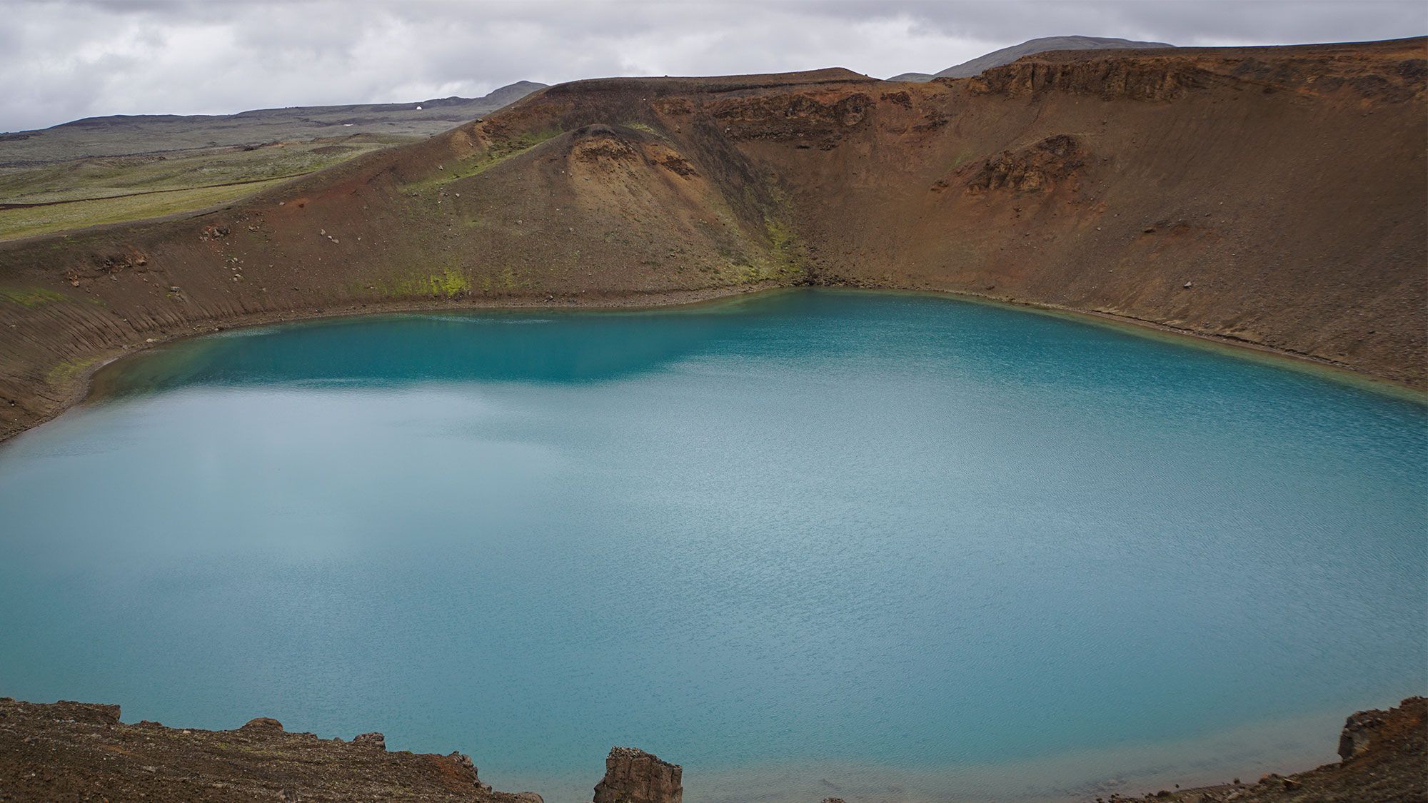 One of the most photogenic spots here is the Víti crater. Its name, which means “hell” in Icelandic, was given after a powerful eruption in the 18th century that lasted five years. Today, Víti is calm, and its bottom is filled with water a remarkable shade of azure. The color comes from a high content of silica and other minerals. There’s a path around the crater’s edge, and the water’s color pairs beautifully with the raw, almost lunar surroundings.