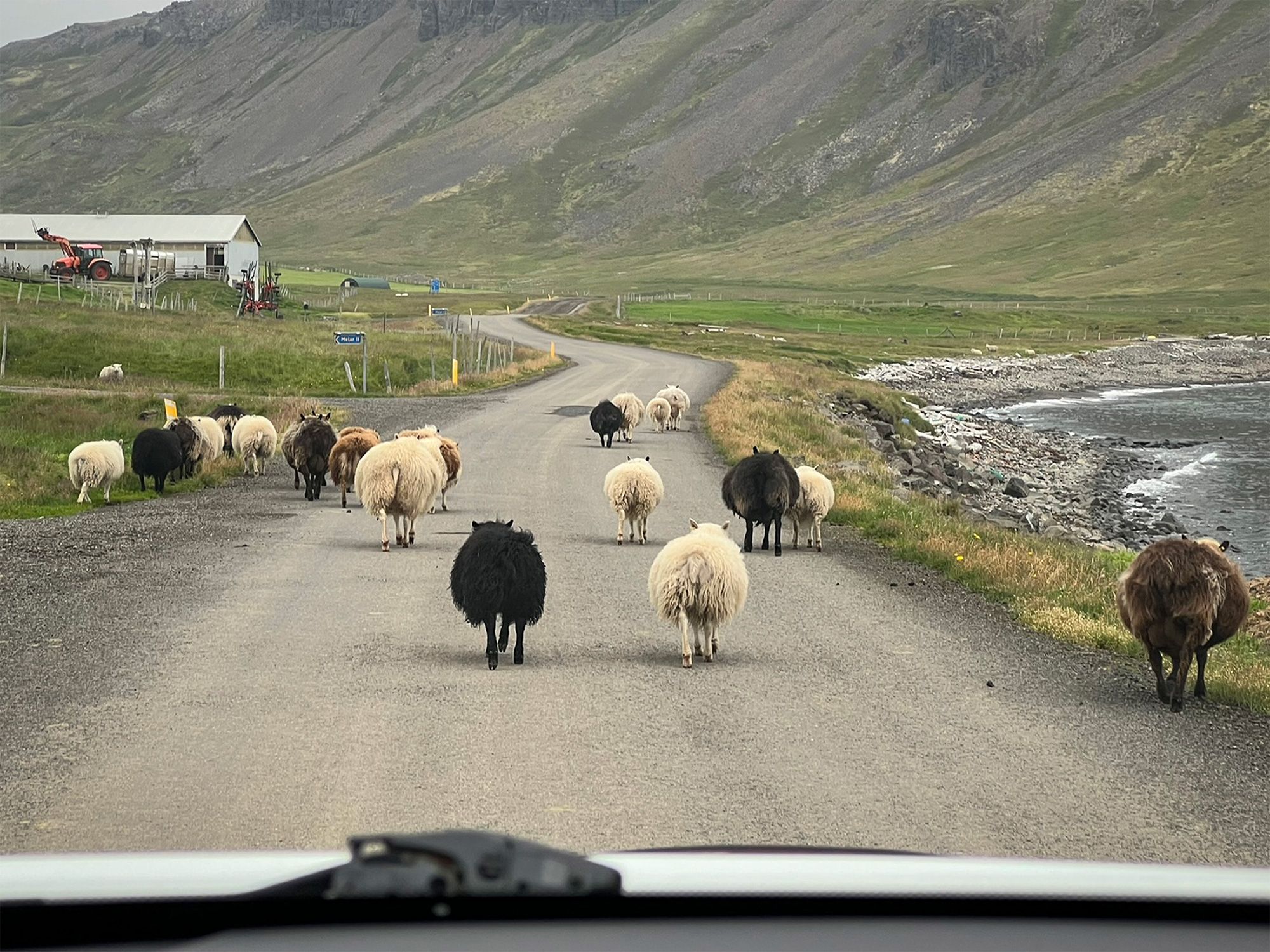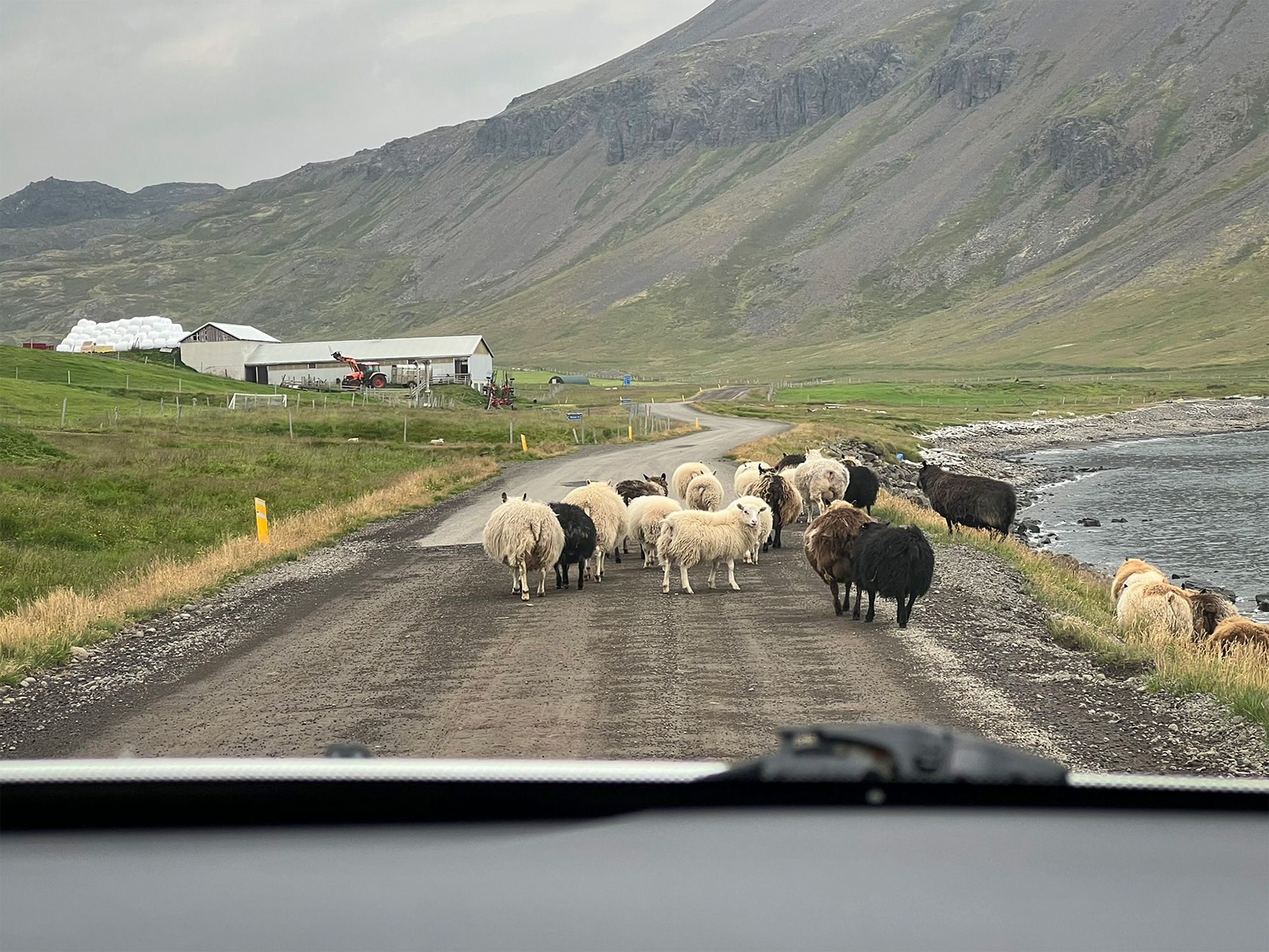 When we finished the walk, it started to rain a bit, but we stuck to the plan. The next goal was an abandoned factory by the next fjord. To get there, we had to drive through the mountains. But first we had to get out of a local sheep jam ;) Suddenly, they all decided they wanted to go for a walk. This is one of the most common sights on Icelandic roads.