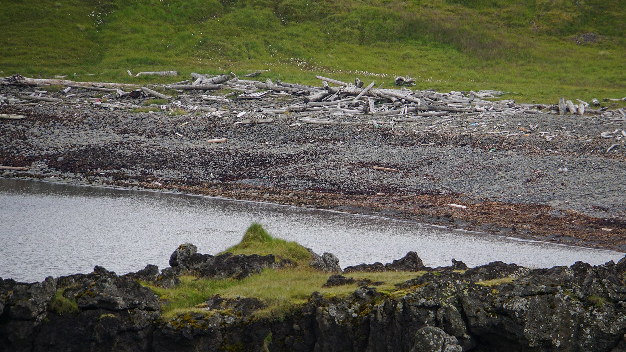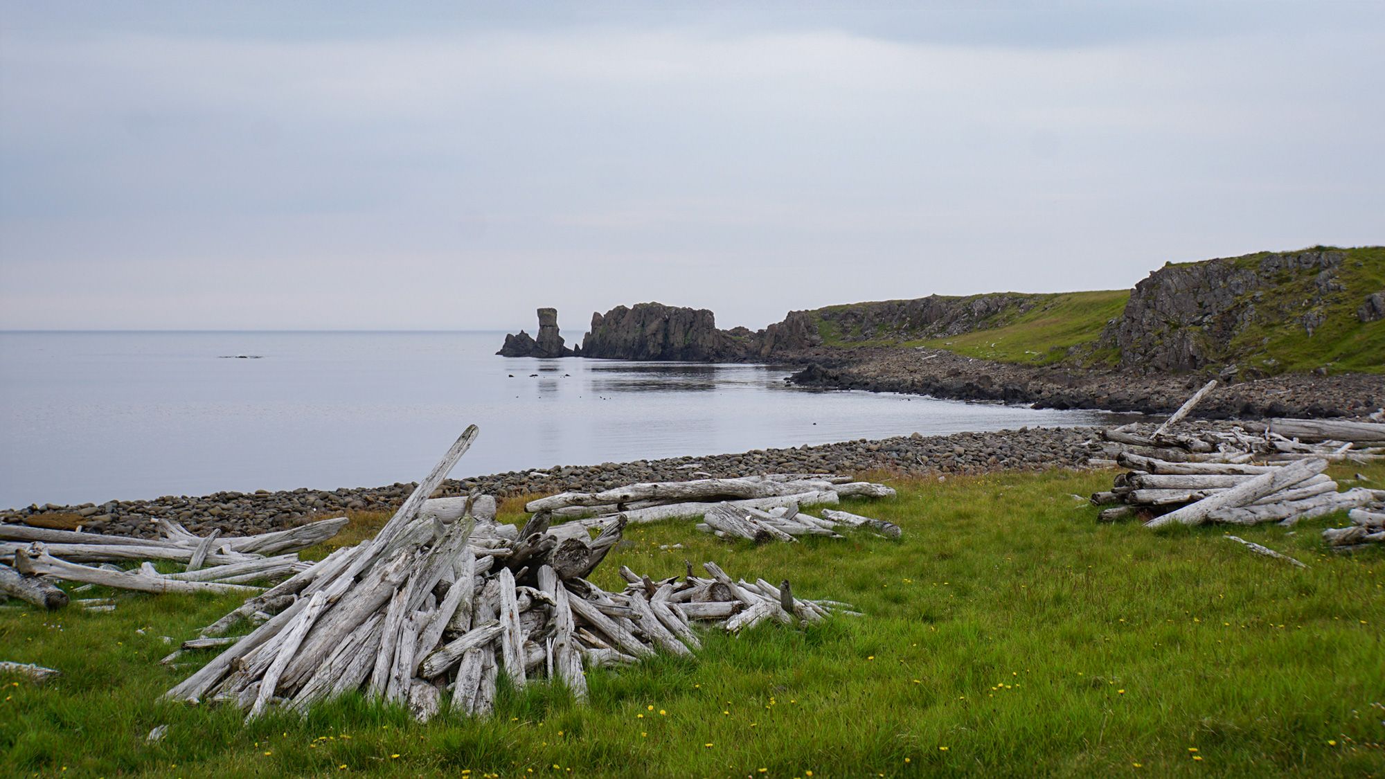 While we were there, we also walked around the nearby area for a while. Both here and the day before, when I was driving along the coast, I noticed large amounts of wood washed up on the shore. Some of it lay in a mess, and some logs were stacked in piles.