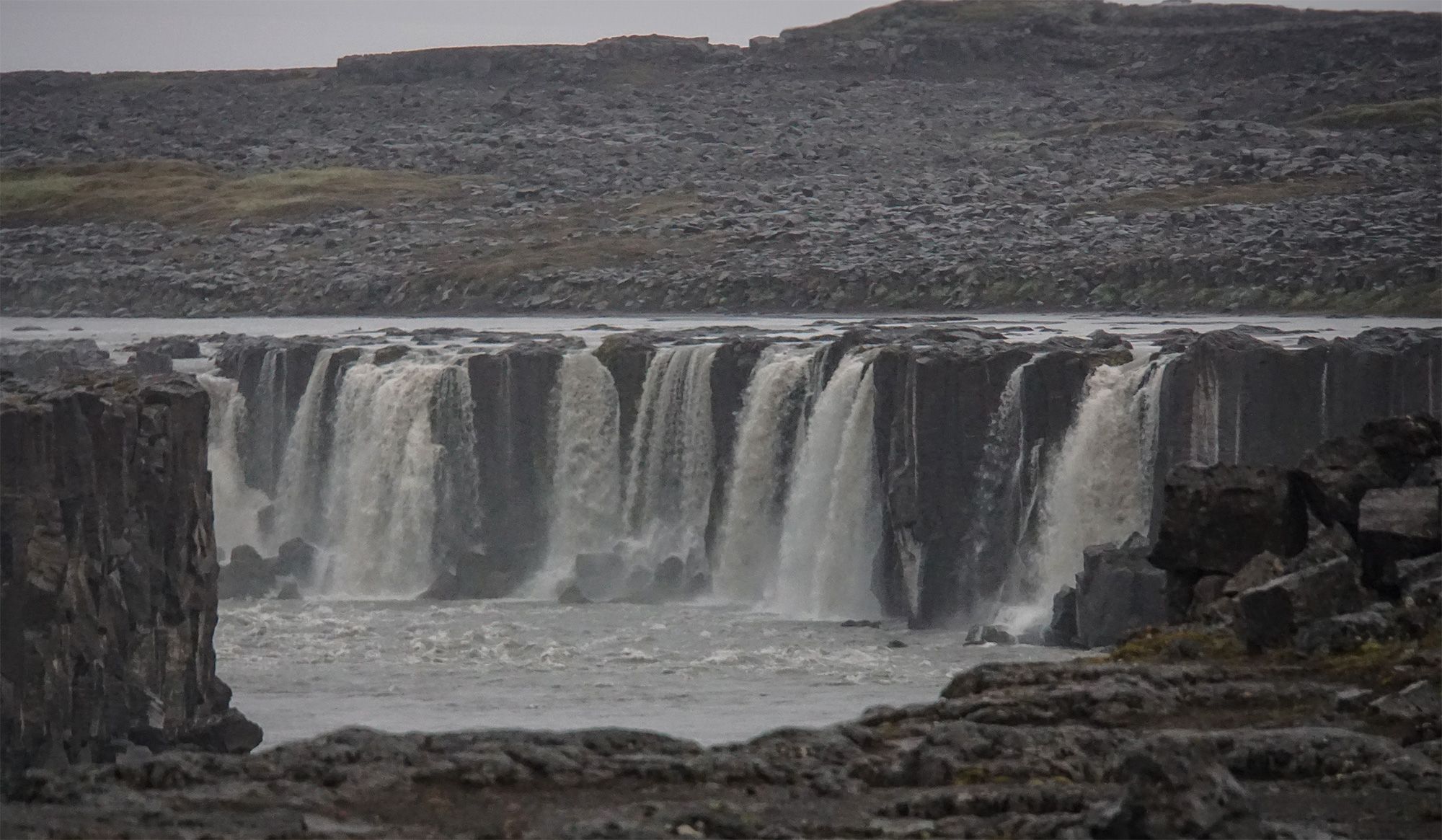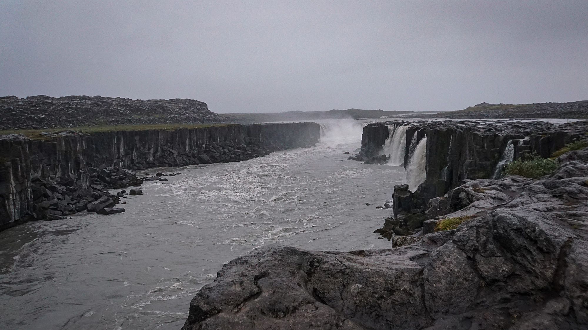 Our last stop before spending the night by Lake Mývatn was Dettifoss waterfall. It’s one of Iceland’s most majestic waterfalls. I had seen it briefly five years earlier, and that short visit left me wanting more. This time, we arrived in a heavy downpour. As we got out of the car, putting on every raincoat we had, the last tourists were leaving. So we almost had the usually crowded waterfall all to ourselves. We only met one family there.