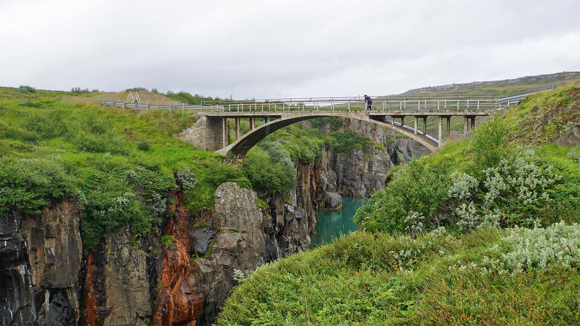 Then we continued northwest. We made a few unplanned stops – it’s impossible to drive through Iceland without stopping sometimes. First, we saw turquoise water and an interesting bridge from the road. It turned out to be the same river we had admired at Stuðlagil Canyon the day before.