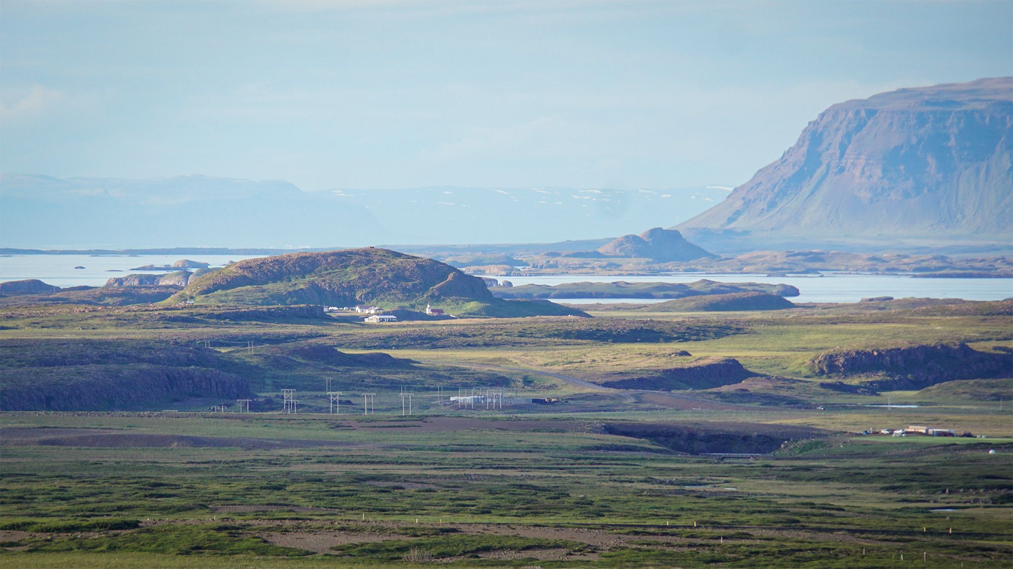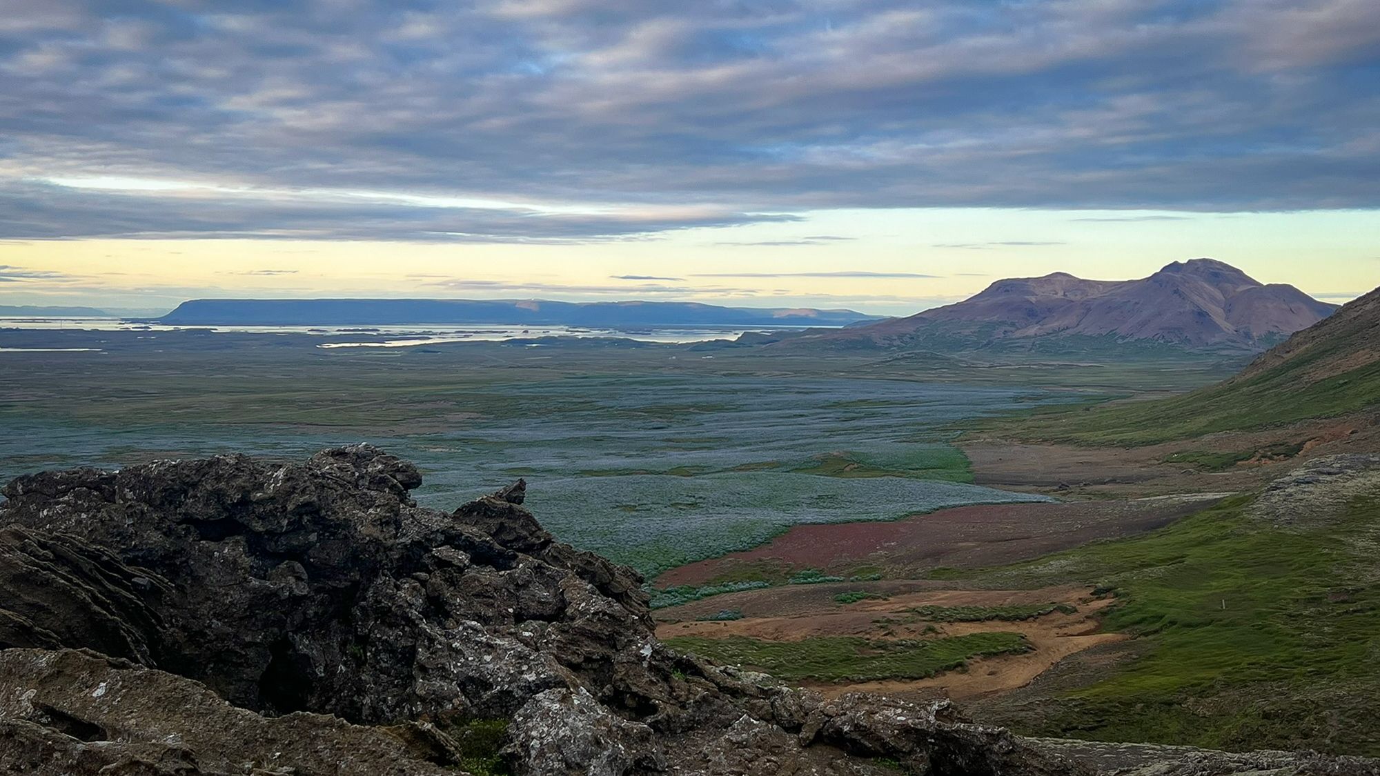 Looking a bit to the north, you can see a farm and a small church under Helgafell. Behind them there is a fjord with small islands, and further away, the Westfjords.