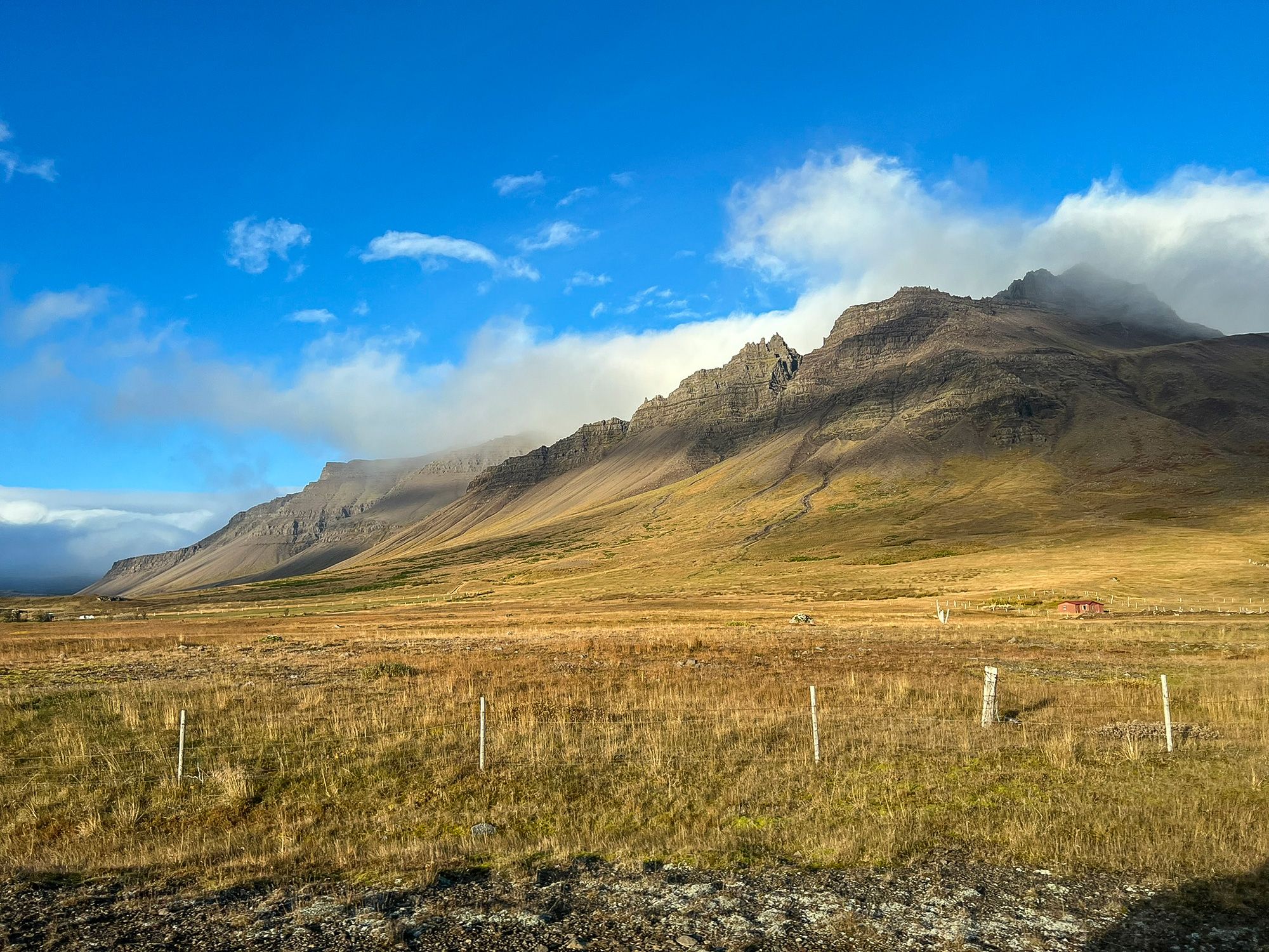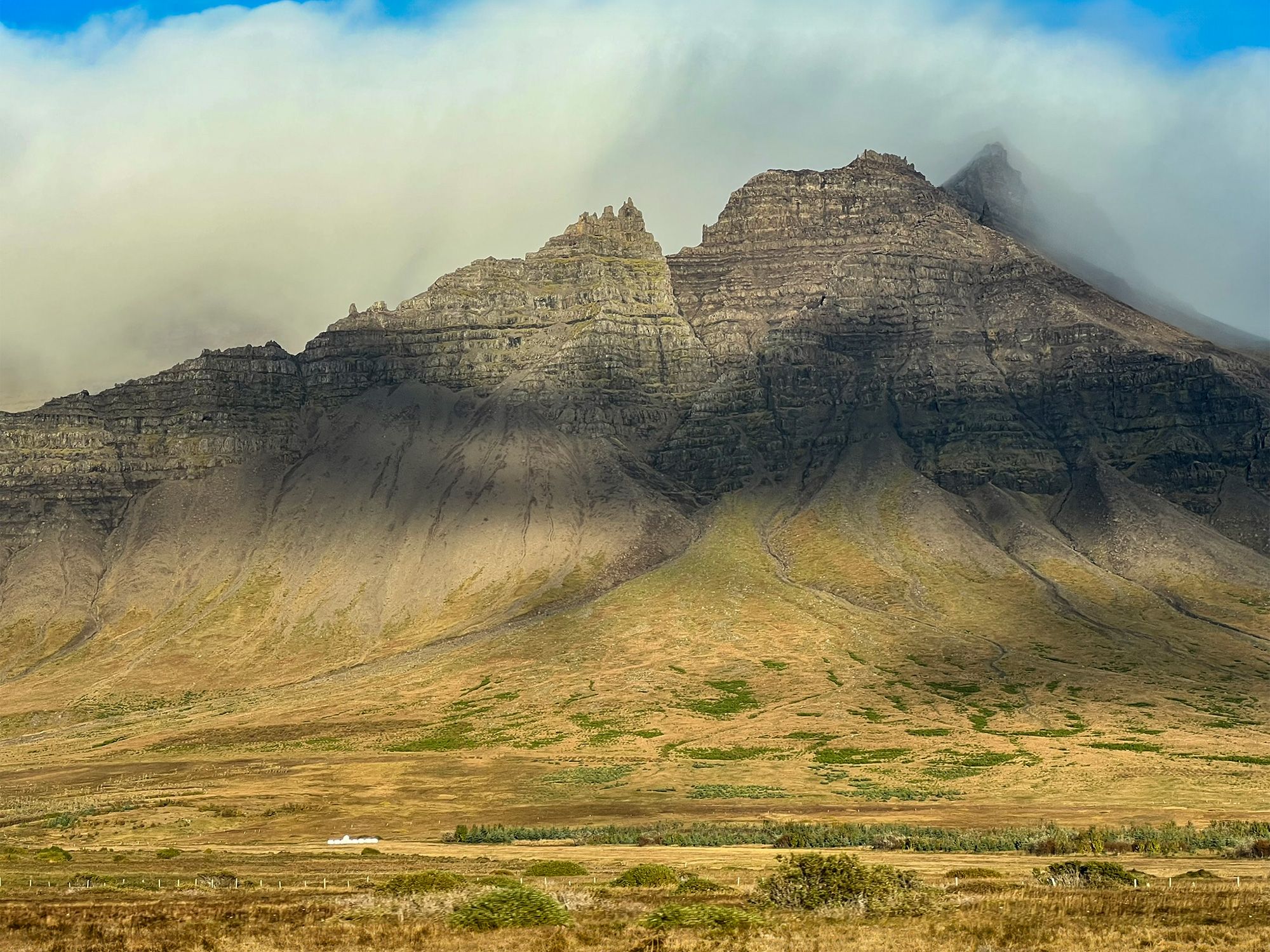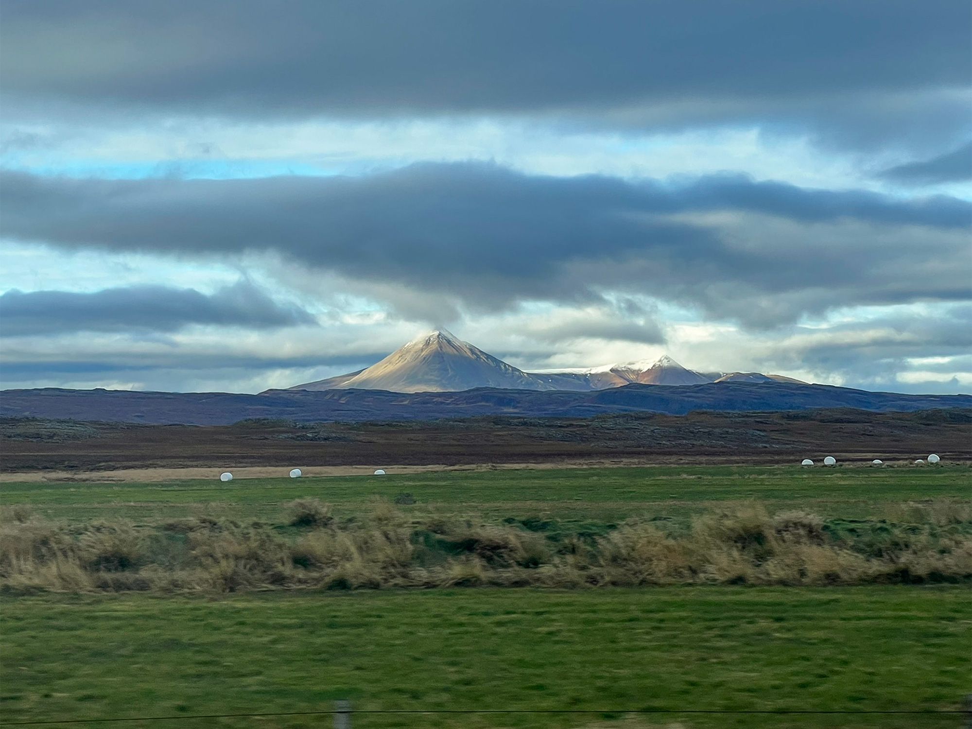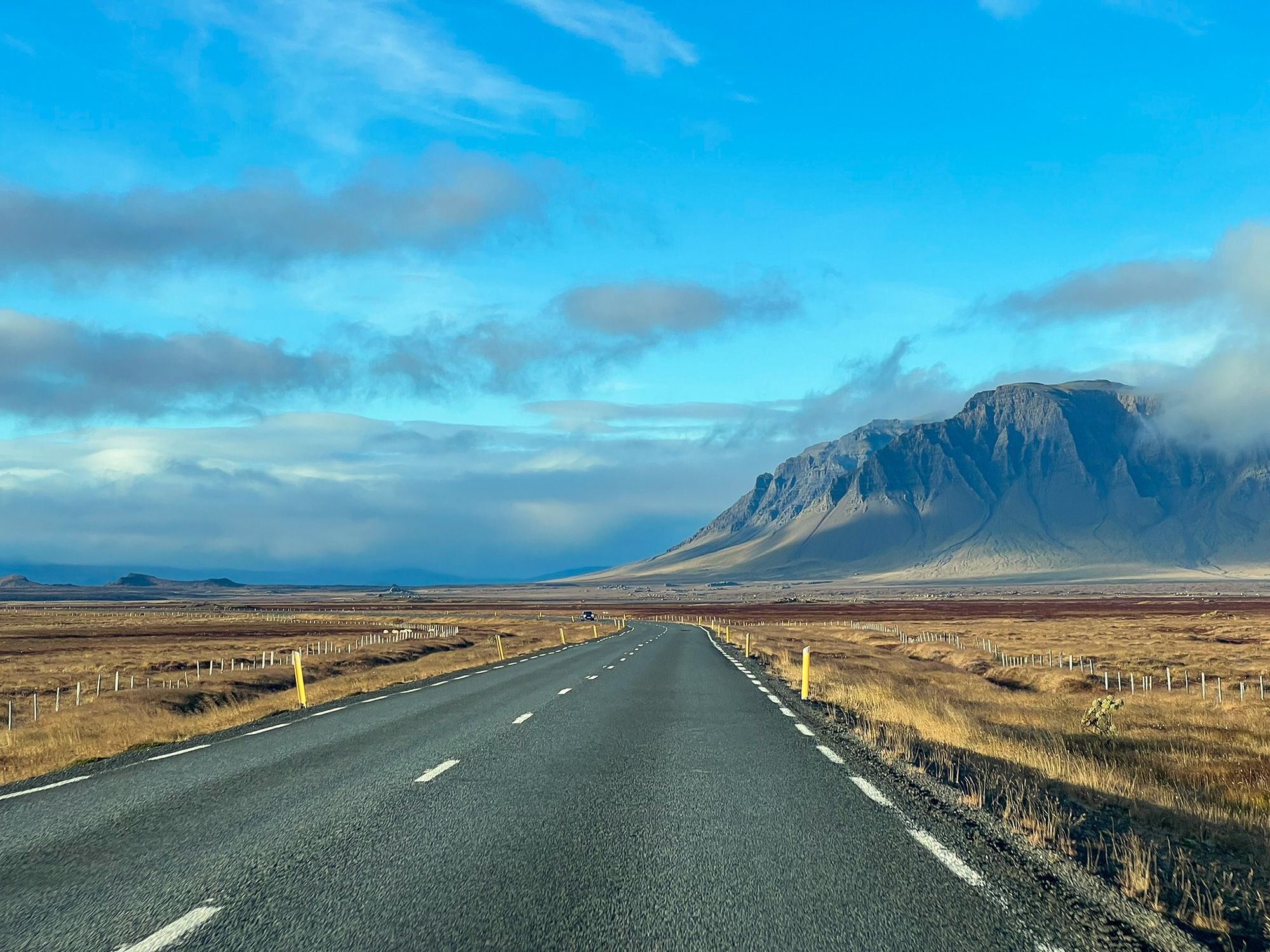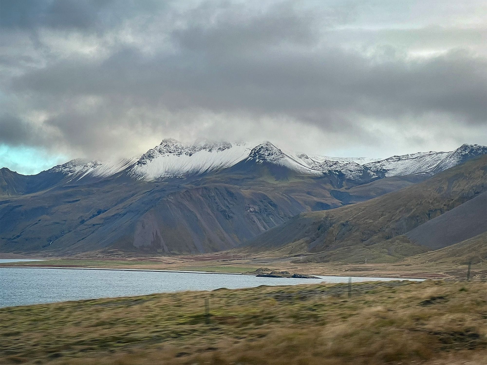 Leaving Snæfellsnes, I left behind snow-covered peaks and a monochrome landscape. Then I crossed the short Vatnaleið mountain pass and, suddenly, a different world; within twenty minutes the weather shifted, the snow vanished, and the colors changed.
