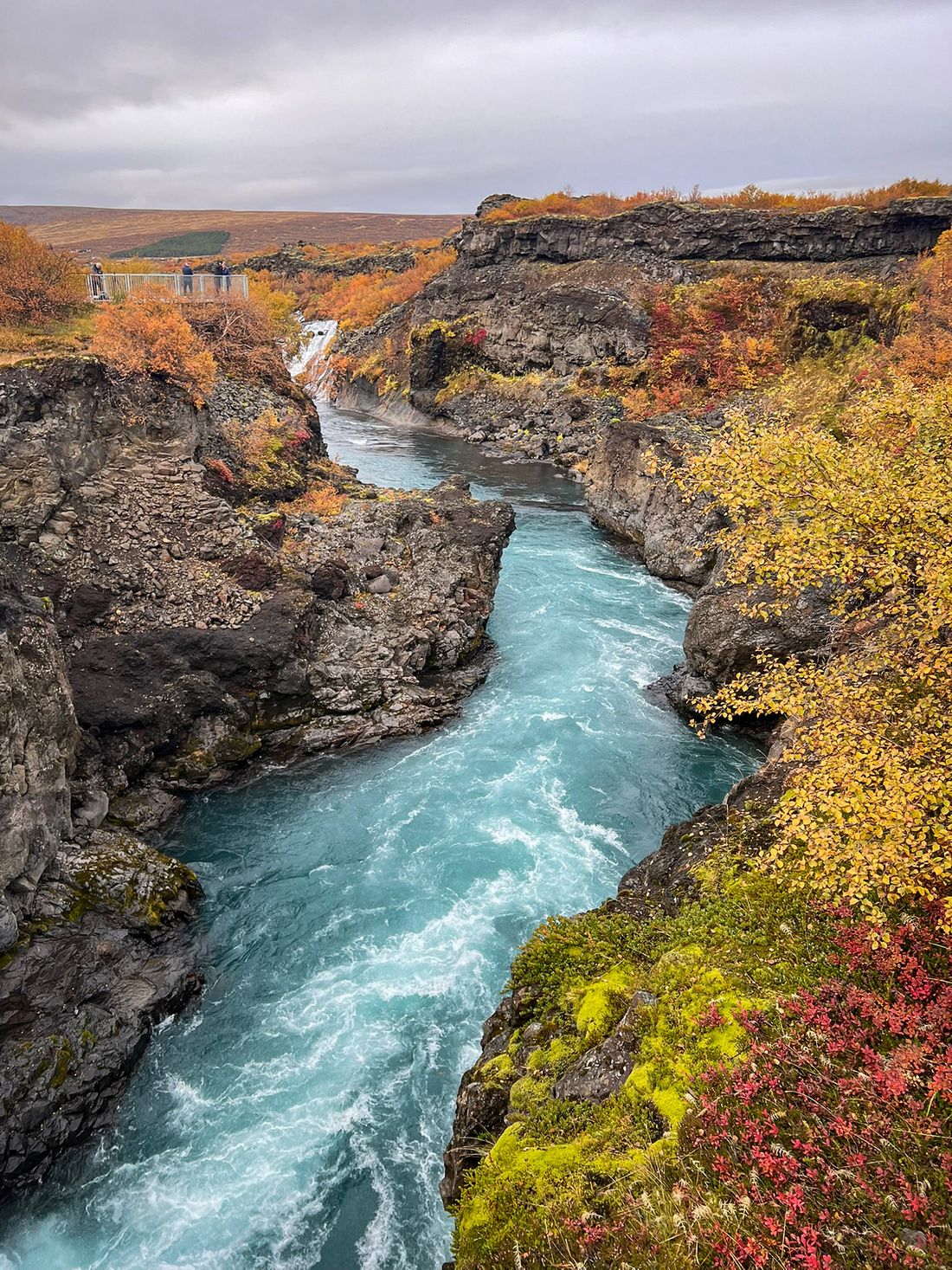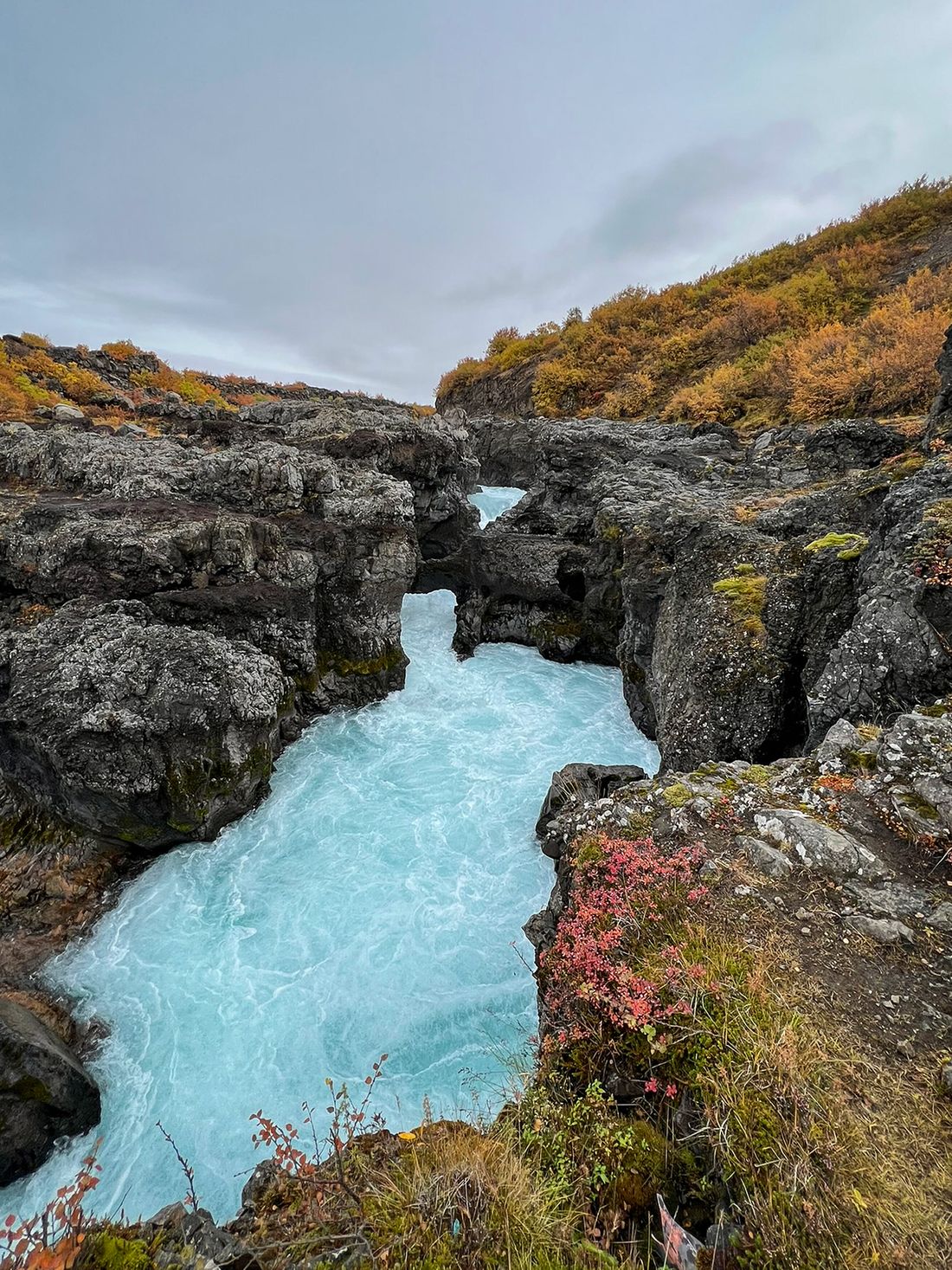After a rest, I drove to two waterfalls - Hraunfossar and Barnafoss - about twenty minutes from the springs, and it was the best decision. The shapes, the color of the water, the autumn setting - it truly knocked me off my feet.