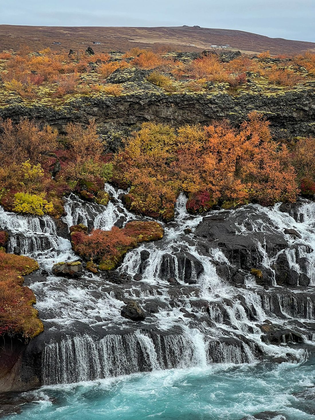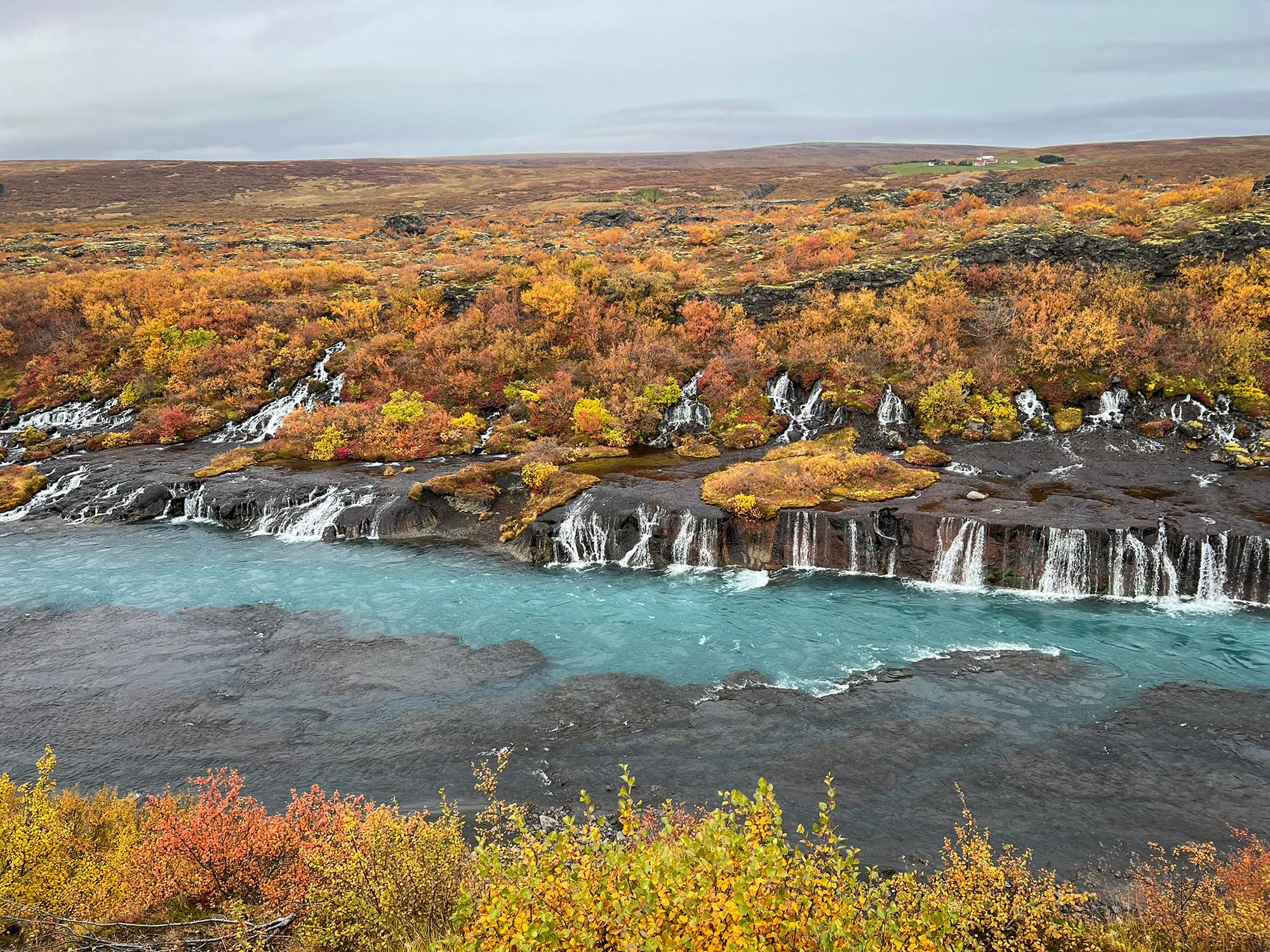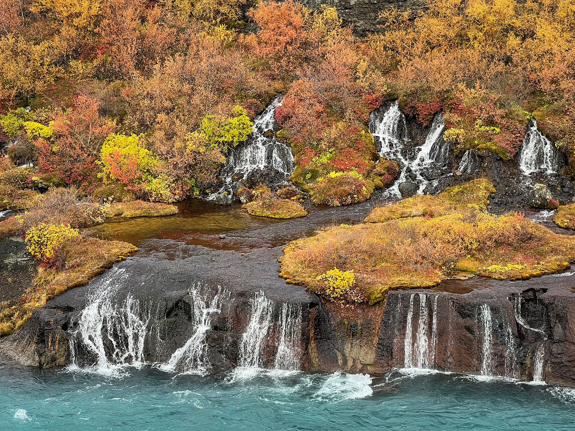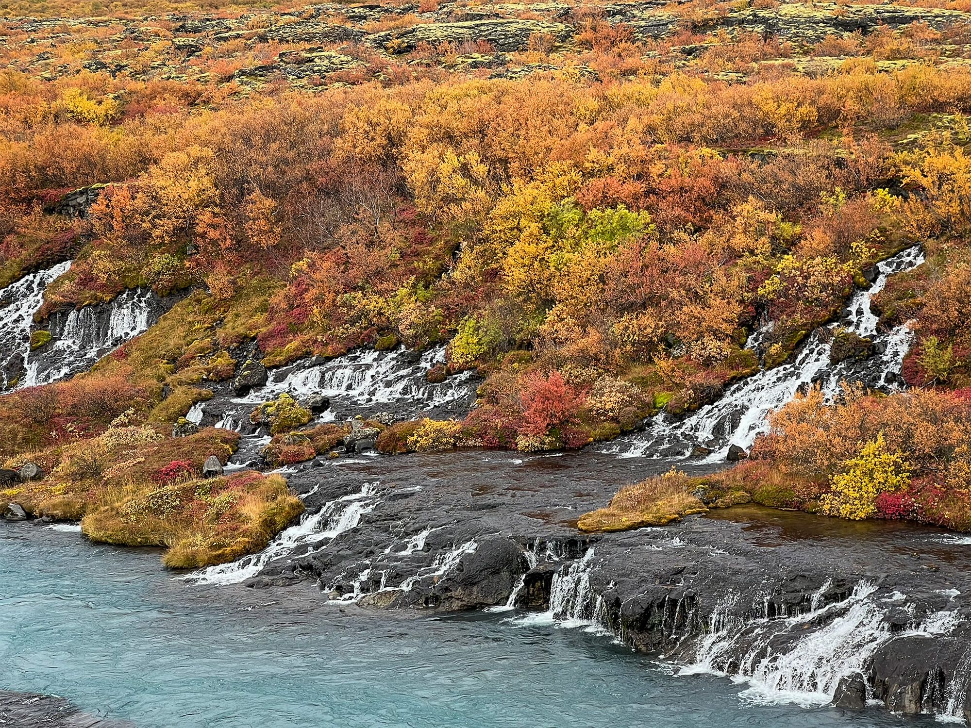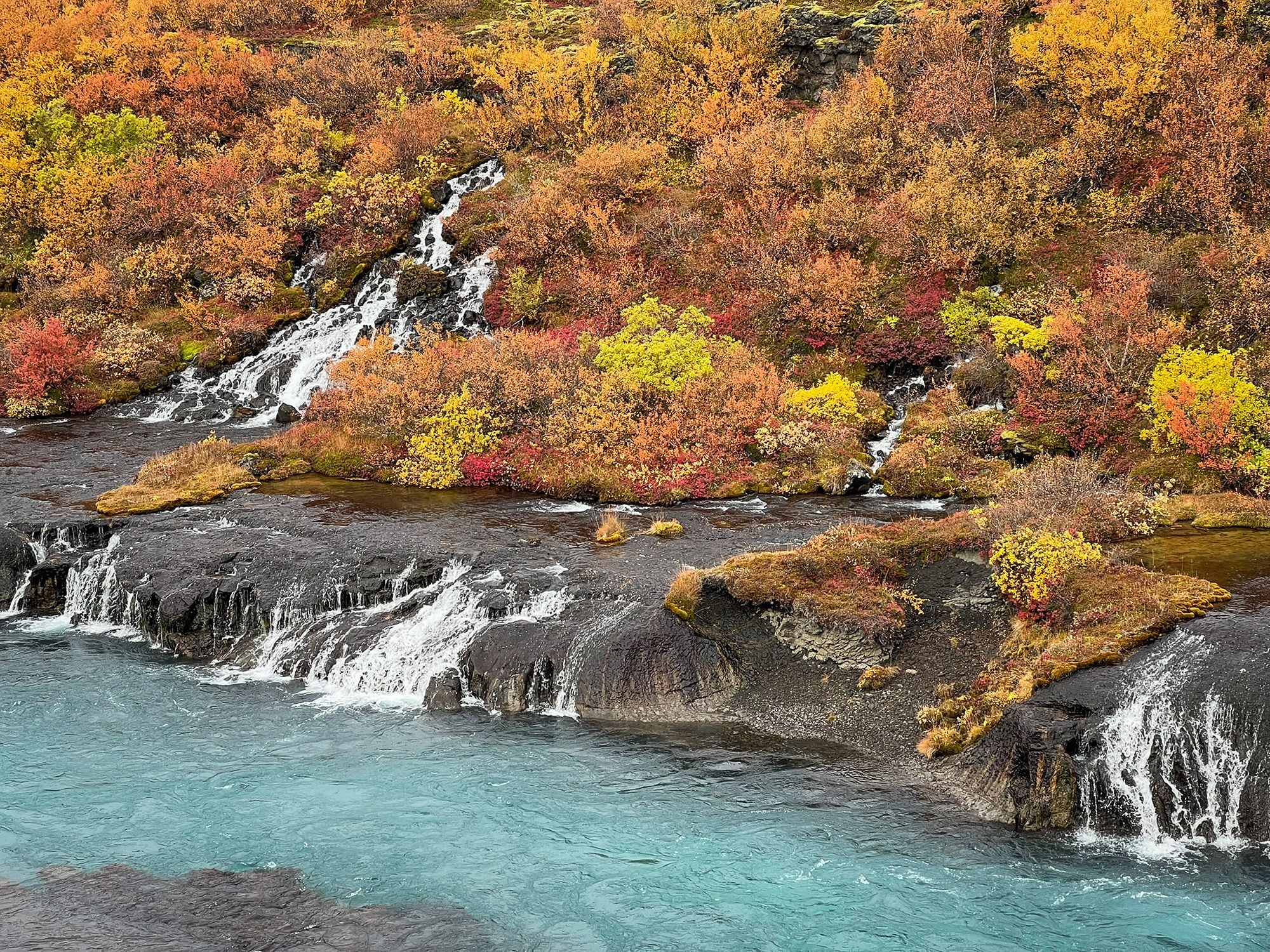 Hraunfossar isn’t one drop but hundreds of thin streams seeping from under a lava field and flowing into the Hvítá River - in a way the “waterfall” is a long stretch of riverbank. The water is milky blue - fed by the Langjökull glacier - making an otherworldly contrast with the gold-red of autumn and the black rock.