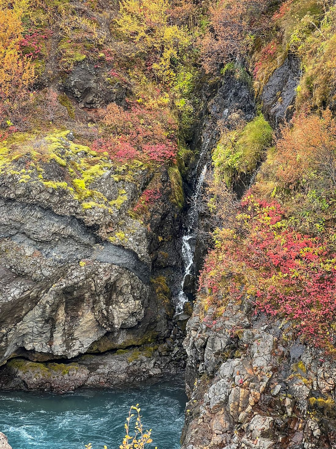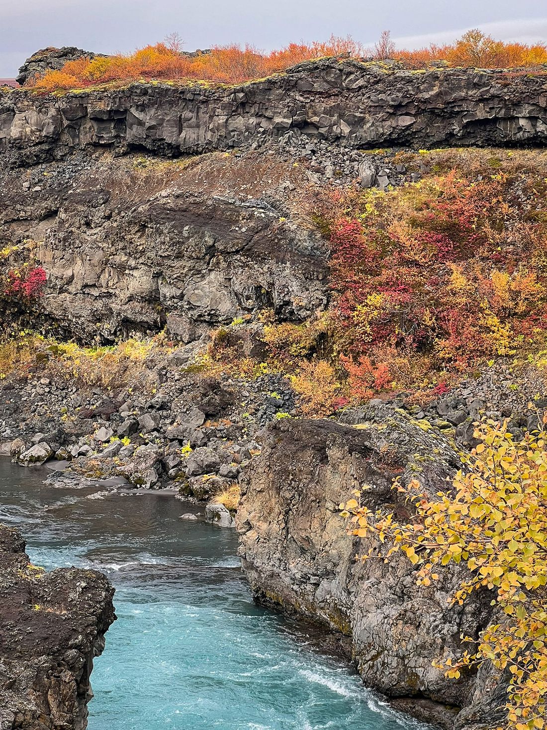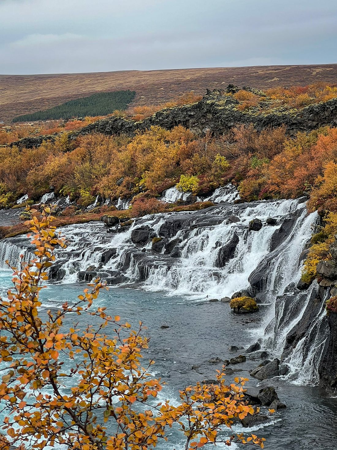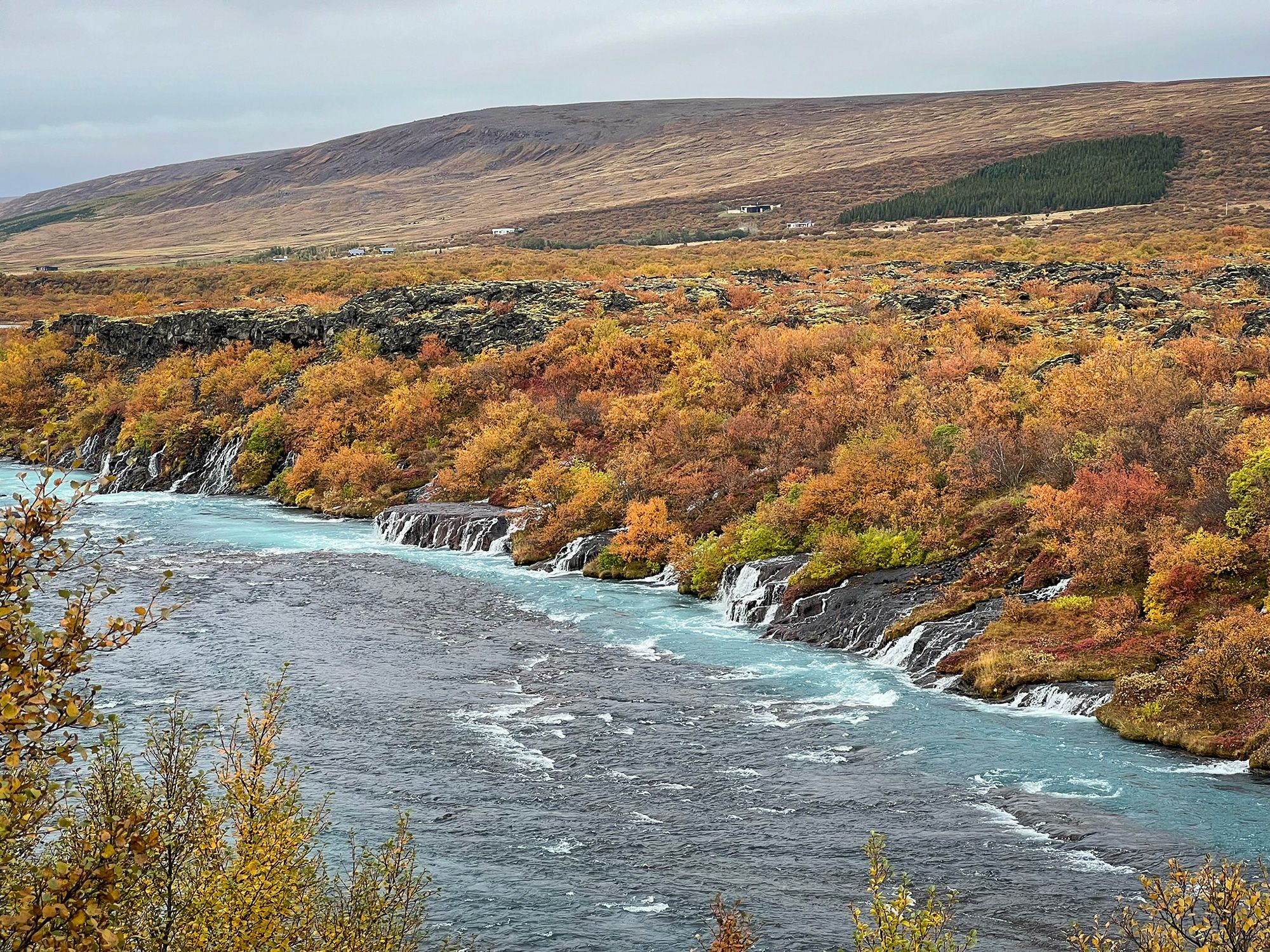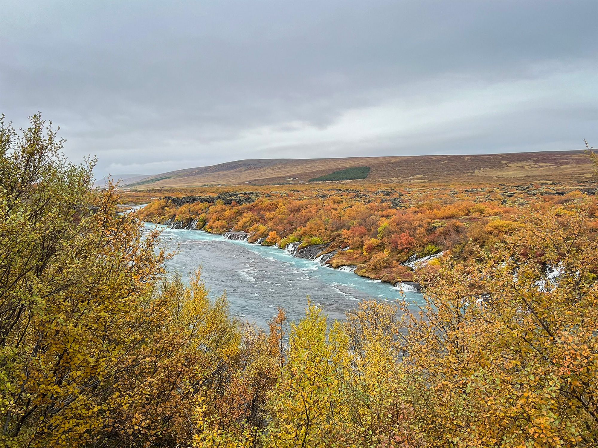 Hraunfossar isn’t one drop but hundreds of thin streams seeping from under a lava field and flowing into the Hvítá River - in a way the “waterfall” is a long stretch of riverbank. The water is milky blue - fed by the Langjökull glacier - making an otherworldly contrast with the gold-red of autumn and the black rock.