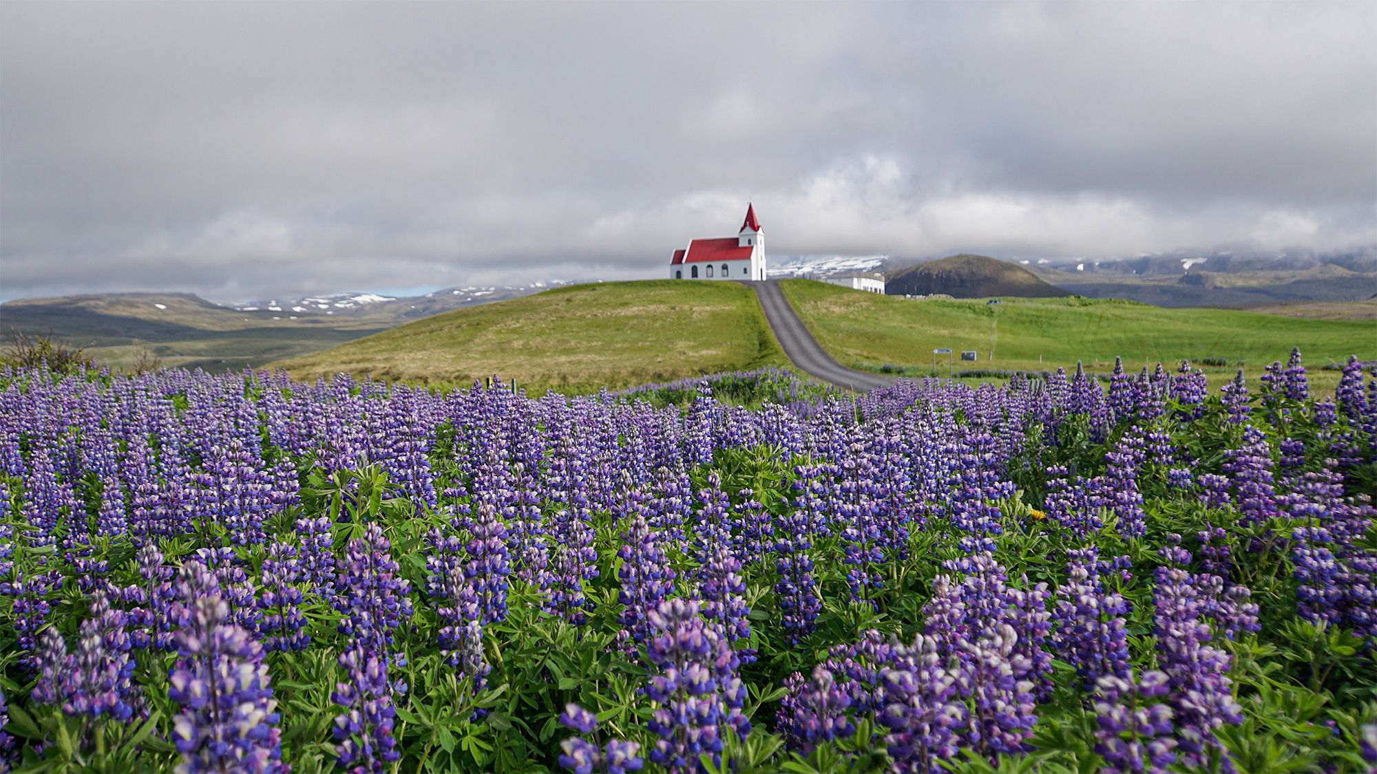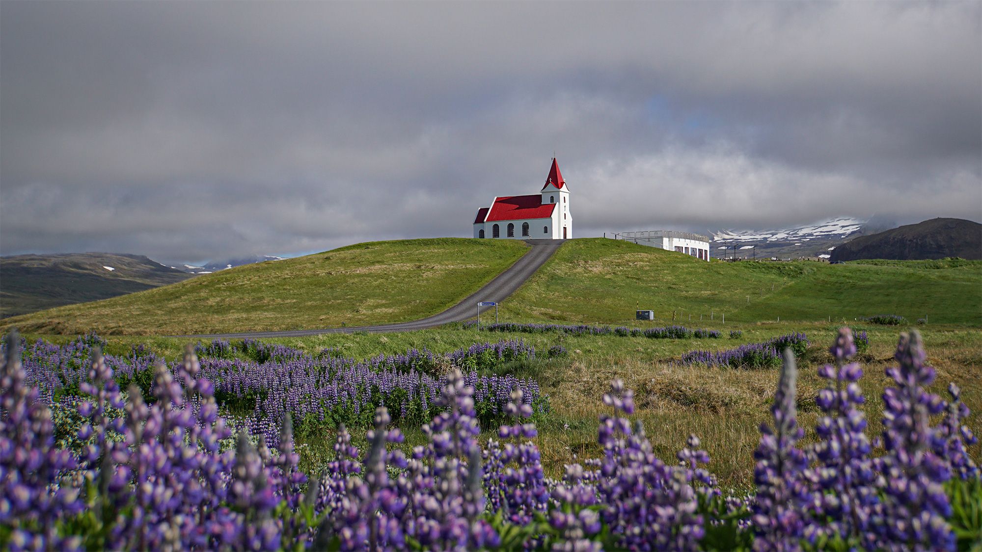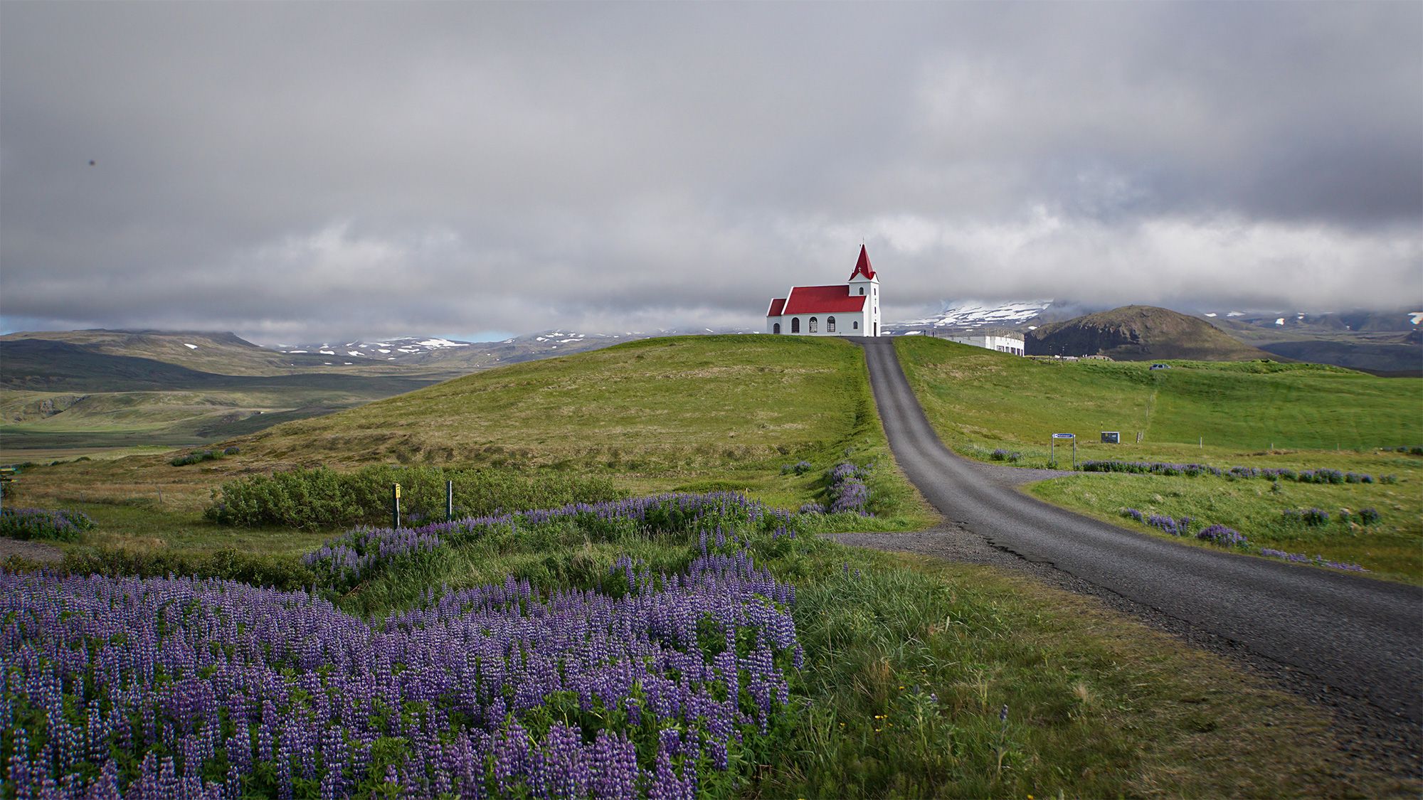 I have many favorite spots around, one of which is a small church on a hill next to the abandoned Ingjaldshóll farm. The church looks incredibly picturesque regardless of the season. I was pleasantly surprised to discover that lupines are growing along the road leading to it!