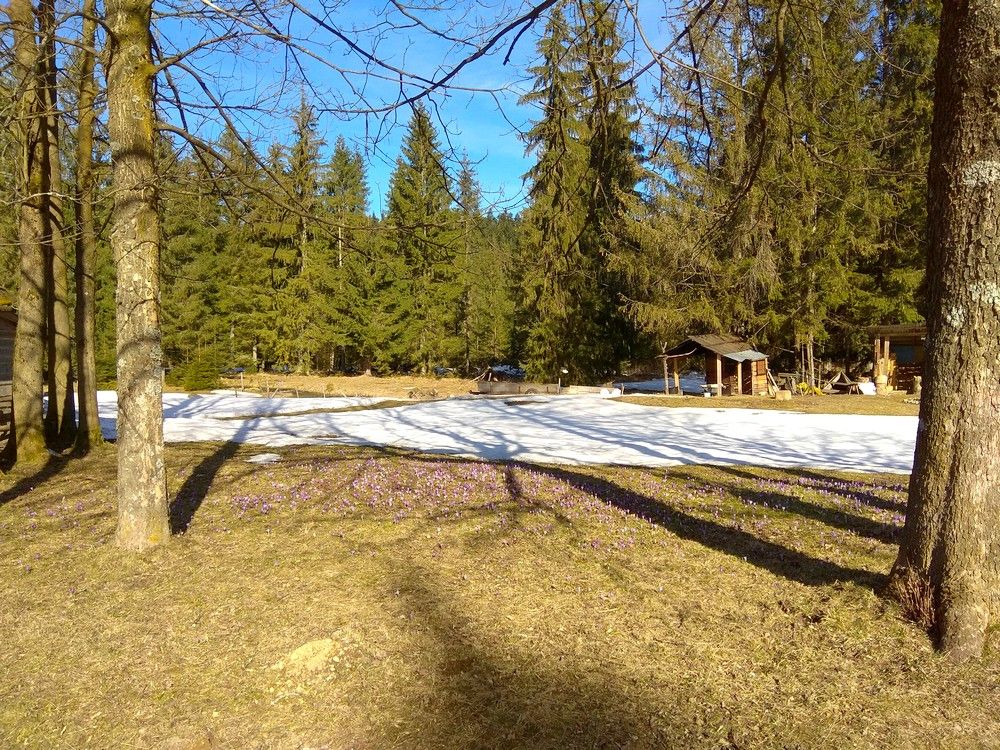 Oh! There they are! As you can see, where the snow has melted, crocuses are already appearing. Sure, if I came in about two weeks, I'd see a whole clearing full of these flowers. Unfortunately, somehow it happened that only then I could come here. At least the weather is great. As you can see in the photos, the sky is completely cloudless. It was very cold in the morning when I started walking. The sun is shining now and it is even warm.