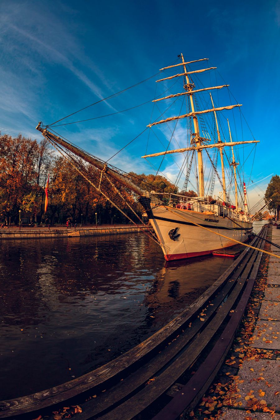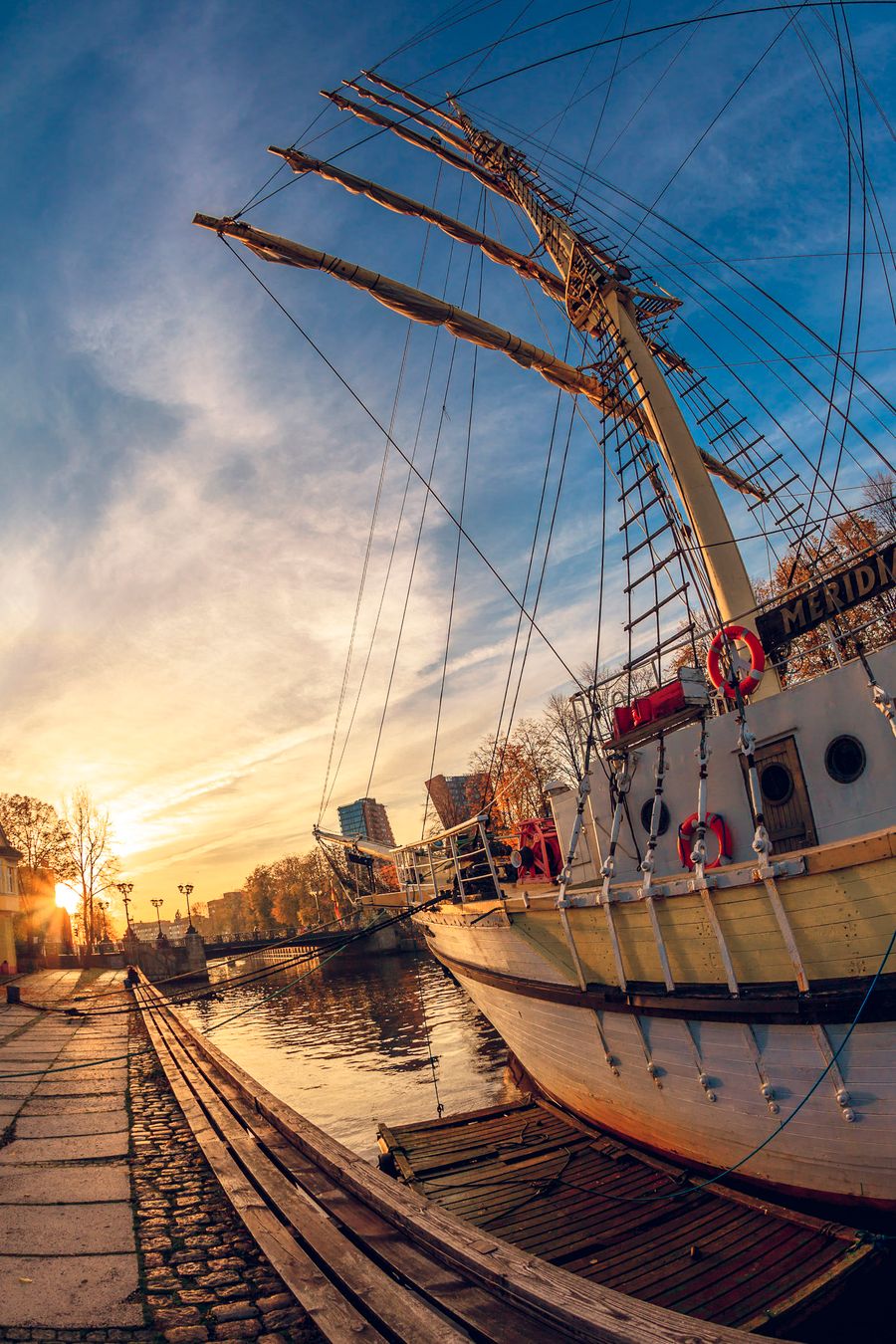 Passing the central road and at the other side of the bridge we approaching another symbol of Klaipeda - sailing vessel "Meridianas". As a result of the claim and as WWII contribution, the series of those ships were built by Finland and passed to Soviet Union. In 1949 the newly built ship was passed to Klaipeda Seamen High School and was used for cadet practice till 1967. From 1970 it was moored at this place as a restaurant, while in 2012-2014 completely repaired.