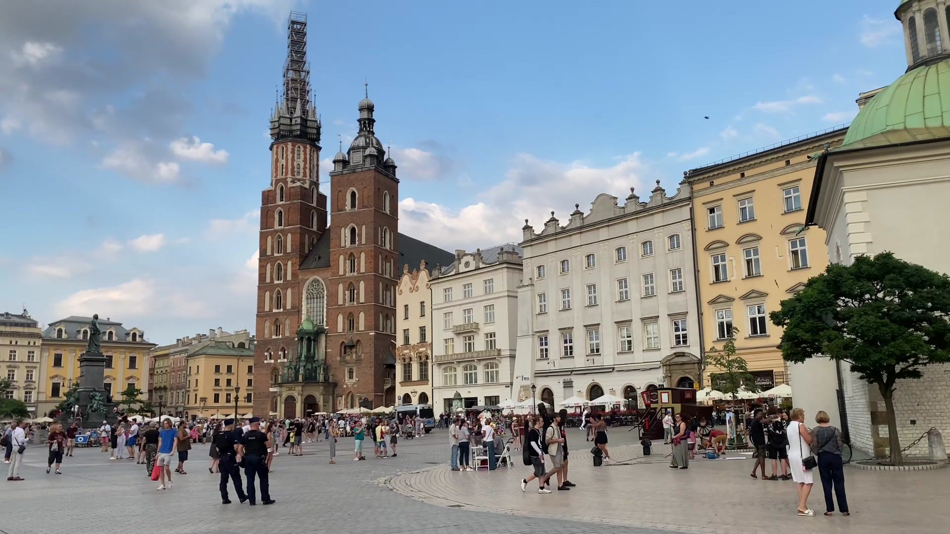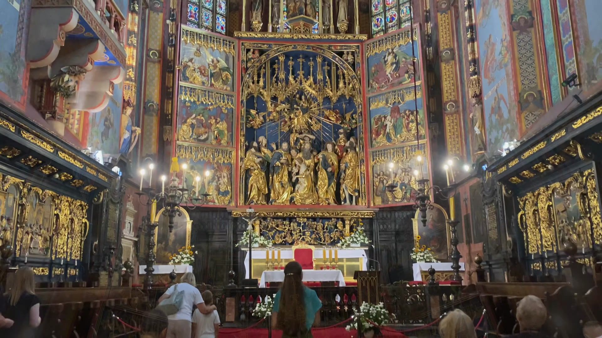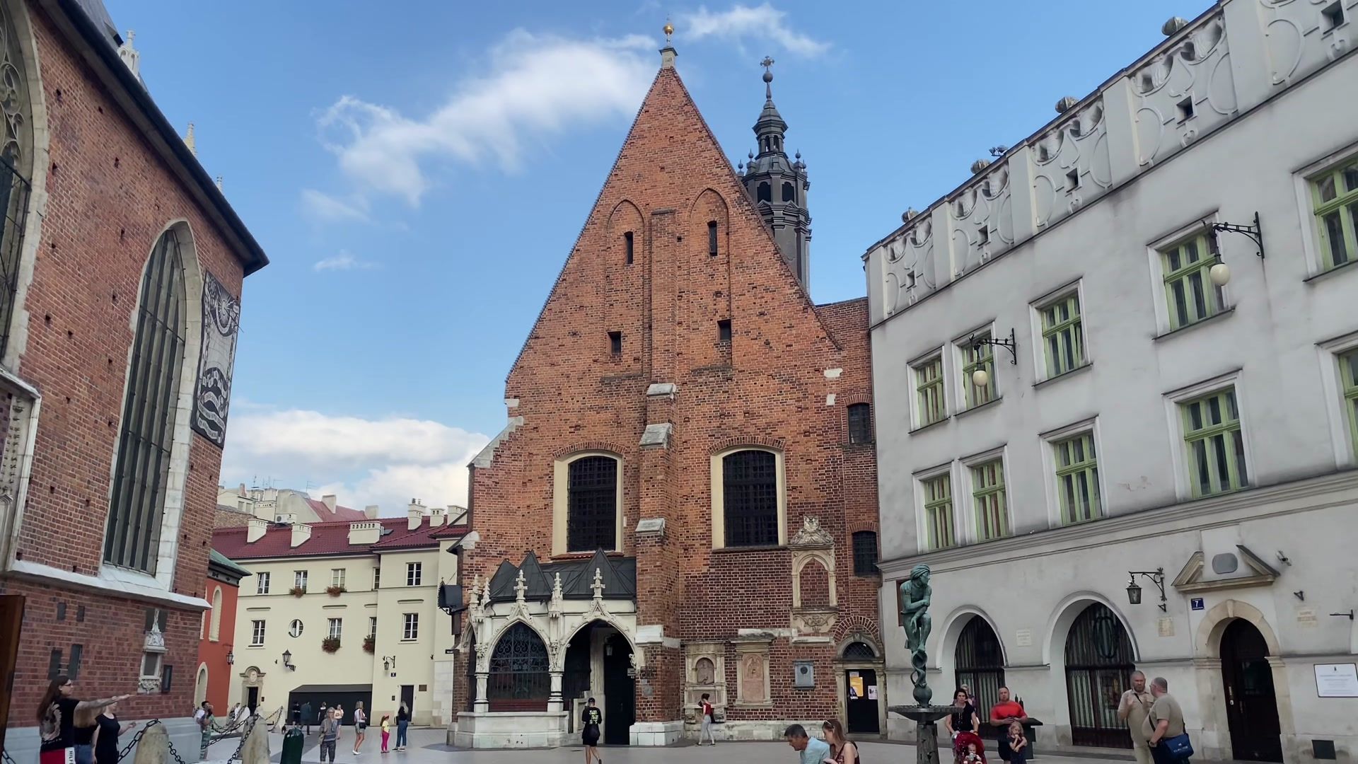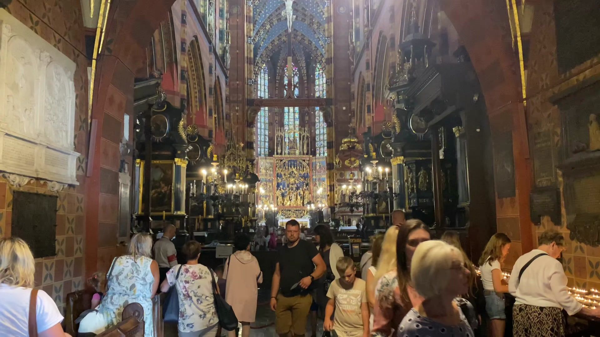 We came upon the dramatic theater after passing through the main gates and turning left. It’s a beautiful and grand structure. Walking a bit further we saw a time corridor displaying the city's history and timeline. Then we approached the heart of Kraków, the largest medieval square a UNESCO World Heritage Site. On the side there was St. Mary's Basilica. There's a legend associated with this cathedral: two brothers started building the two towers, but when one brother became more successful, the jealous brother killed him. Whether true or not the towers different appearances are clearly visible. You can enter the cathedral both for free and with a paid ticket. The free entry is only for a small section. The paid section is for the main part and the altar. The ticket price is 15 zloty and inside is the Mariacki Church. The full name of the Mariacki Church is the Church of the Assumption of the Blessed Virgin Mary and it’s a pride not only of Kraków but of all Poland. It was built on the foundations of a Roman temple in the 13th century. The church has been continuously renovated and expanded over the years and even today, restoration work continues. Inside we were captivated by the blue velvet dome, stained glass windows, sculptures and an organ that hosts classical music concerts. However, the church’s greatest treasure is one of the largest wooden altarpieces in the world dating back to the late 15th century. This masterpiece took 12 years to complete. Every hour a trumpeter plays a melody from the church tower, but there’s a half-finished melody. This incomplete melody is heard only in Kraków, but at noon all of Poland listens to it. This tradition originated when the trumpeter was warning the city, but an arrow struck his throat, leaving the melody unfinished. The attack was repelled, but this incomplete melody became a symbol of time and safety for the city.