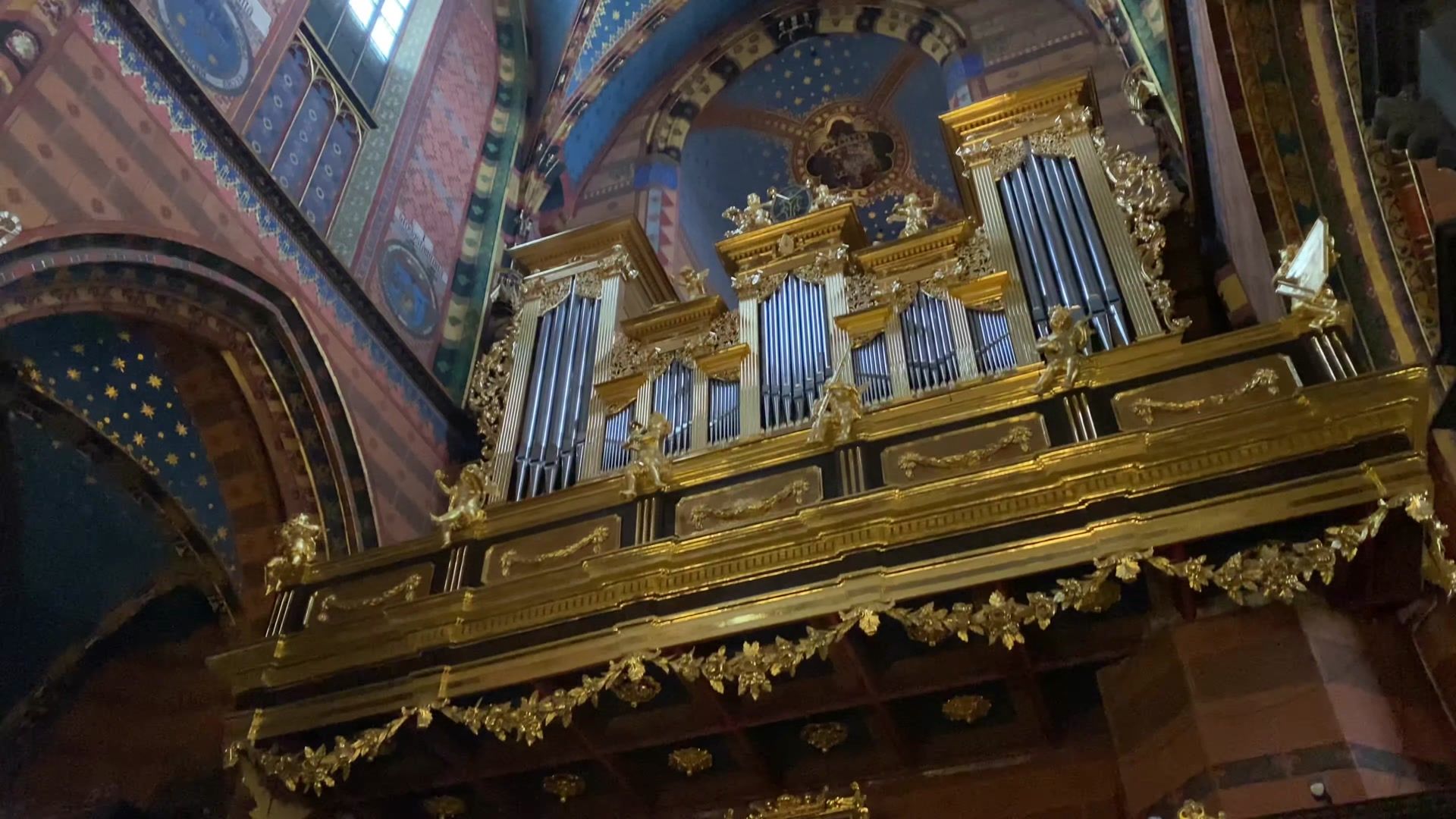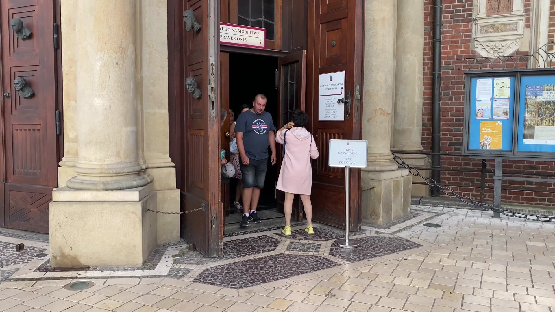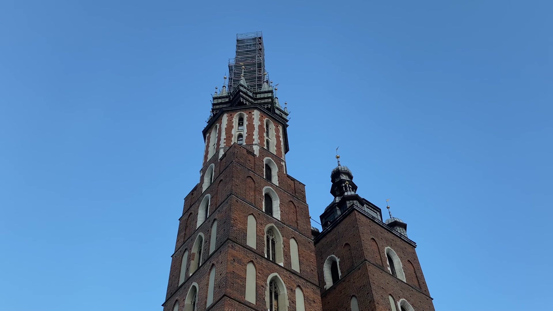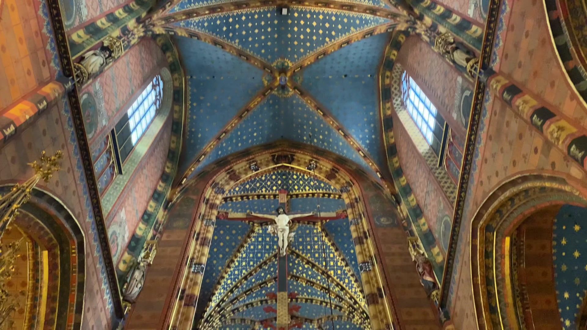 We came upon the dramatic theater after passing through the main gates and turning left. It’s a beautiful and grand structure. Walking a bit further we saw a time corridor displaying the city's history and timeline. Then we approached the heart of Kraków, the largest medieval square a UNESCO World Heritage Site. On the side there was St. Mary's Basilica. There's a legend associated with this cathedral: two brothers started building the two towers, but when one brother became more successful, the jealous brother killed him. Whether true or not the towers different appearances are clearly visible. You can enter the cathedral both for free and with a paid ticket. The free entry is only for a small section. The paid section is for the main part and the altar. The ticket price is 15 zloty and inside is the Mariacki Church. The full name of the Mariacki Church is the Church of the Assumption of the Blessed Virgin Mary and it’s a pride not only of Kraków but of all Poland. It was built on the foundations of a Roman temple in the 13th century. The church has been continuously renovated and expanded over the years and even today, restoration work continues. Inside we were captivated by the blue velvet dome, stained glass windows, sculptures and an organ that hosts classical music concerts. However, the church’s greatest treasure is one of the largest wooden altarpieces in the world dating back to the late 15th century. This masterpiece took 12 years to complete. Every hour a trumpeter plays a melody from the church tower, but there’s a half-finished melody. This incomplete melody is heard only in Kraków, but at noon all of Poland listens to it. This tradition originated when the trumpeter was warning the city, but an arrow struck his throat, leaving the melody unfinished. The attack was repelled, but this incomplete melody became a symbol of time and safety for the city.