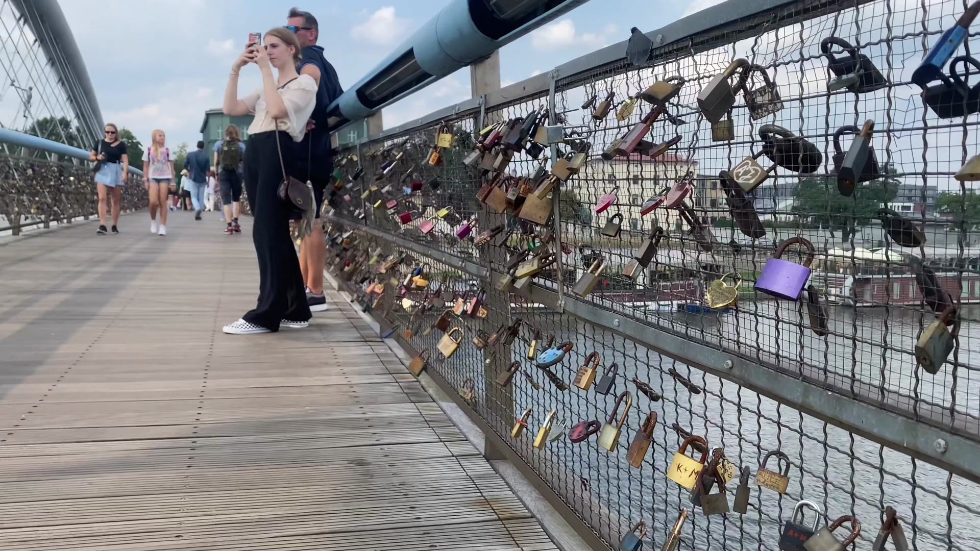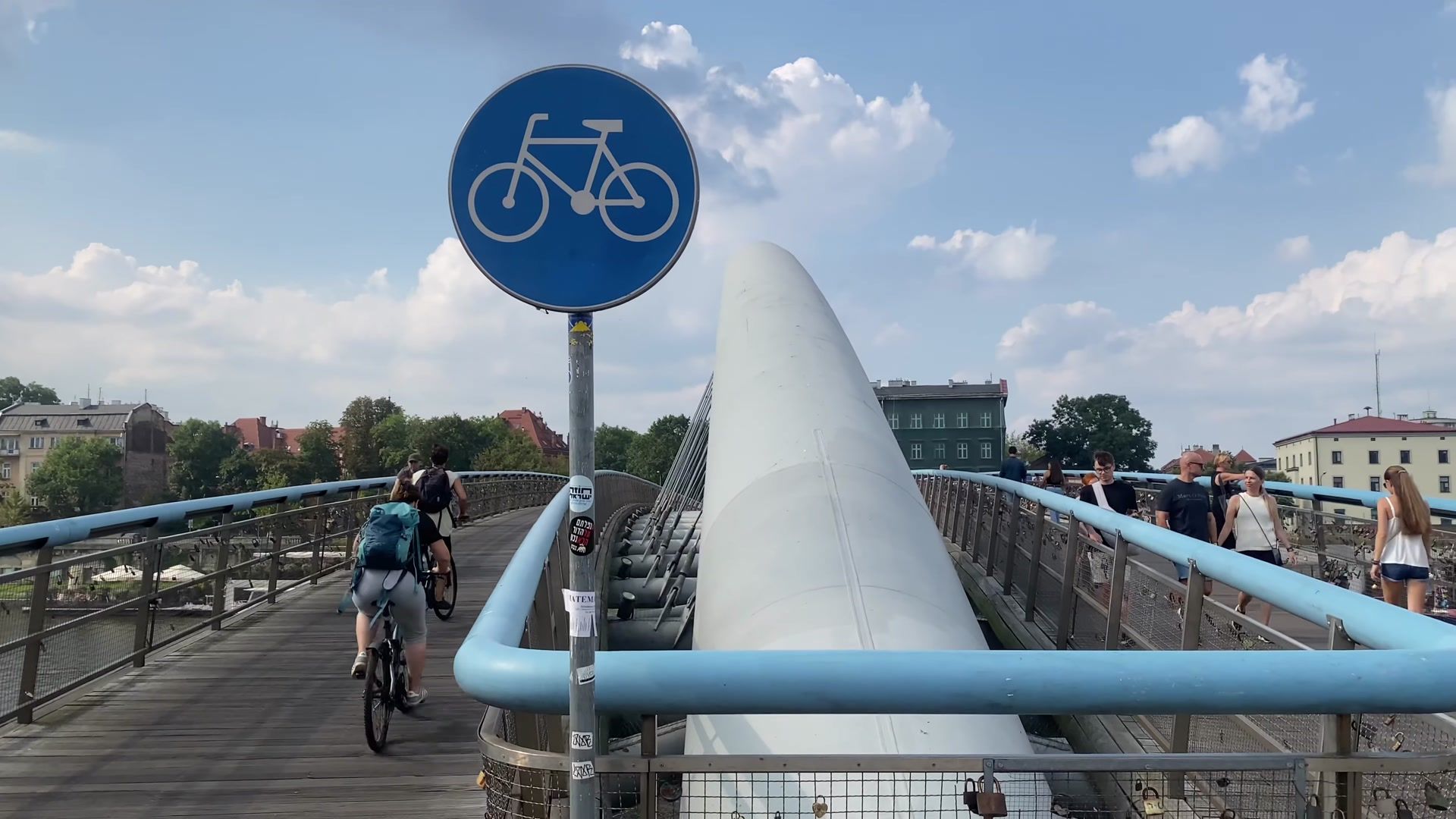 We returned to the central part of Kraków. There is a pedestrian bridge here, one side for pedestrians and the other side for cyclists. The bridge is completely covered with padlocks. There are pedestrians walking on the bike path, so caution is needed. I really liked that Kraków's Old Town is surrounded by a park area. The city has maintained its connection with parks, forests and nature.