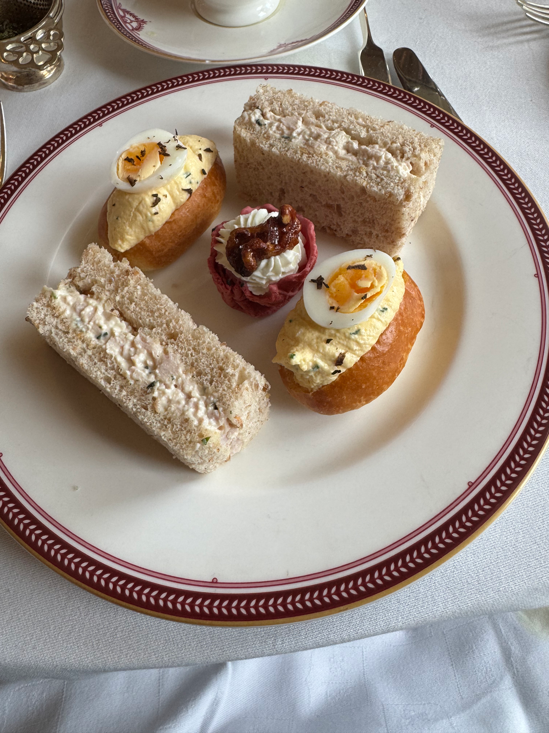 I have always found with the best hotels there is always around 5 sandwiches on an afternoon tea menu. 2 of them are normally fish. I like to stay clear of prawns and salmons and lone behold the prawn and salmon were of course on this menu. At times I had them and they were the nicest they could possibly be but I do not like fish in a sandwich so I tend to have 3 to choose from. Now it is easy to take 2 sandwiches off the list but 3 is a push so this was my predicament. Goats cheese no problem. Chicken and mayo , no problem. Egg mayo , with a push. Should I get rid of the egg mayo. I want to and have more of the nice sandwiches. "You can't take 3 off" someone went to another so I took the plunge and went with 3. I would suffer through the egg mayo. Now my strategy in life in this situation is that I would get rid of the not so nice stuff first so I have the rest of the meal in peace with the nice stuff. This normally did me well in life apart from that one time in the friends house where I tried to consume the driest floweriest potato of all time just to get it out of the way. My friends mother being the great host saw that I downed her dehumidifier of a spud first off and decided to give me another one. Mission failure. This was not going to happen here so I down the two egg mayo. They were the best egg mayos I have ever had which is not hard but they were still an effort to swallow. With hell over with let the good times roll. The other two sandwiches were the nicest I have ever had in their food types. Sublime. The scones came next. Freshly made nice and warm. Hobbit scones but nice. I had a second but regretted them as soon as I ate the second one because I was now full and we had the deserts to go. For tea I went with a mint option and then an Americano. I did this because I am sick of getting coffee at afternoon tea so I went with the most untea-like tea. Mint tea. As per above it was the mintiest of mint teas, Dessert!