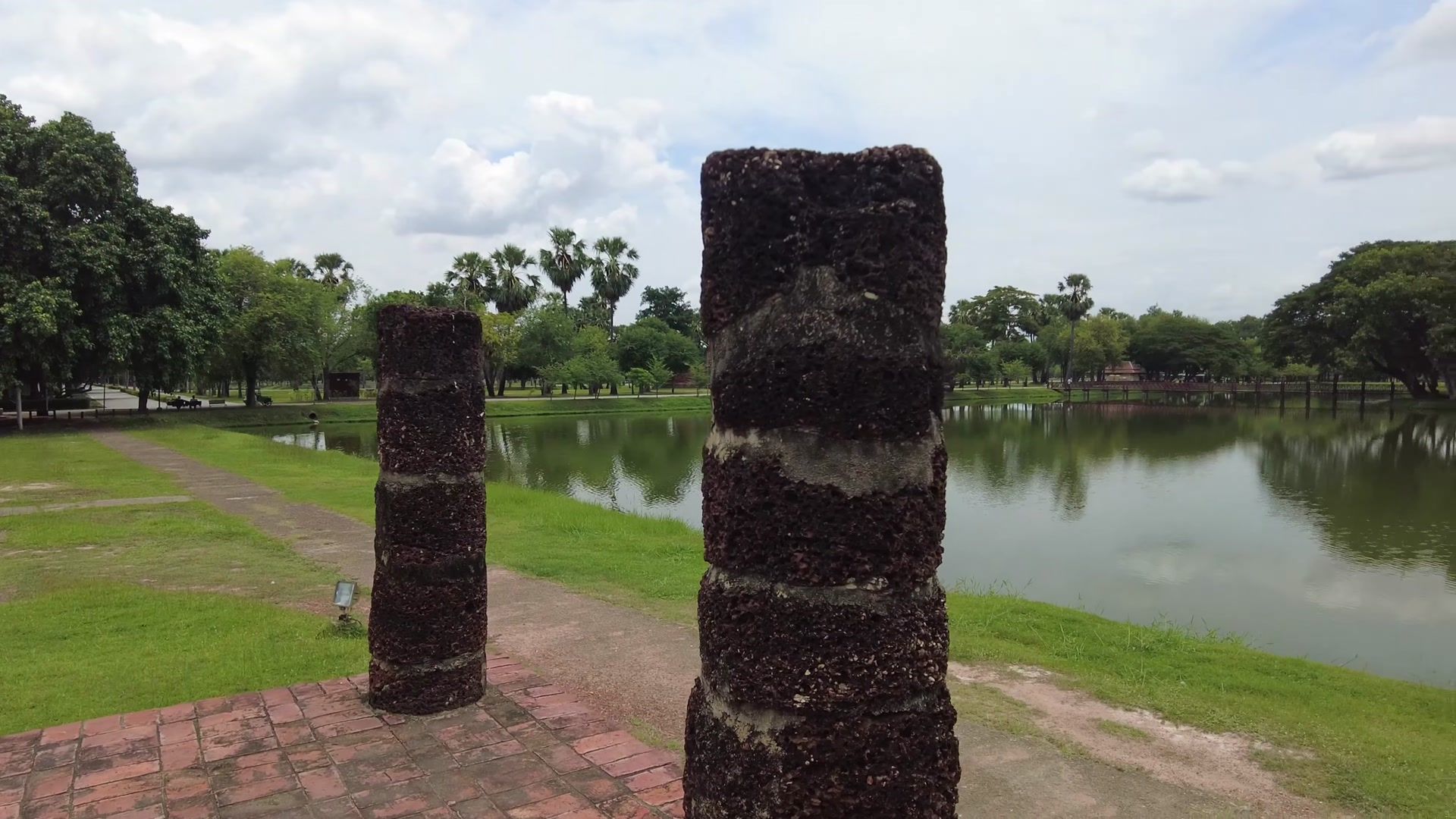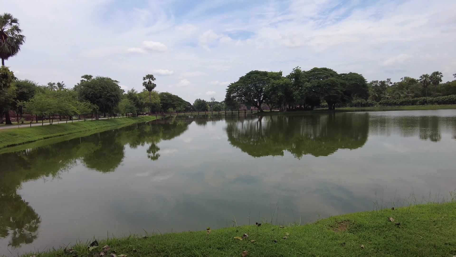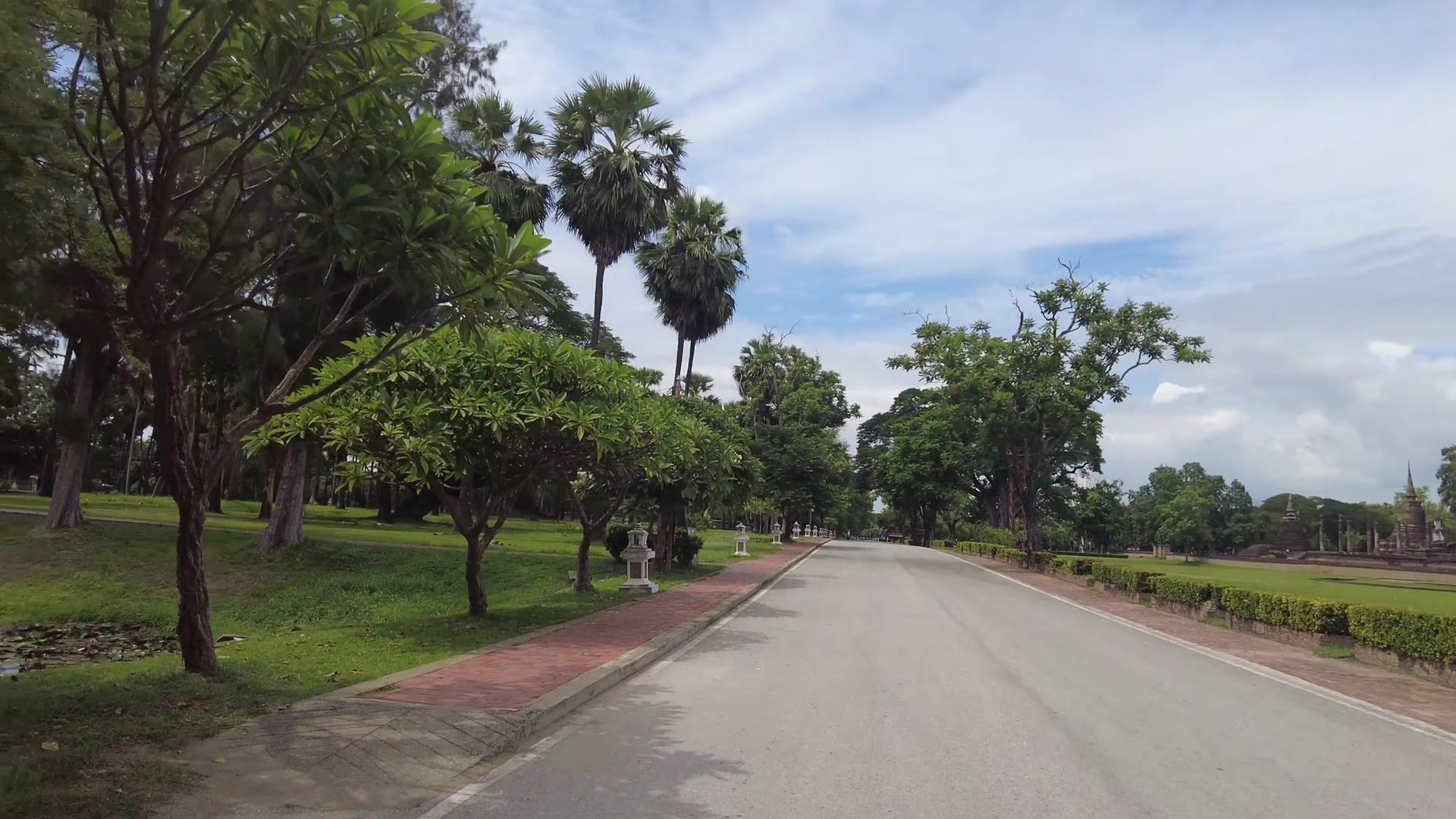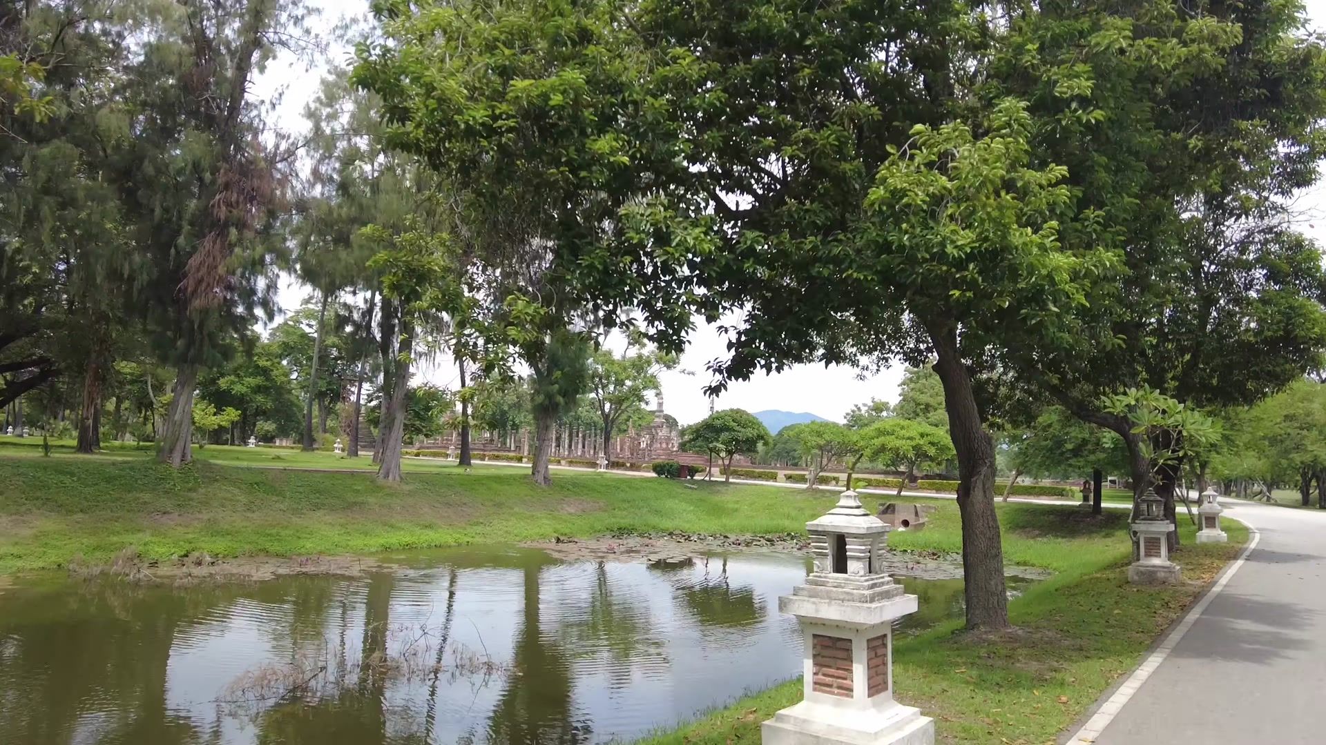 There is a large lake. I wonder if they have stocked it with fish? In Thailand, it’s common to release fish into ponds. As we moved to a new section of the park, we were glad we had rented an electric vehicle because the distances were long. There are many historical structures near the entrance, but if you want to see the important ones further away, a vehicle is a must. Alternatively, you can rent a bicycle, but given the heat, it wouldn’t be very comfortable. There are also trams that shuttle visitors around the park, stopping at designated points to pick up and drop off passengers. However, using the tram means either waiting for everyone to gather or having a limited amount of time at each stop.