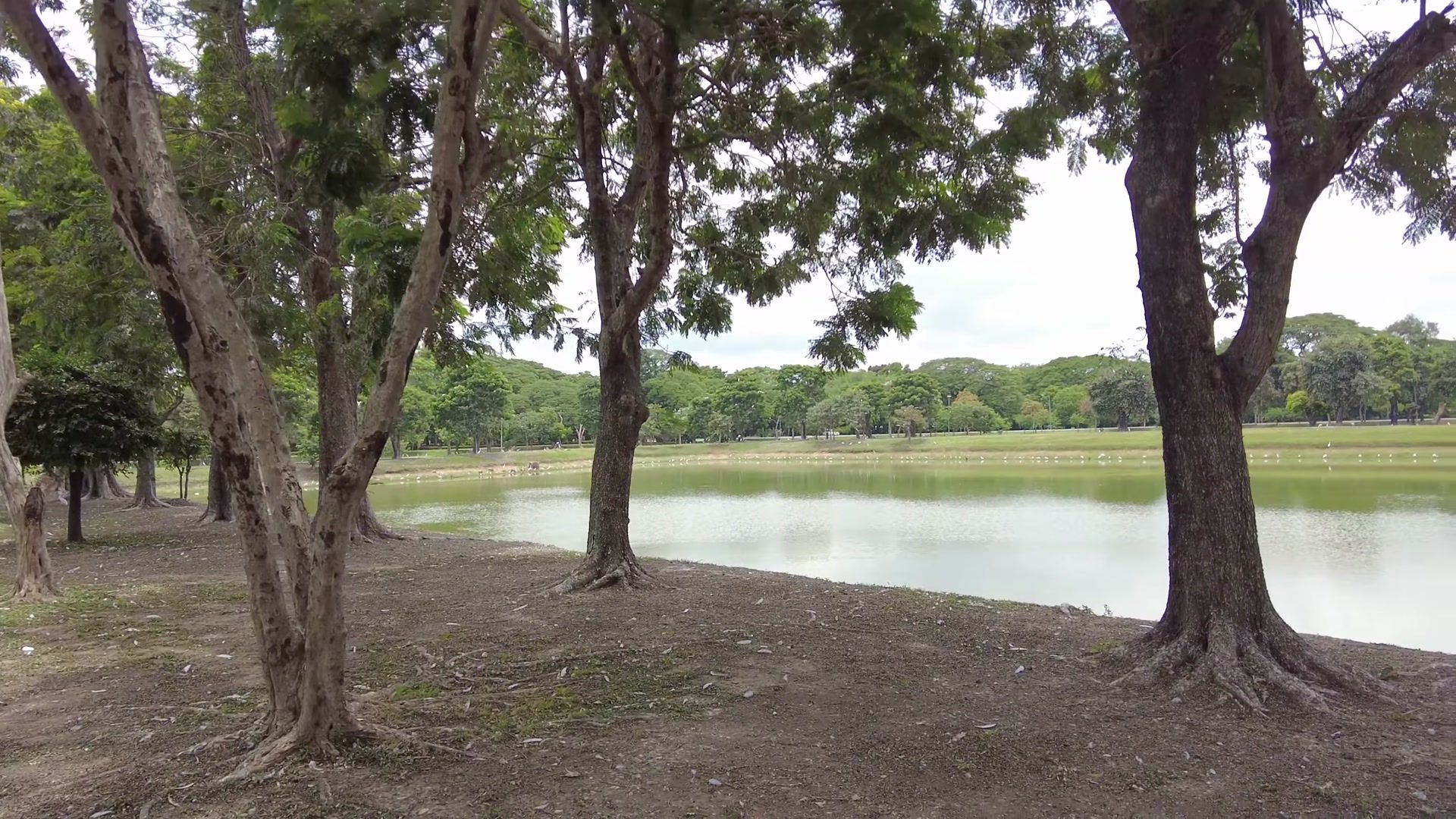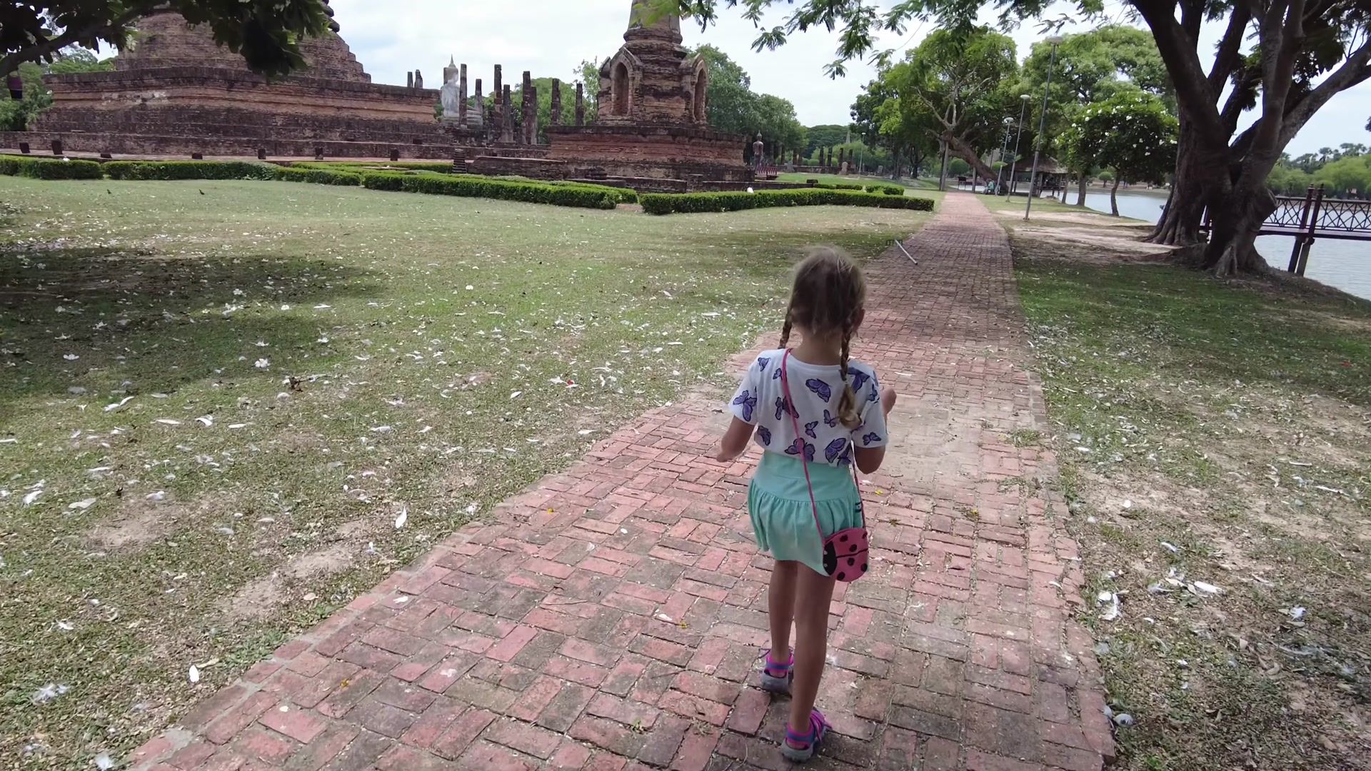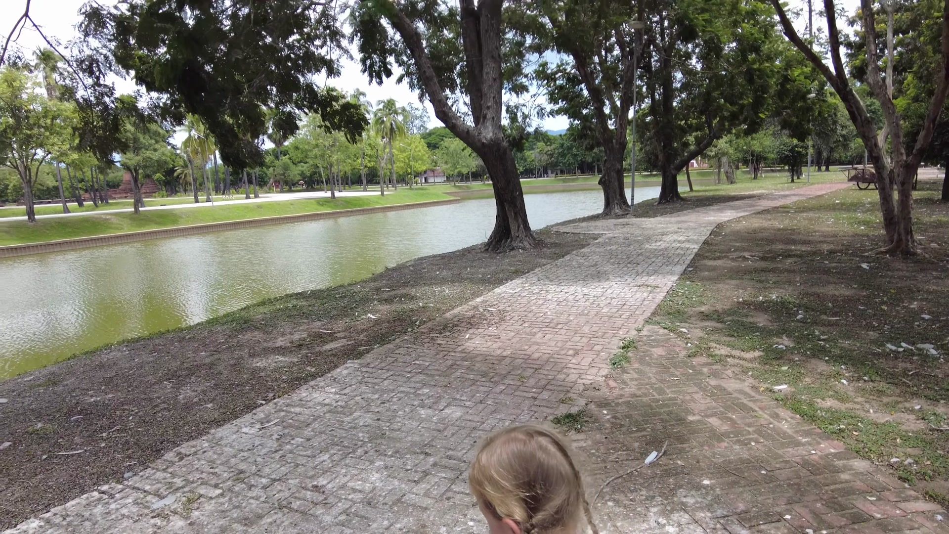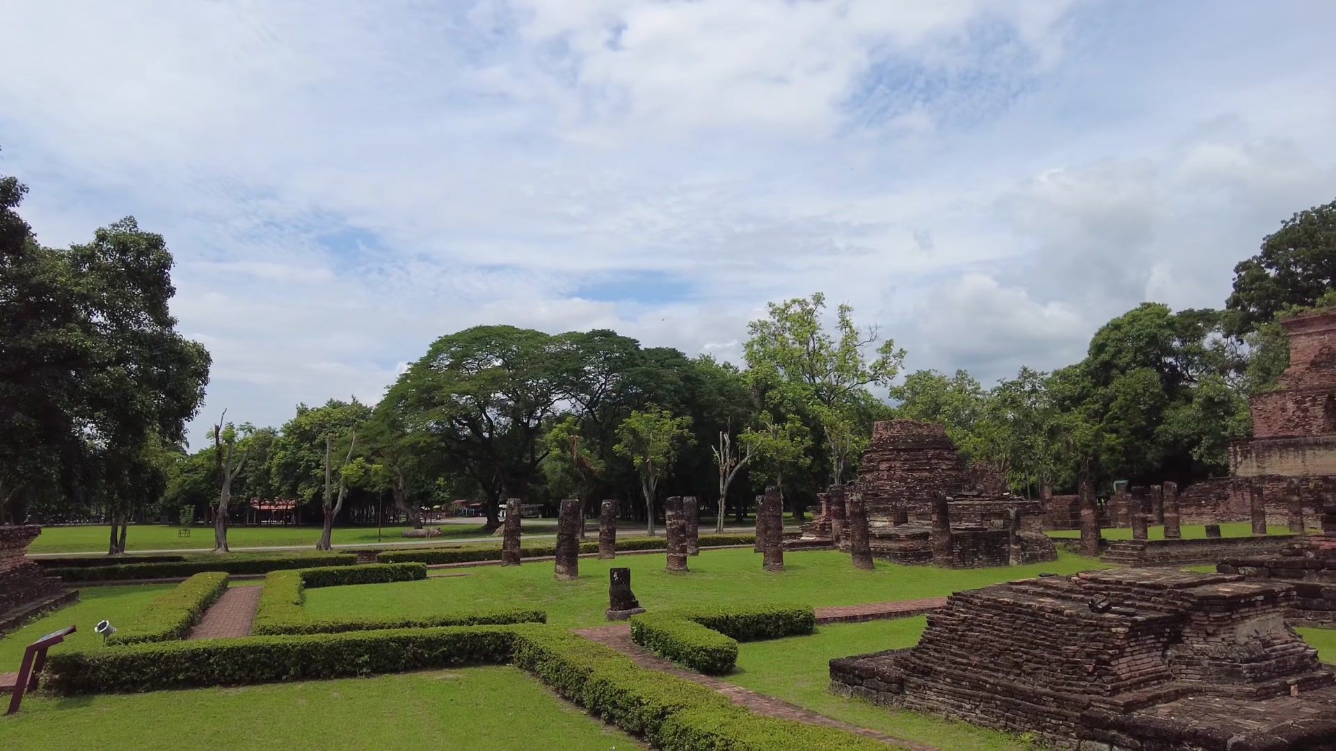 There is a large lake. I wonder if they have stocked it with fish? In Thailand, it’s common to release fish into ponds. As we moved to a new section of the park, we were glad we had rented an electric vehicle because the distances were long. There are many historical structures near the entrance, but if you want to see the important ones further away, a vehicle is a must. Alternatively, you can rent a bicycle, but given the heat, it wouldn’t be very comfortable. There are also trams that shuttle visitors around the park, stopping at designated points to pick up and drop off passengers. However, using the tram means either waiting for everyone to gather or having a limited amount of time at each stop.