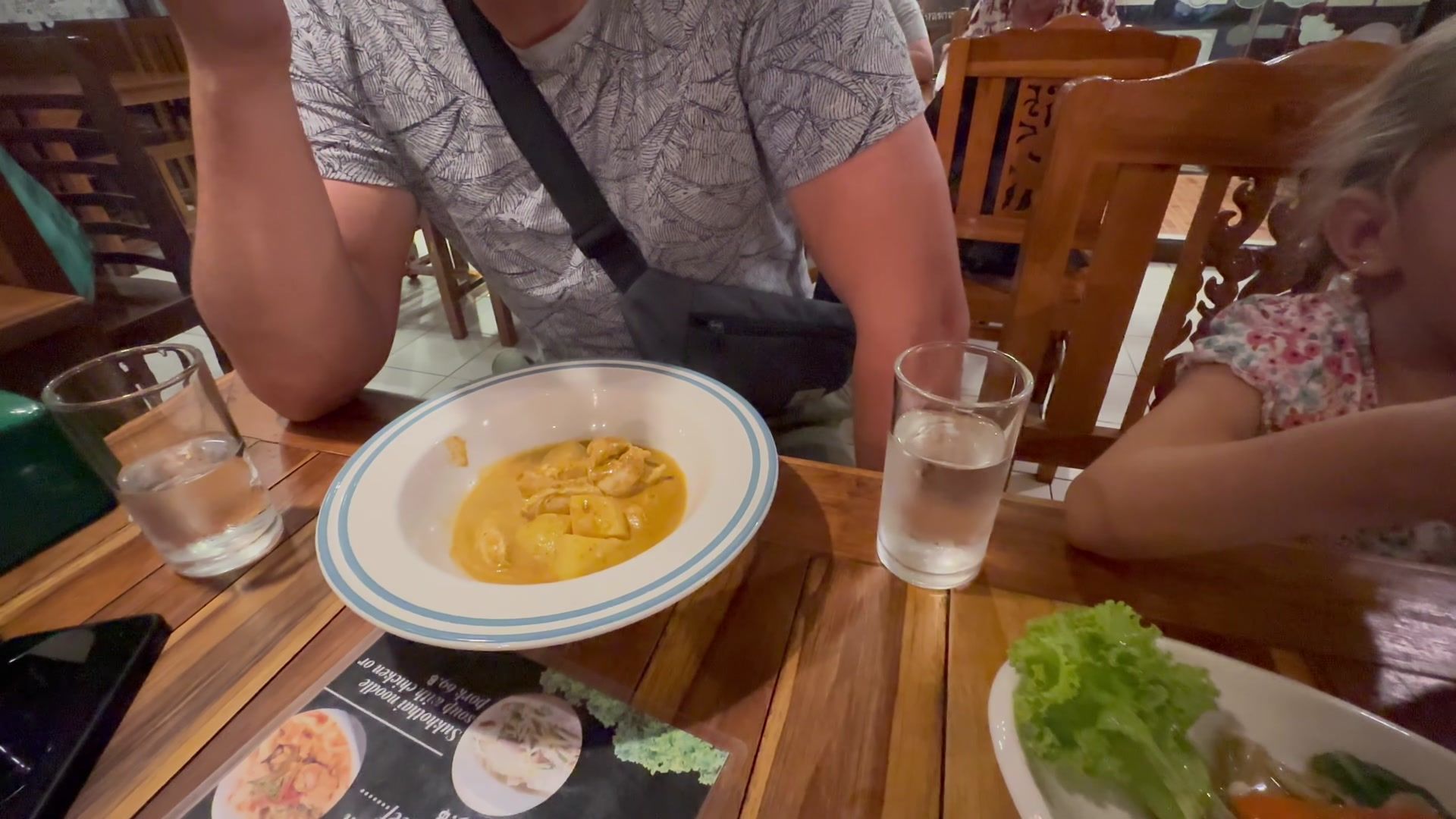 The hotel we stayed at looked quite charming from the outside. It was a bit old, but the pool was clean and the filtration system was working. Instead of going out for dinner, we decided to swim because we hadn’t enjoyed a pool in a long time. Later, we found a lovely restaurant near our hotel that served Thai cuisine. It was stylish and modern. While many places in Phuket close early, this one was among the few that stayed open even after 9 pm. We even learned that it was owned by the same person as our hotel. The prices were reasonable and the portions were large. I ordered chicken with cashews and pineapple. It was lightly fried, soft and delicious. As often seen in Thai cuisine, it had a slightly sweet taste, but it wasn’t overwhelming.