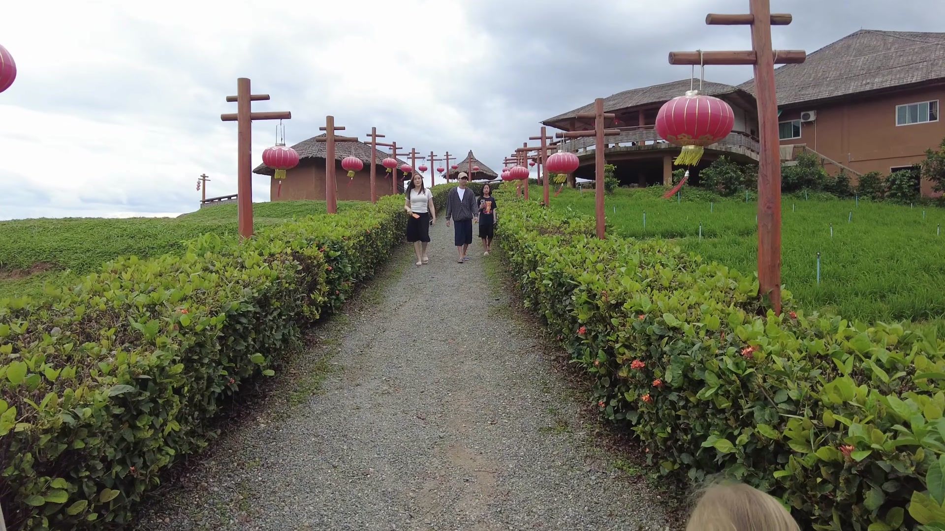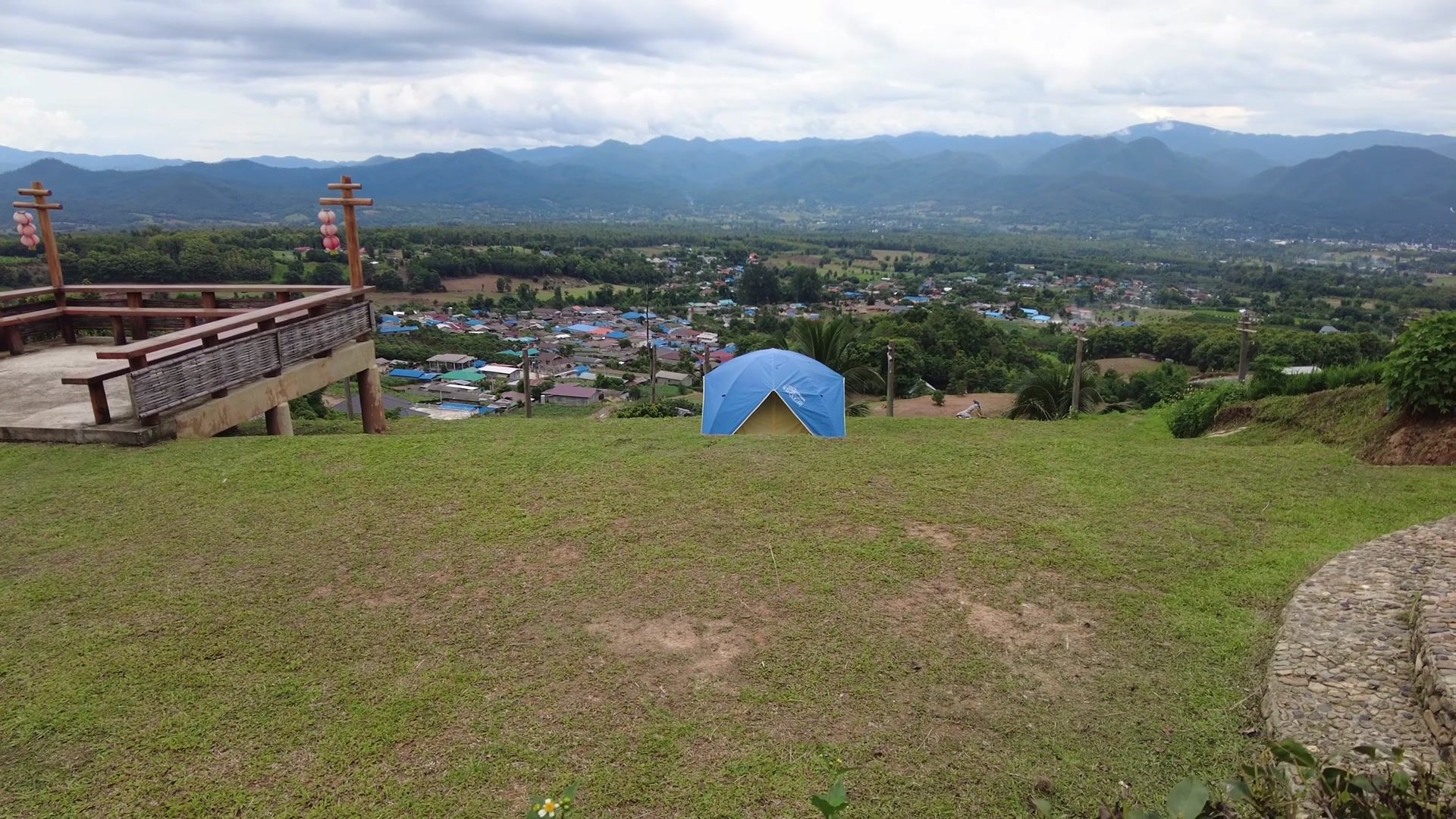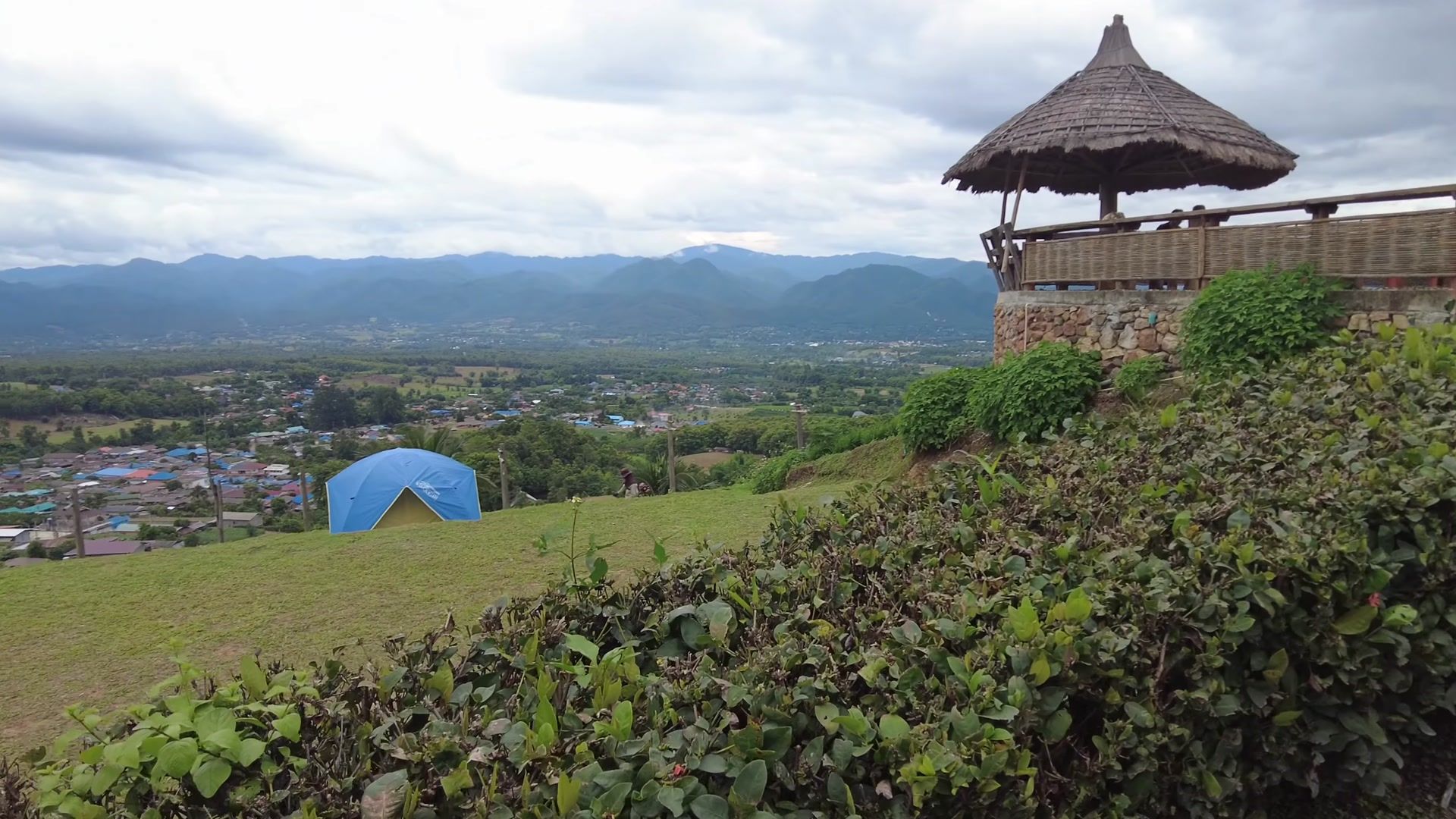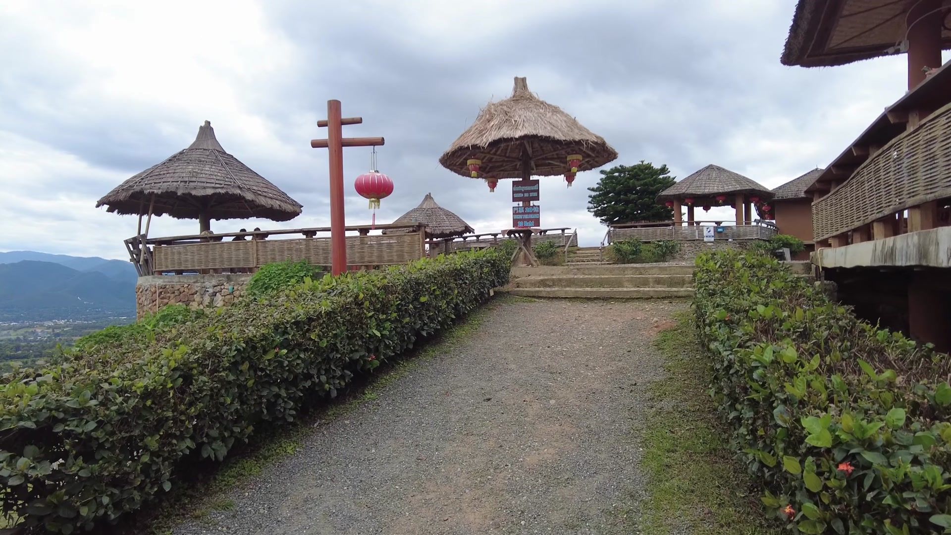 We decided to explore the area. It’s well-maintained, with neatly trimmed lawns. We found a local attraction: a Chinese village. The village is nearby but features houses built in a distinctly Chinese style. It’s only 10-15 minutes from Pai, so very close. There are also a few viewpoints and camping options nearby. Some visitors had come specifically to camp. From above, Pai looks like a small town.