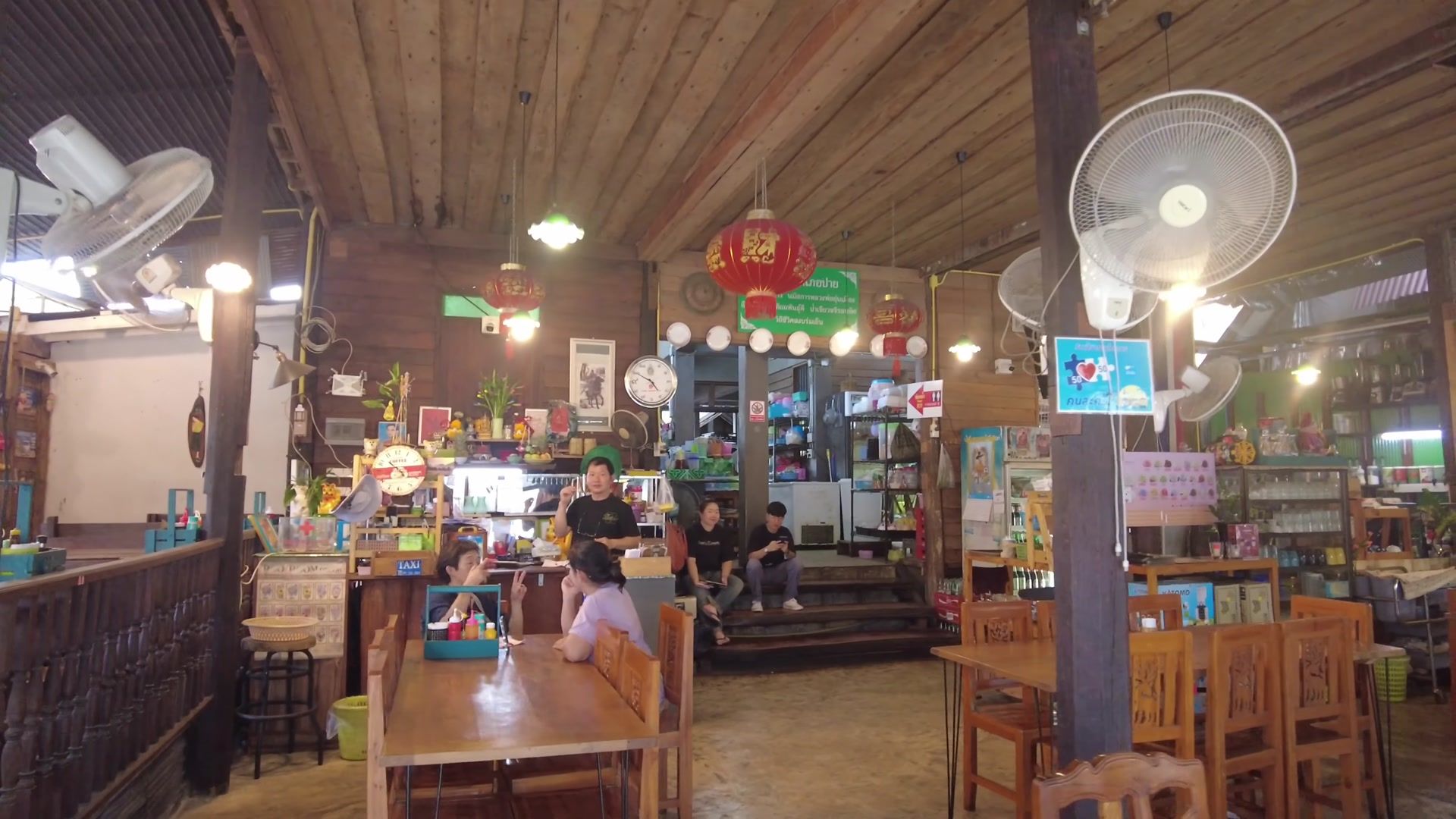 We reached the center of Pai, where there are tourist cafés and shops. You can find burgers and European dishes, but we wanted traditional Thai food. After crossing the mountains, it was surprising to arrive in a town bustling with young people. We found a café serving Thai food. They told us local soup was 30 baht, while the tourist version was 60 baht. I had read that everything in Pai was supposed to be cheap, but overall, it felt fairly normal. Not cheaper than Sukhothai. Prices vary depending on the place.
