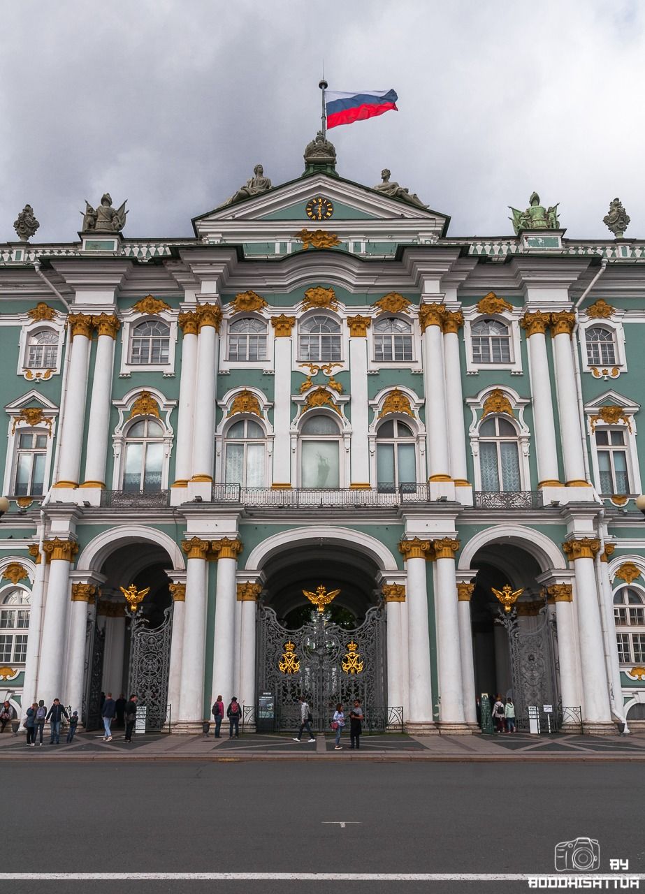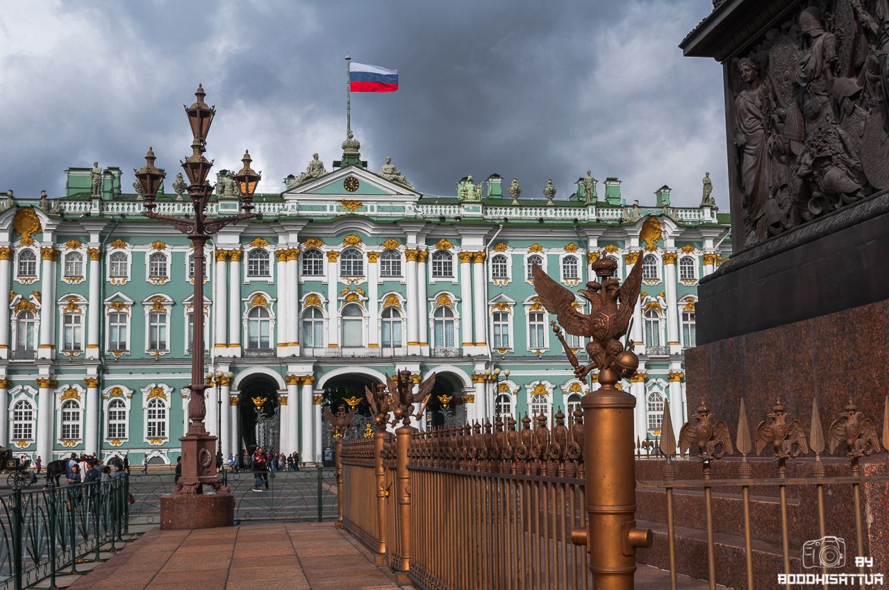 And behind the eagles you can see the central part of the building of the Winter Palace of Russian Emperors. Today, this building houses one of the buildings of the State Hermitage Museum. This place is one of the main places to visit for tourists.