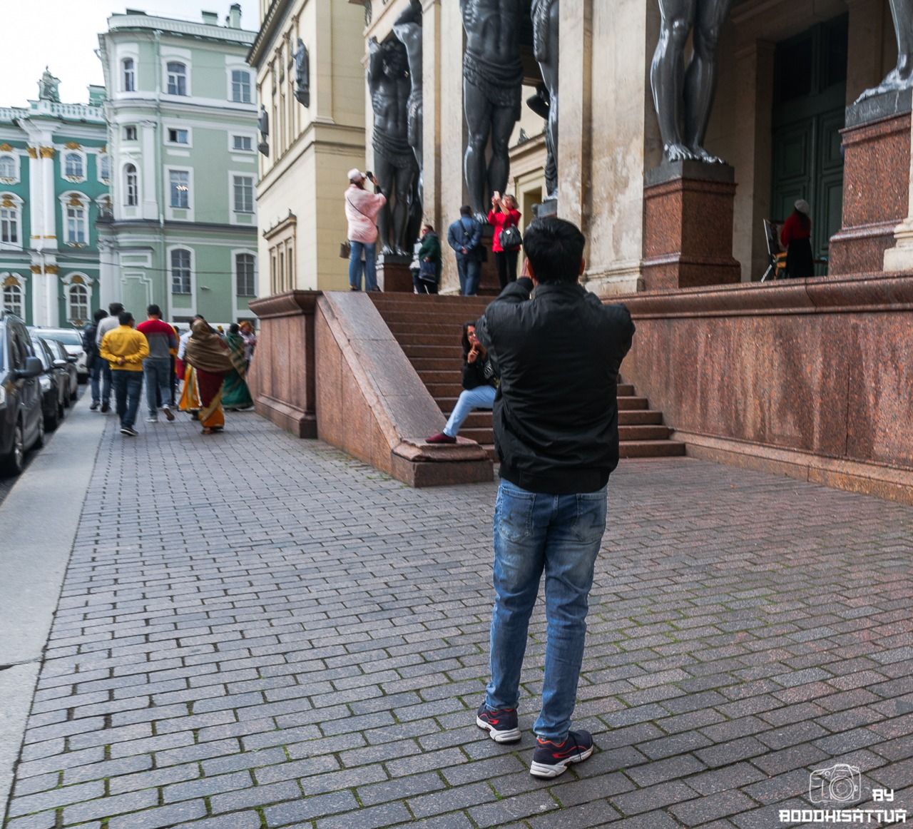 Do you remember what I said, every meter in the center of St. Petersburg can be considered a tourist attraction. So, the building of the New Hermitage turned out to be on my right. And on his porch is another famous attraction. These are Atlantis sculptures that seem to hold the heavy porch roof.