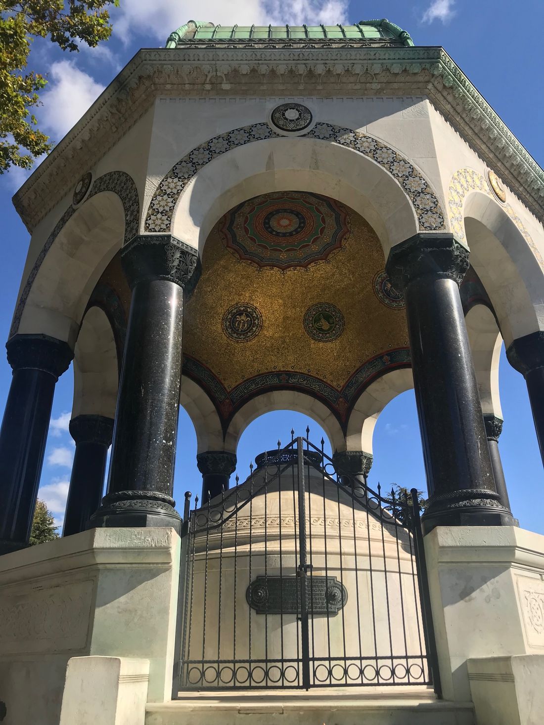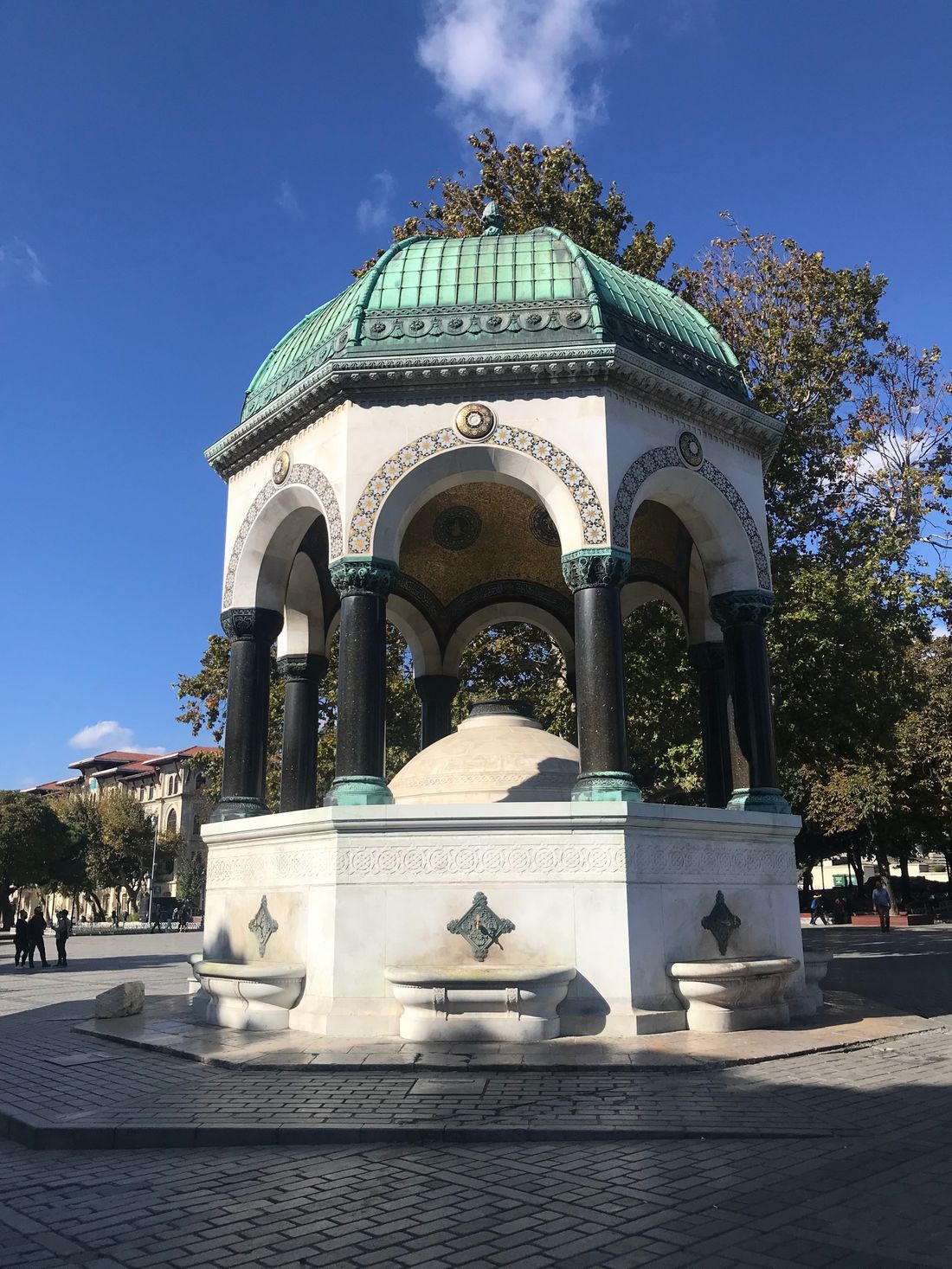 This relatively contemporary domed Fountain, an eight-sided gazebo in a neo-Byzantium style, features marble columns and a bronzed cap. Under this cap resides an elaborately designed golden mural, a fantastic mosaic fitting for an Ottoman capital city.