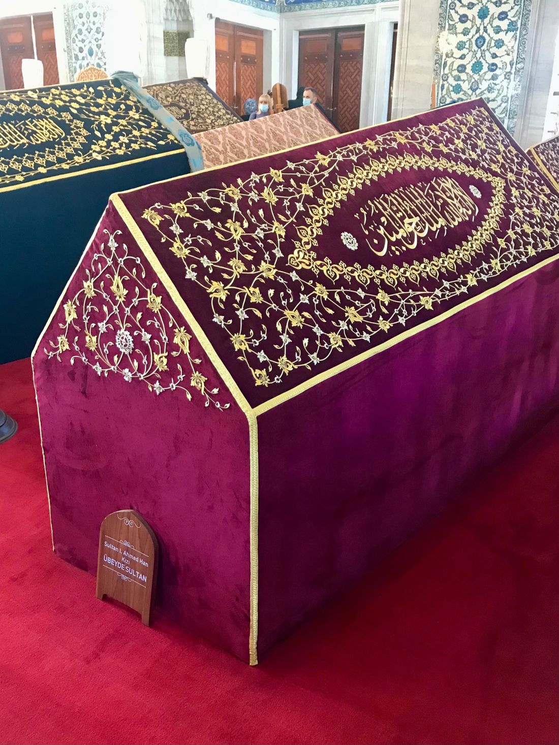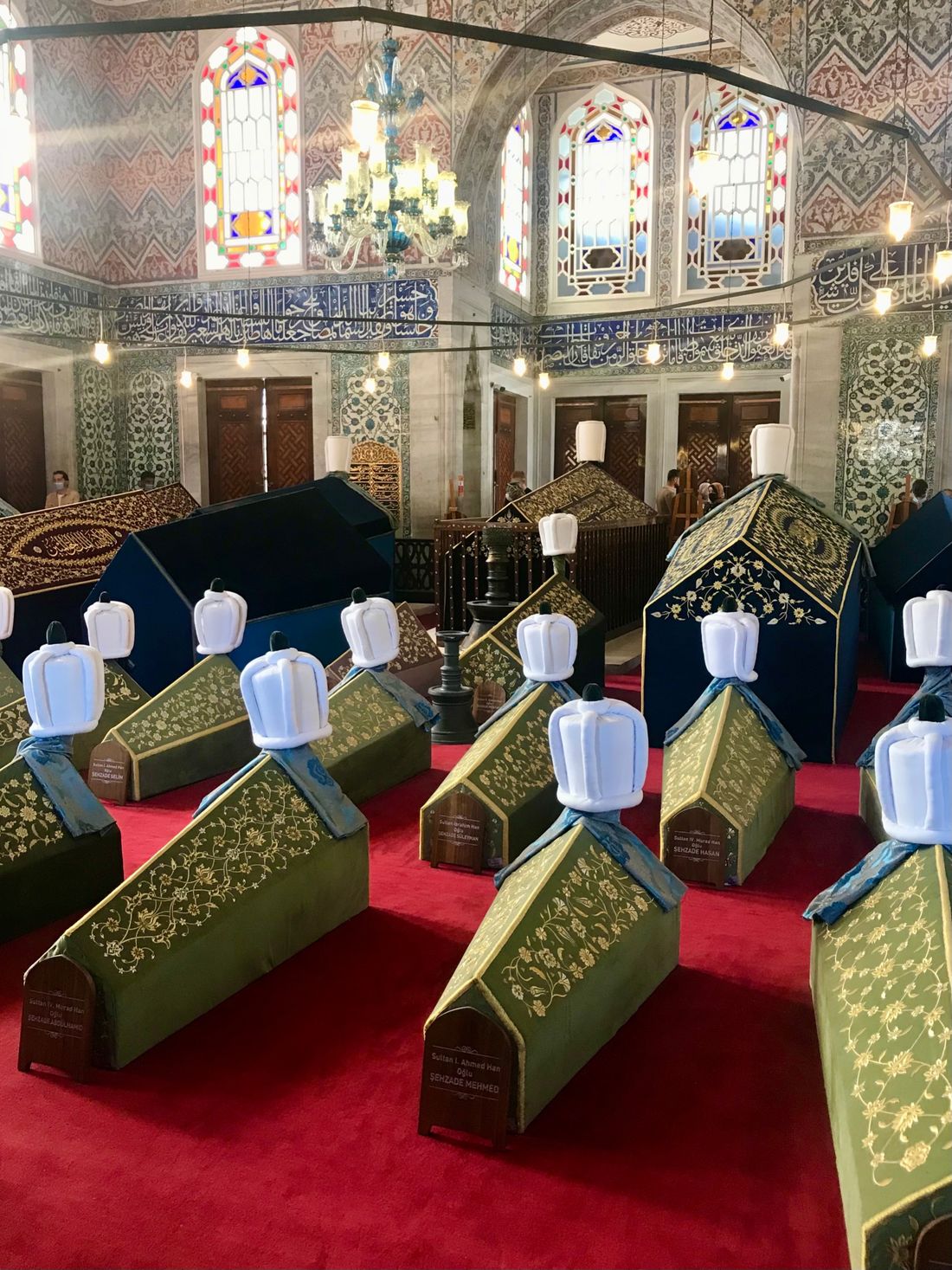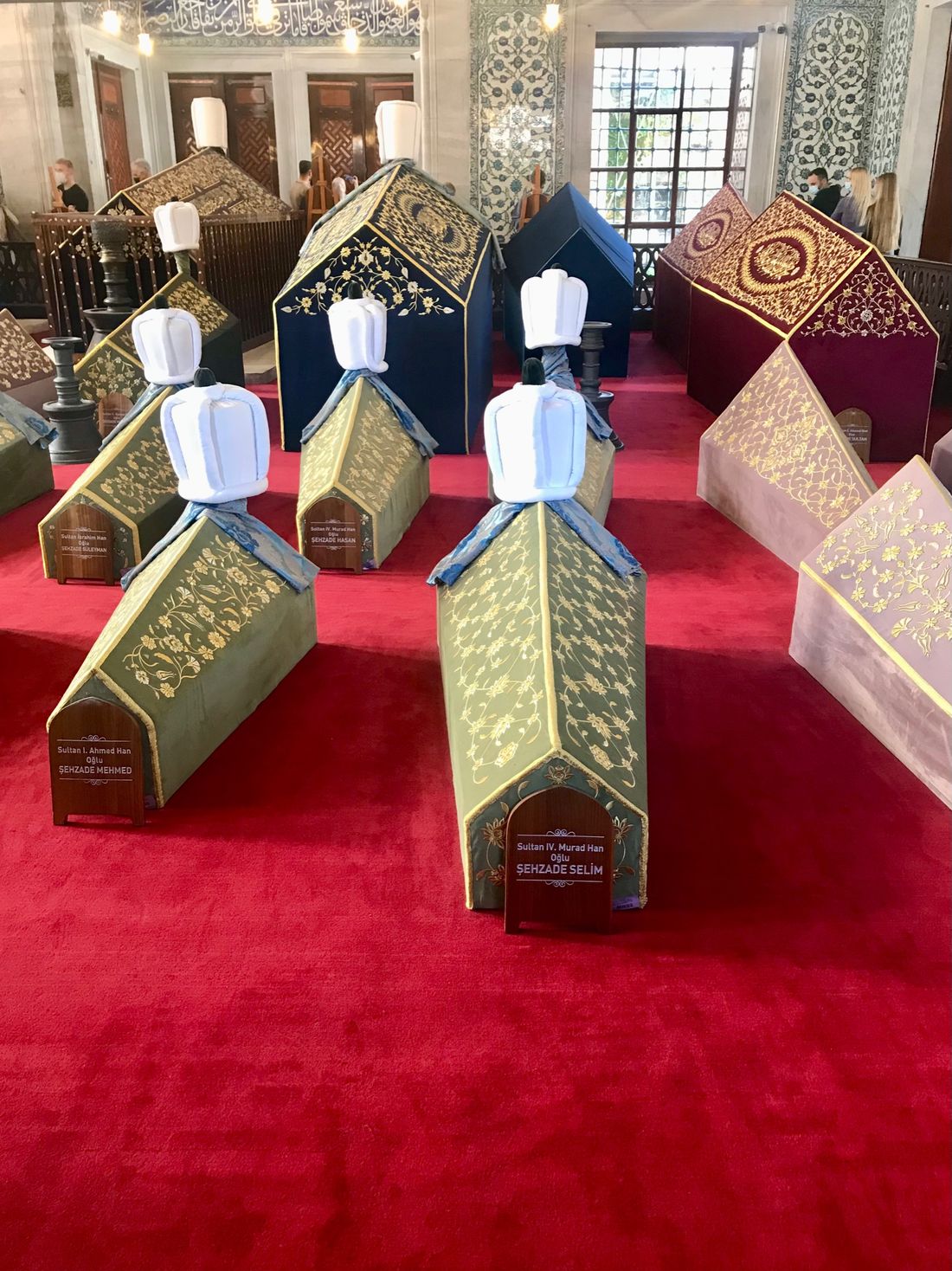As I passed through the wide wooden doors into the mausoleum, I was immediately overwhelmed. There, crowded together, dominating the floorplan, were thirty-six velvet-covered sarcophagi. They ranged in size, with the biggest in the rear. While the largest were clearly the Sultans, the smaller enclosures were likely wives and children of the Ottoman Emperors.