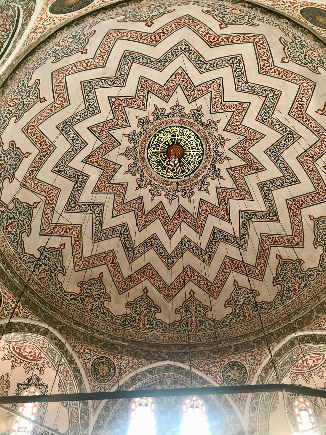 And the dome itself returns to the awning-striped tile pattern set above Arabic Arch insets. At the center of all this is a ring of gold Arabic inscription.