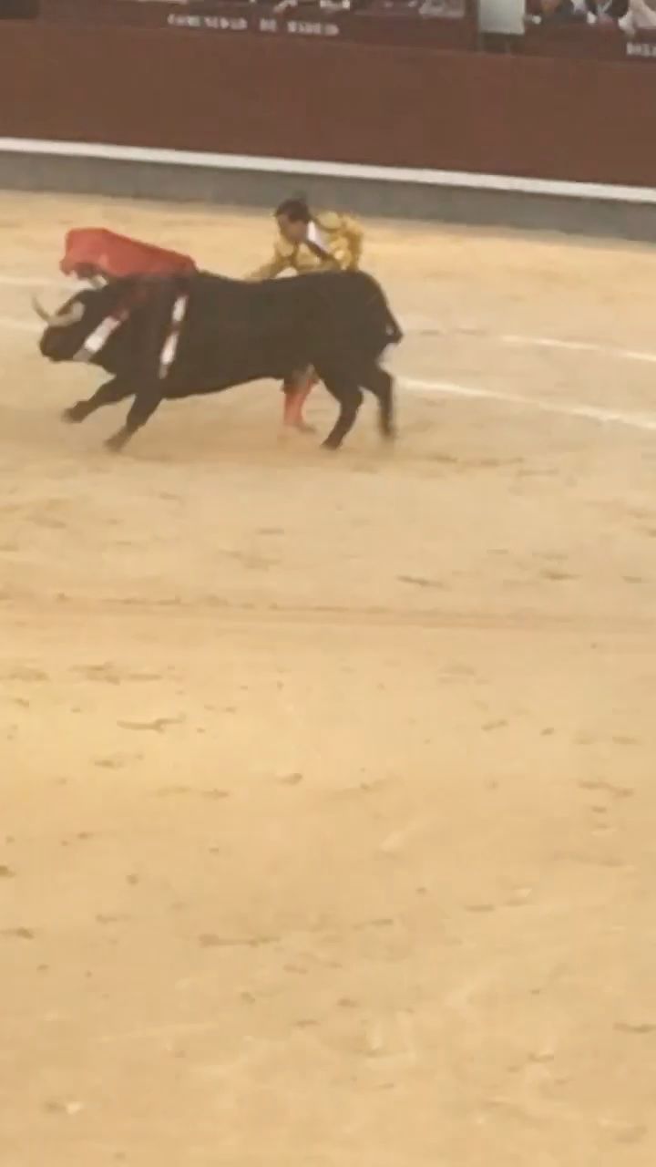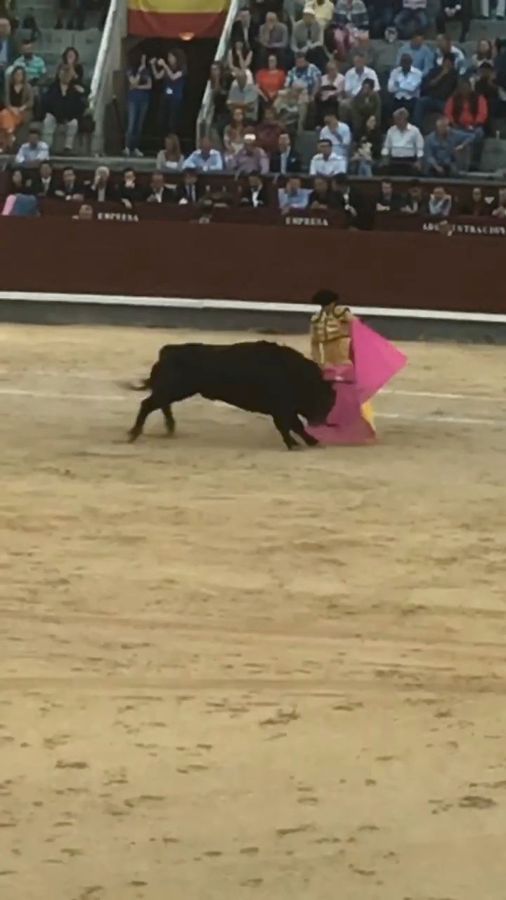 After ten minutes of passes and a lot of grandstanding, the Matador raised his sword, ran at the bull, and hoisted the sword up over the bull's horns, driving the blade down into his neck just behind the head.