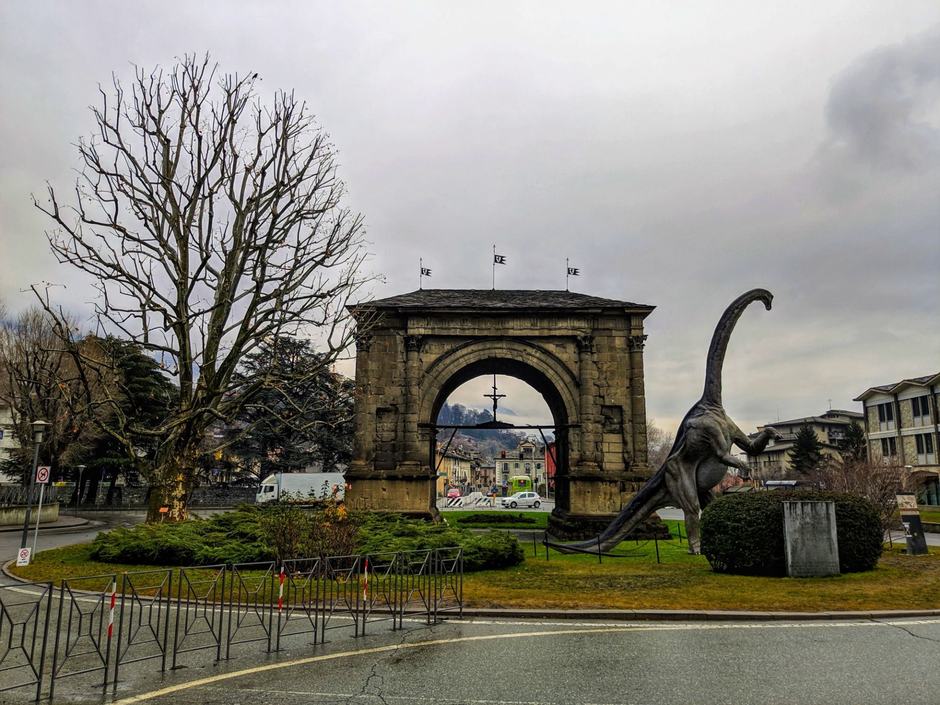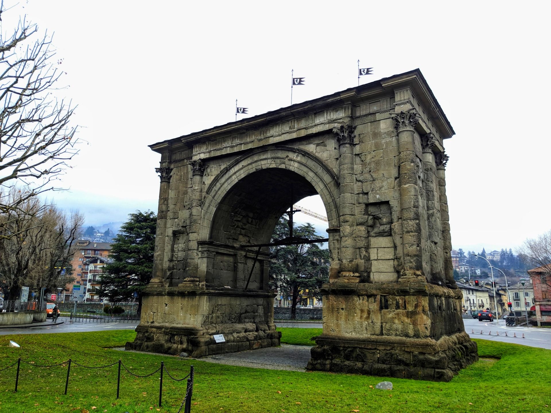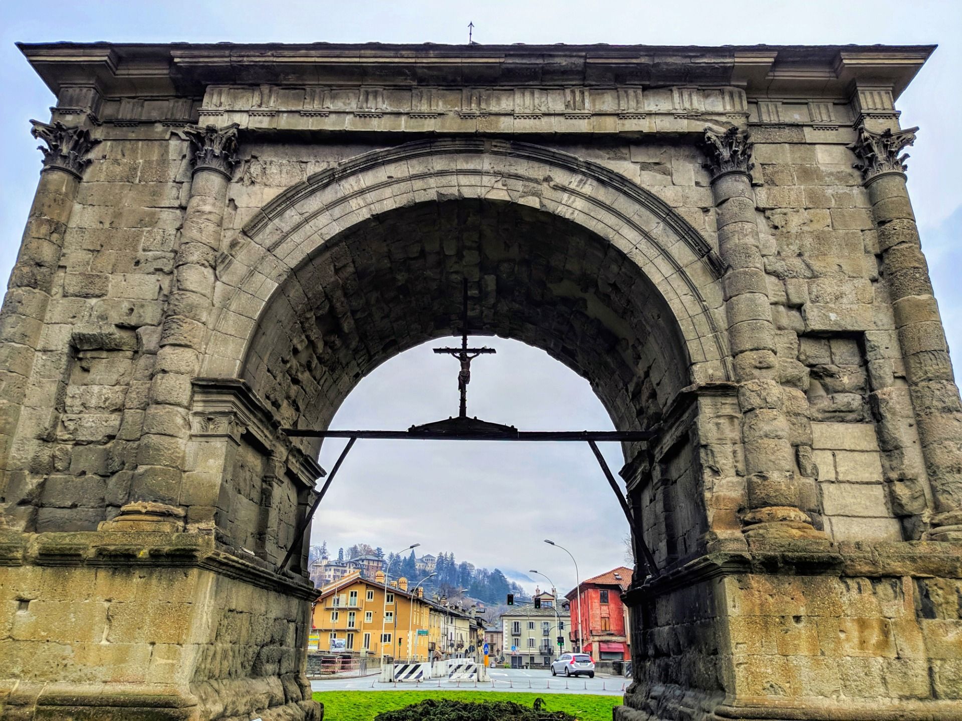 The statue you see in the pictures is located in Arco d'Augusto Square in Aosta, which takes its name from the same monument dating back to 25 B.C. and restored for the most part in 1912. The crucifix that you see under the vault is a copy of the one that in 1449 was placed there as a votive offering against the overflowing of the Buthier torrent, which flows next to it, the original one is kept in the Treasure Museum of the Aosta Cathedral.