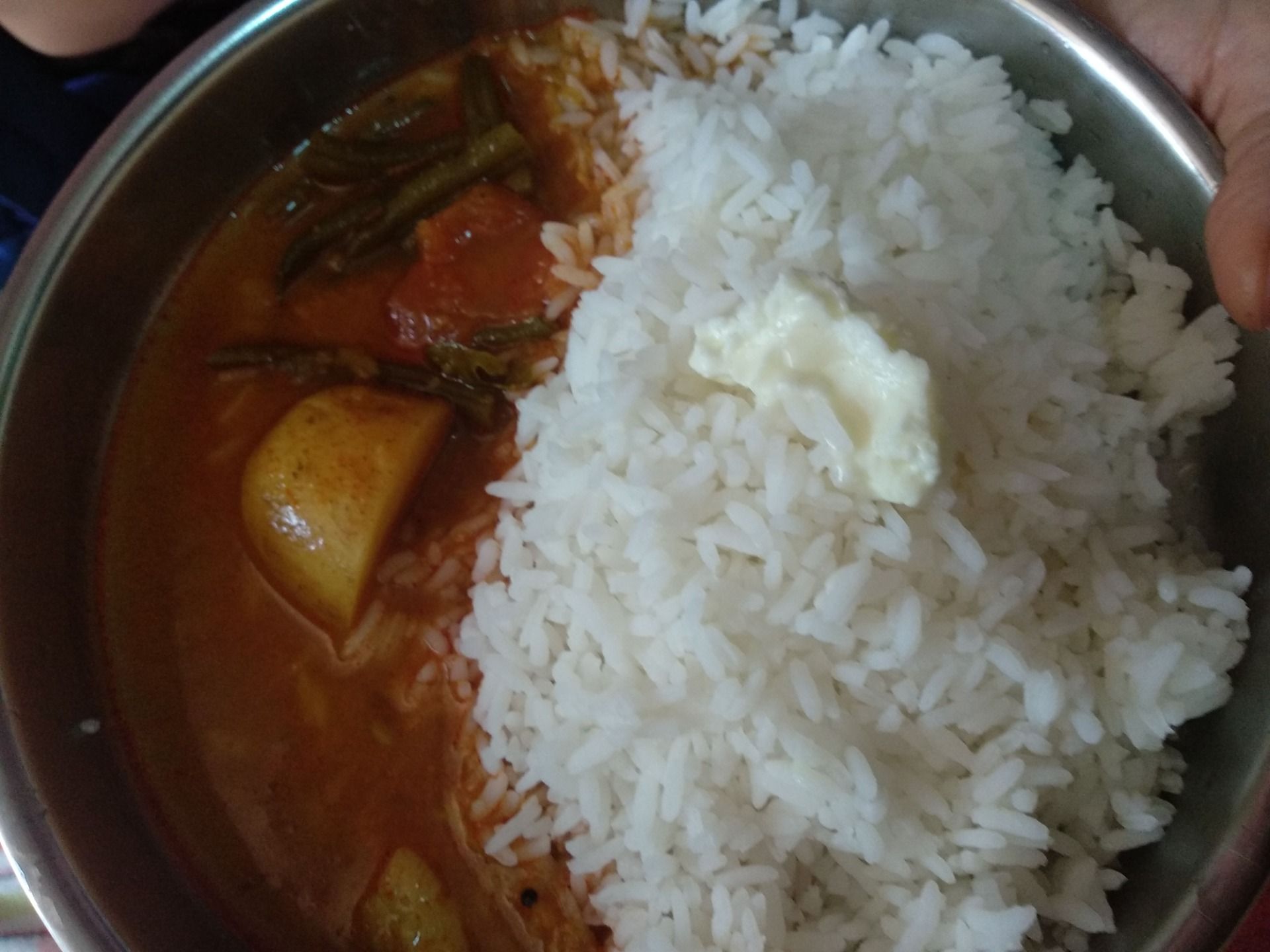 She was back from an exhibition at Chennai and had all the things in the car. We were in her house to take a look at the materials and she insisted on having lunch. By now, it was already past lunchtime and we agreed to it. She brought some rice, a potato curry and some butter in the middle.