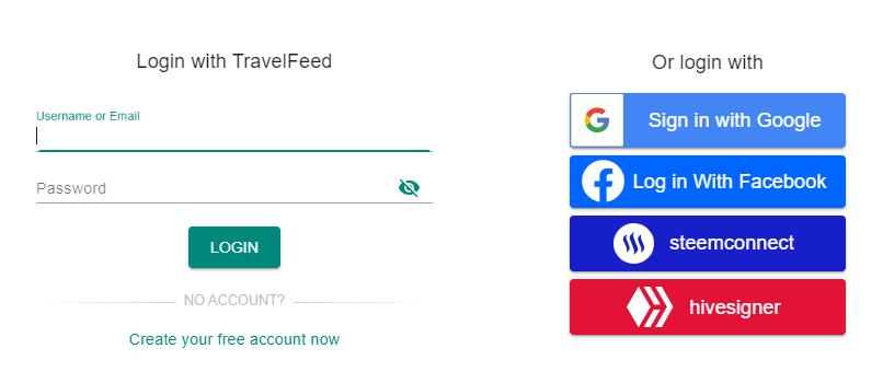 - Dirígite a la web TravelFeed.io e inicia sesión con tus credenciales de Gmail, Facebook, Steem o Hive.