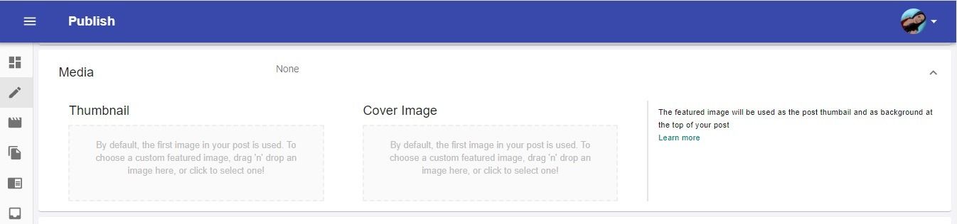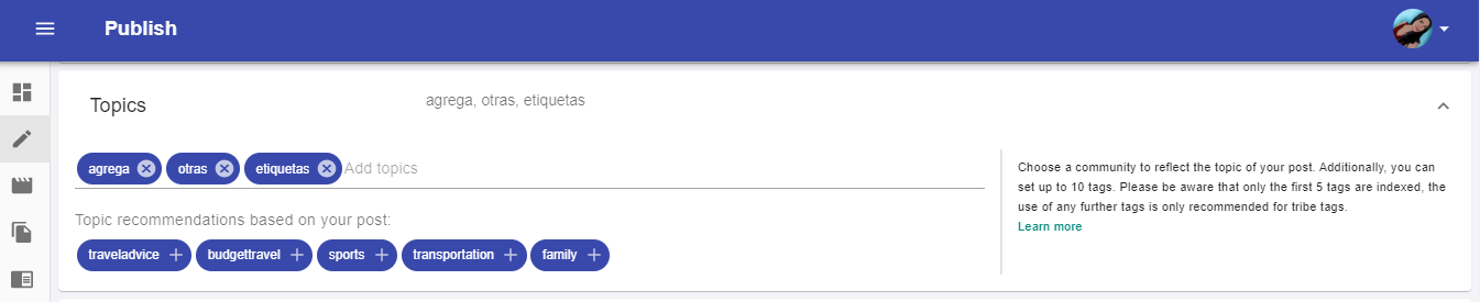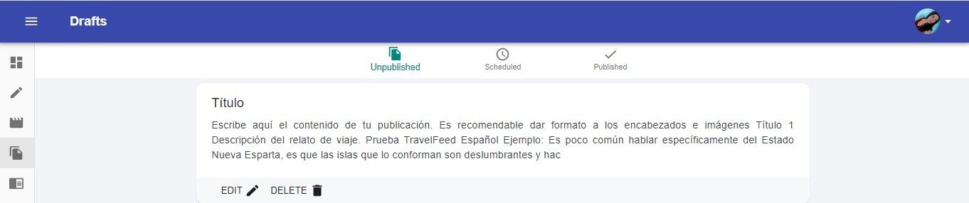Nota: Cuando comienzas a cargar una publicación, los cambios se guardan automáticamente. Para chequear y editar los avances, haz click en el cuarto icono del panel izquierdo.