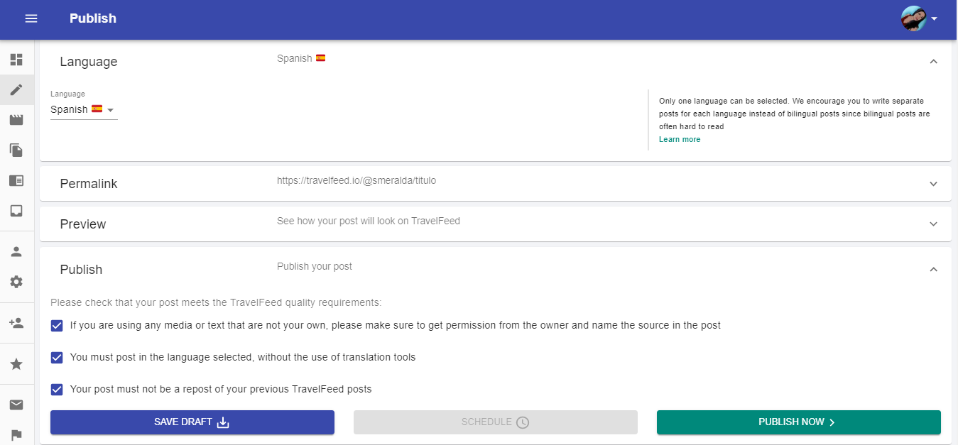 i) Publish (Publicar): El sistema te indicará si falta por cumplir algún requerimiento, además debes marcar 3 casillas adicionales referentes a no incumplir derechos de autor, asegurar que el idioma escrito y el seleccionado corresponden y además que el post no ha sido publicado previamente en Travelfeed.