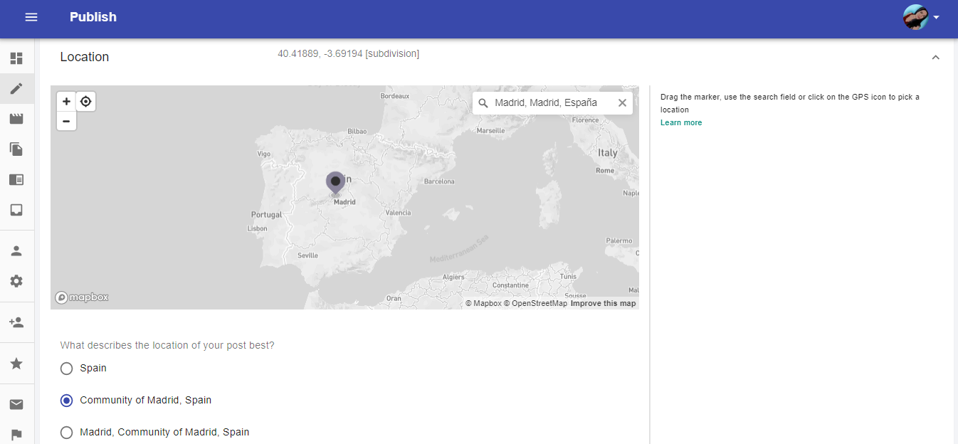 d) Location (Ubicación): Busca y selecciona en el mapa la ubicación del lugar que presentas en tu post.