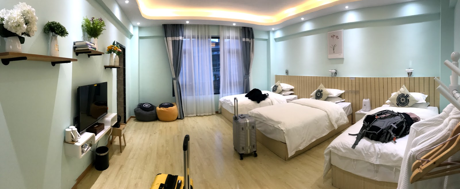 The hotel is very clean and beautiful , below is our room, although there are three bed , but actually , just 2 people living in this room, other three guys live in another triple room.