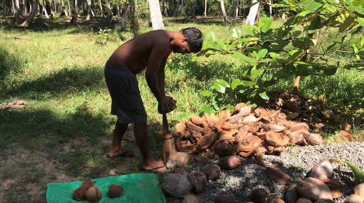 Every week Omal will ask some worker to pick coconuts on trees, some collected here .