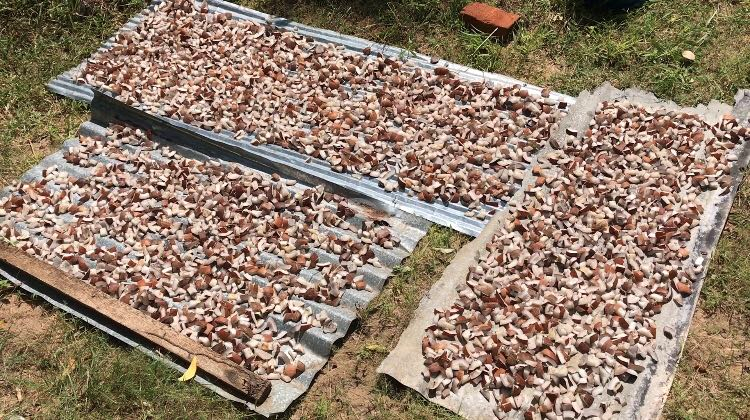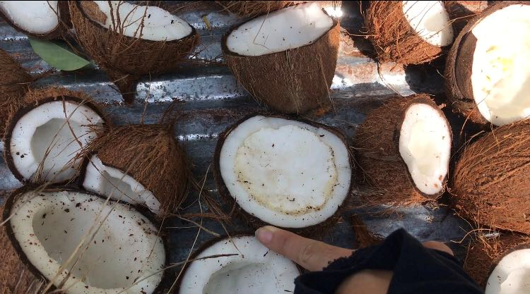 After remove the shells , we need to open the coconut , cut in half, and dry them , them they will turn out the coconut oil , seems our skin , more dry more oil .
