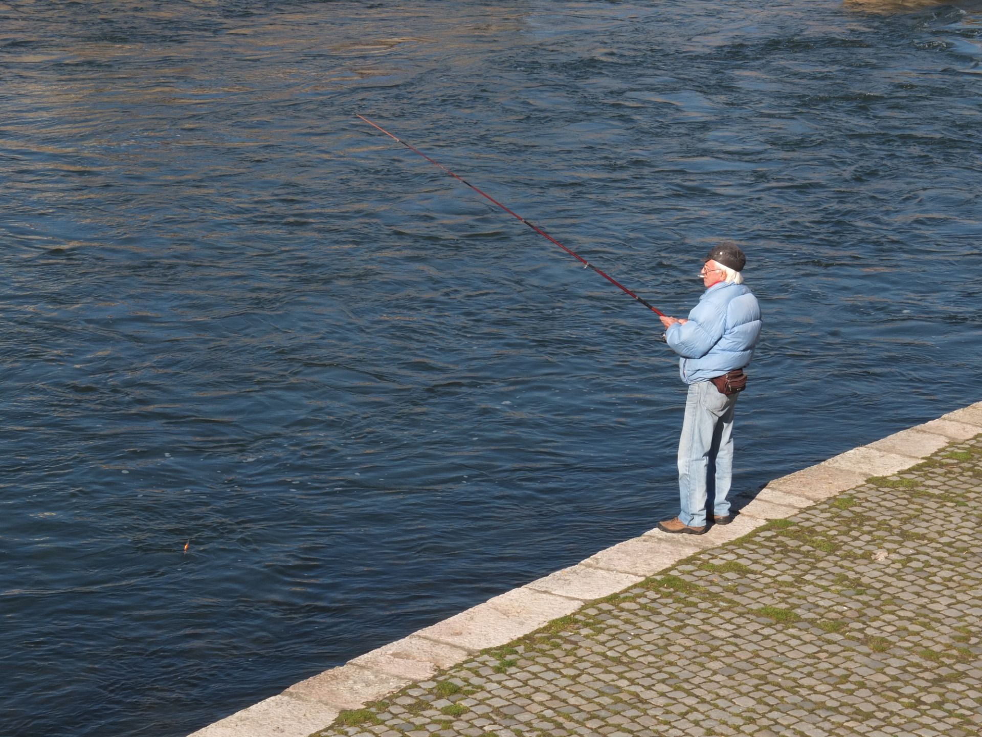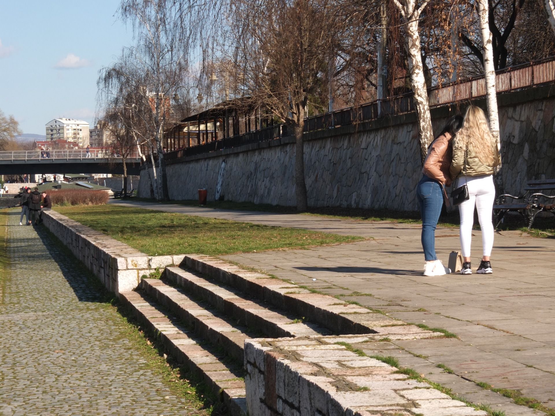 On the sunny day like today, everybody who has time to venture outside is enjoying themselves. Some are walking dogs, other are trying to catch some fish. Girls are posing next to the river as if it would be a beach.